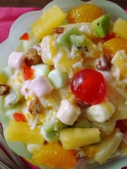 - In a large salad bowl, place mandarins, pineapple, kiwi, cherries, coconut, marshmallows and pecans in a bowl. Combine by gently tossing with a large spoon.