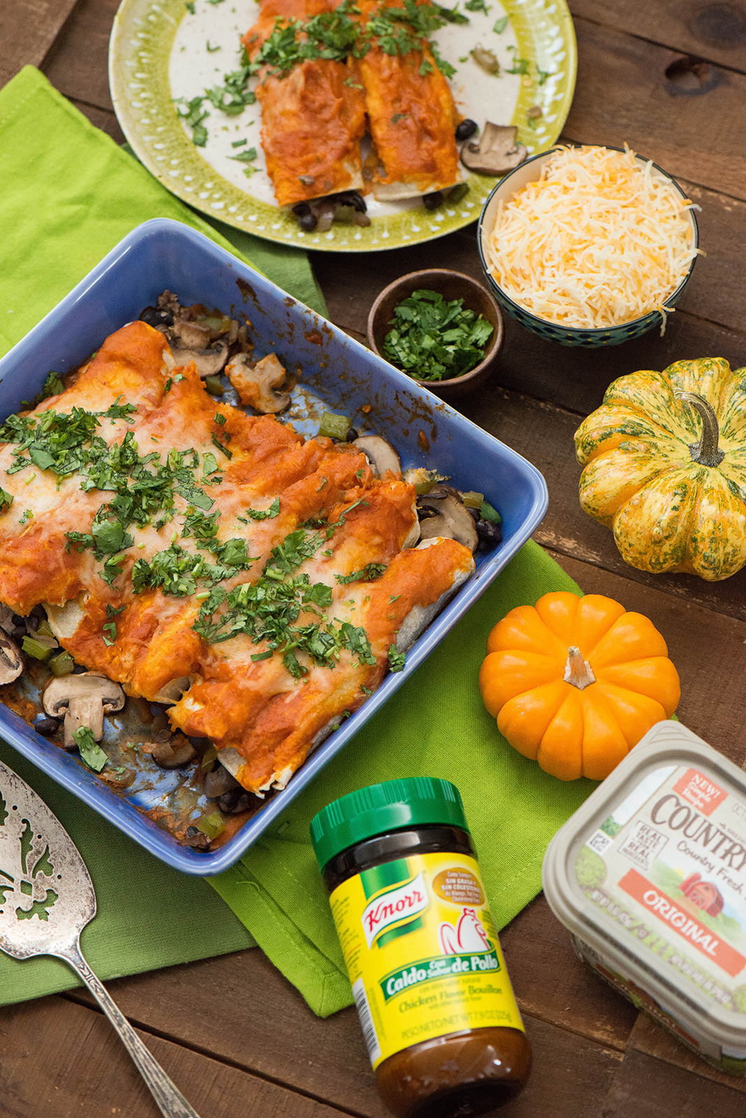 I’m not quite ready to indulge in pumpkin pie just yet but I am ready to make a smoky-sweet sauce to coat my veggie-stuffed corn tortillas. My inspiration was Vive Mejor’s Chipotle Chicken Enchiladas featuring Knorr Chicken Flavor Bouillon and Country Crock Spread. Instead of using the Alfredo sauce the recipe calls for, I decided to go ahead and make my own sauce with an autumn twist. A medley of vegetables replaced the chicken and I topped it with shredded cheese and a sprinkle of fresh cilantro.