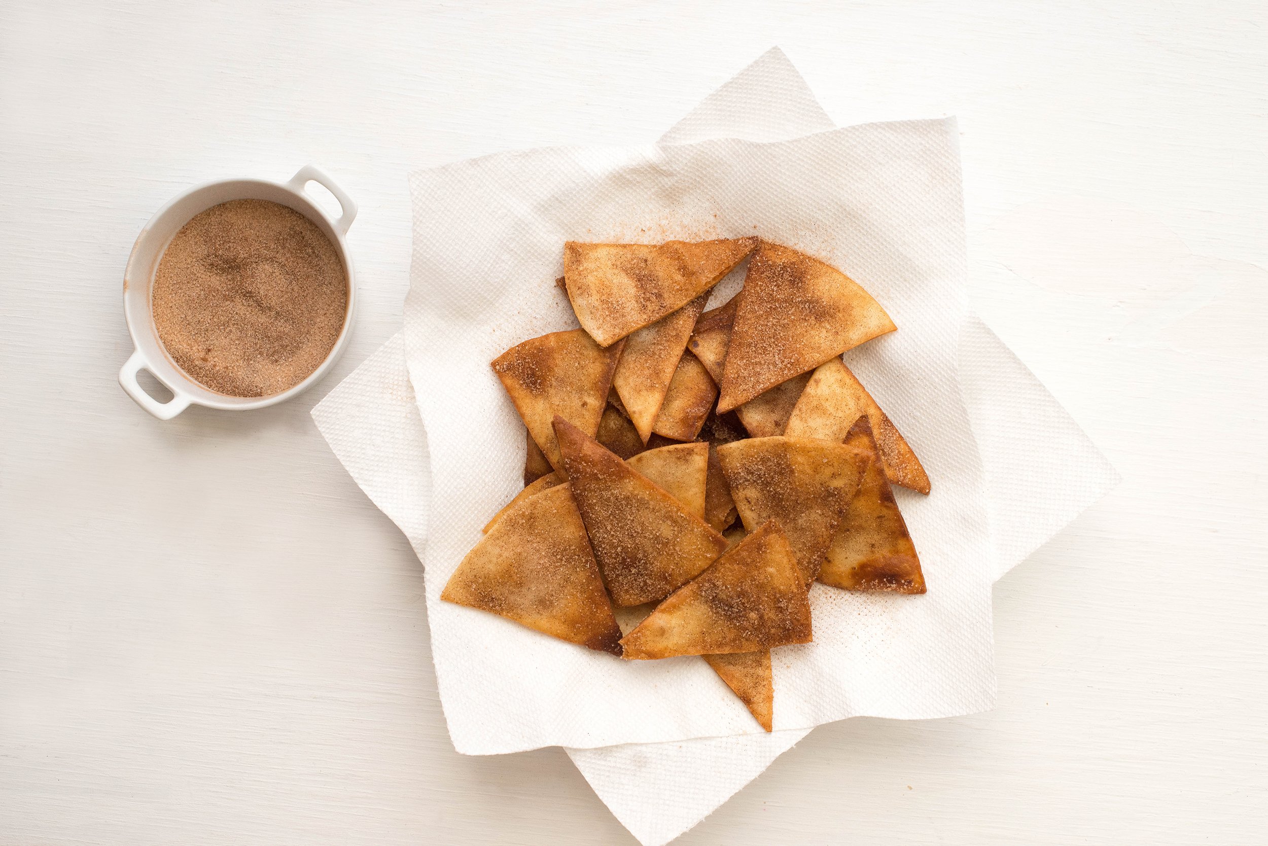 - Heat oil in a medium skillet to 350° F. Fry tortilla triangles 3-4 at a time, turning once, until golden brown. Drain on paper towel-lined plate. Sprinkle fried tortilla triangles with cinnamon-sugar.