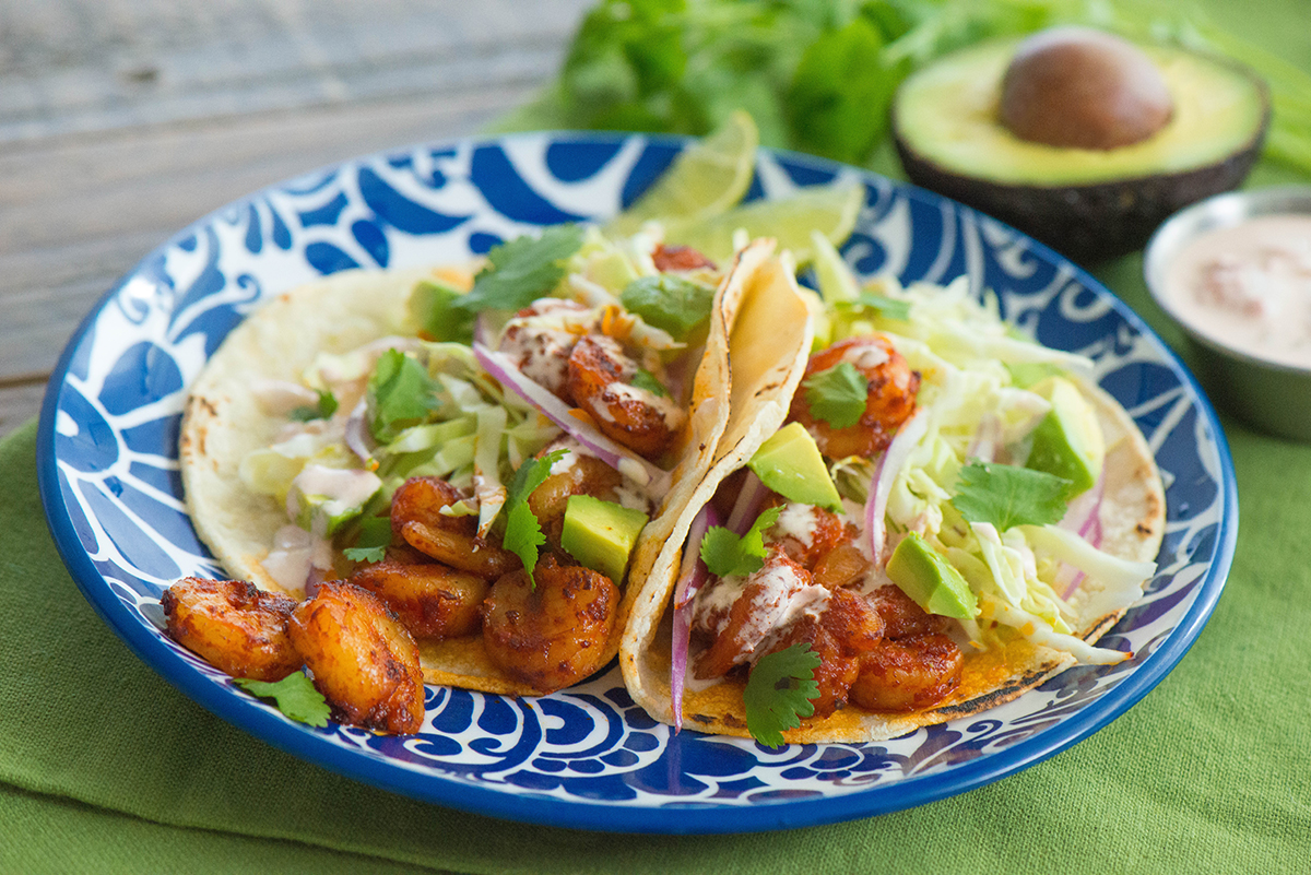 - Serve shrimp in warmed tortillas. Top with creamy salsa and desired toppings, such as shredded cabbage or lettuce, chopped avocado, tomatoes and fresh cilantro, and lime wedges.
