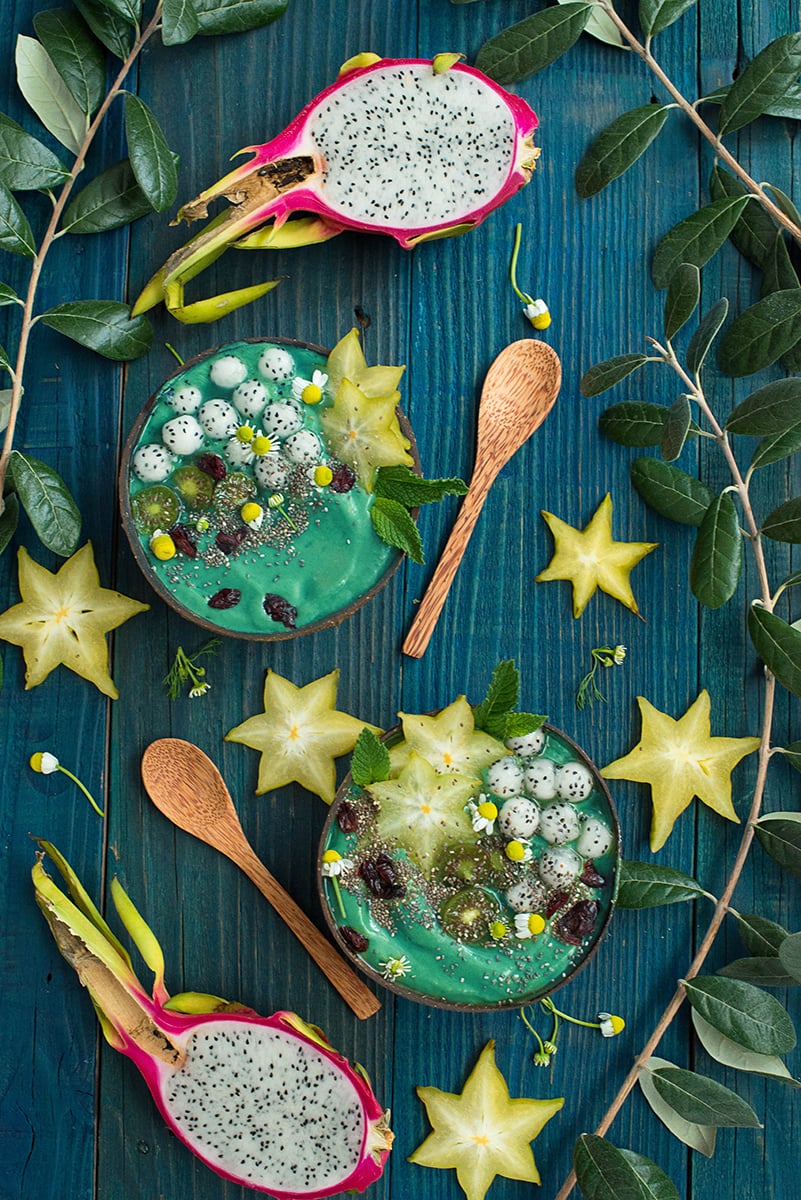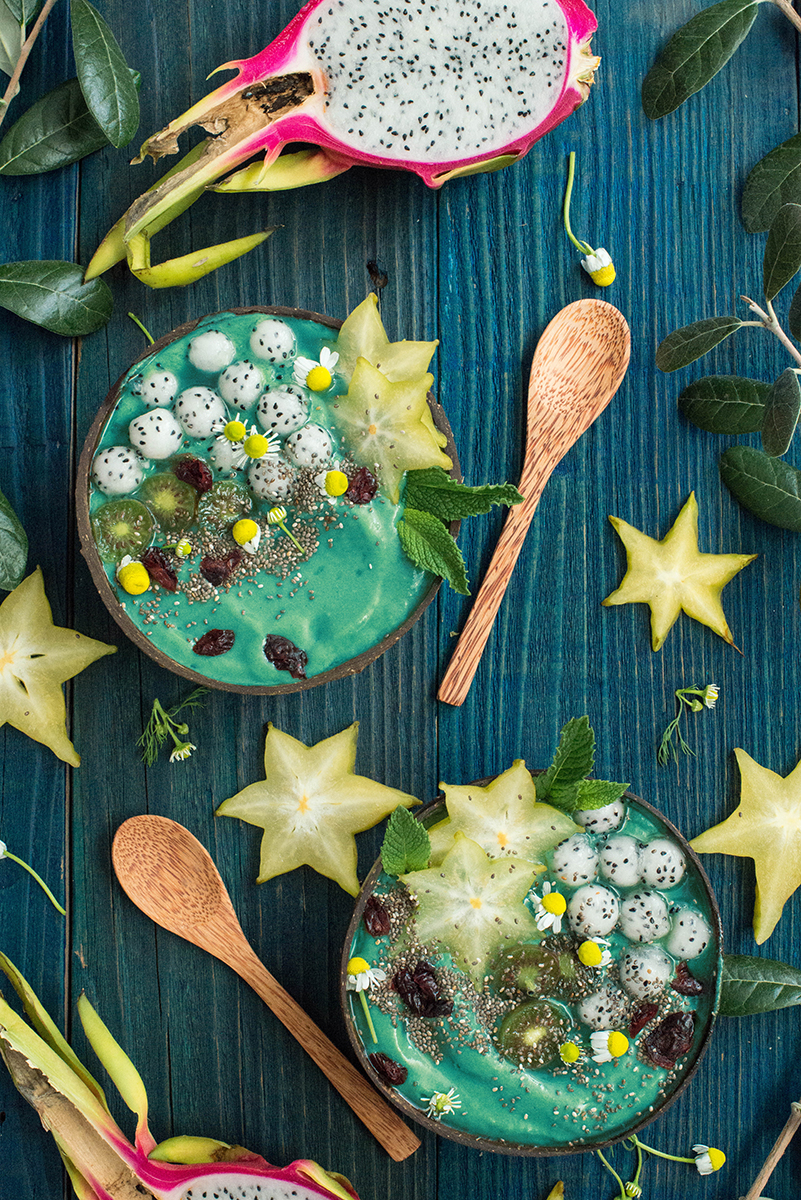 Because we loved our welcome breakfast at twilight, I decided to create a meal the Na’vi would enjoy. I used beautiful, exotic fruits, seeds and other healthy ingredients. The Na’vi diet is strictly plant-based so I kept the ingredients strictly vegan and healthy. You can customize the toppings with seasonal fresh fruit or your favorite dried fruit, nuts and seeds. I was able to find star fruit, dragon fruit and fresh chamomile at my local market. It made the bowl look exotic and literally out of this world. The spirulina powder gave it that beautiful greenish-blue color that almost looks alien-like. The flavor is light, juicy and sweet from the frozen banana included in the blend. No added sugar! It’s a great breakfast, dessert or snack treat and the kids will love it.