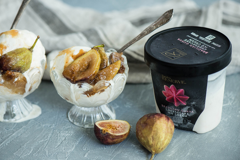 Not just any ice cream. I headed to my nearest Albertsons and decided to try their new Signature Reserve™ Super Premium Ice Cream. With flavors like Brazilian Guava Cheesecake and Madagascar Vanilla Bean who can resist? I was very excited to try them and top them with syrupy caramelized figs with vanilla. A combination I had been dreaming about these last few days.