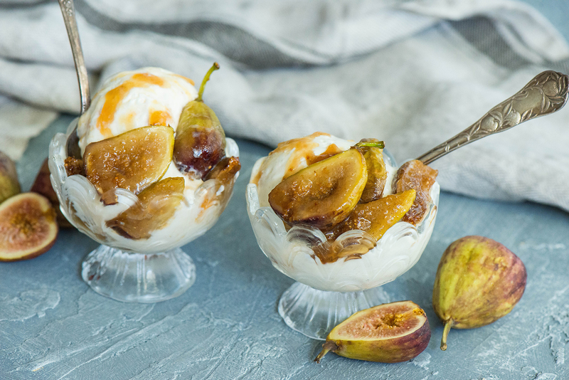 Vanilla bean ice cream can be topped with just about anything. I decided to highlight its flavor by caramelizing some delicious figs in a honey vanilla syrup. The result was incredible! The topping can be prepared in under 10 minutes.
