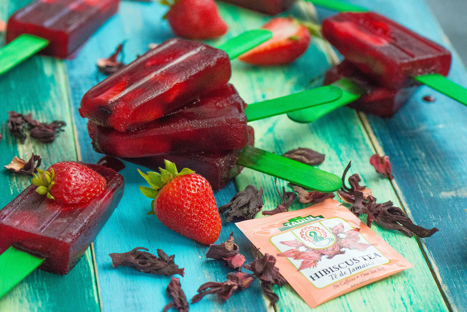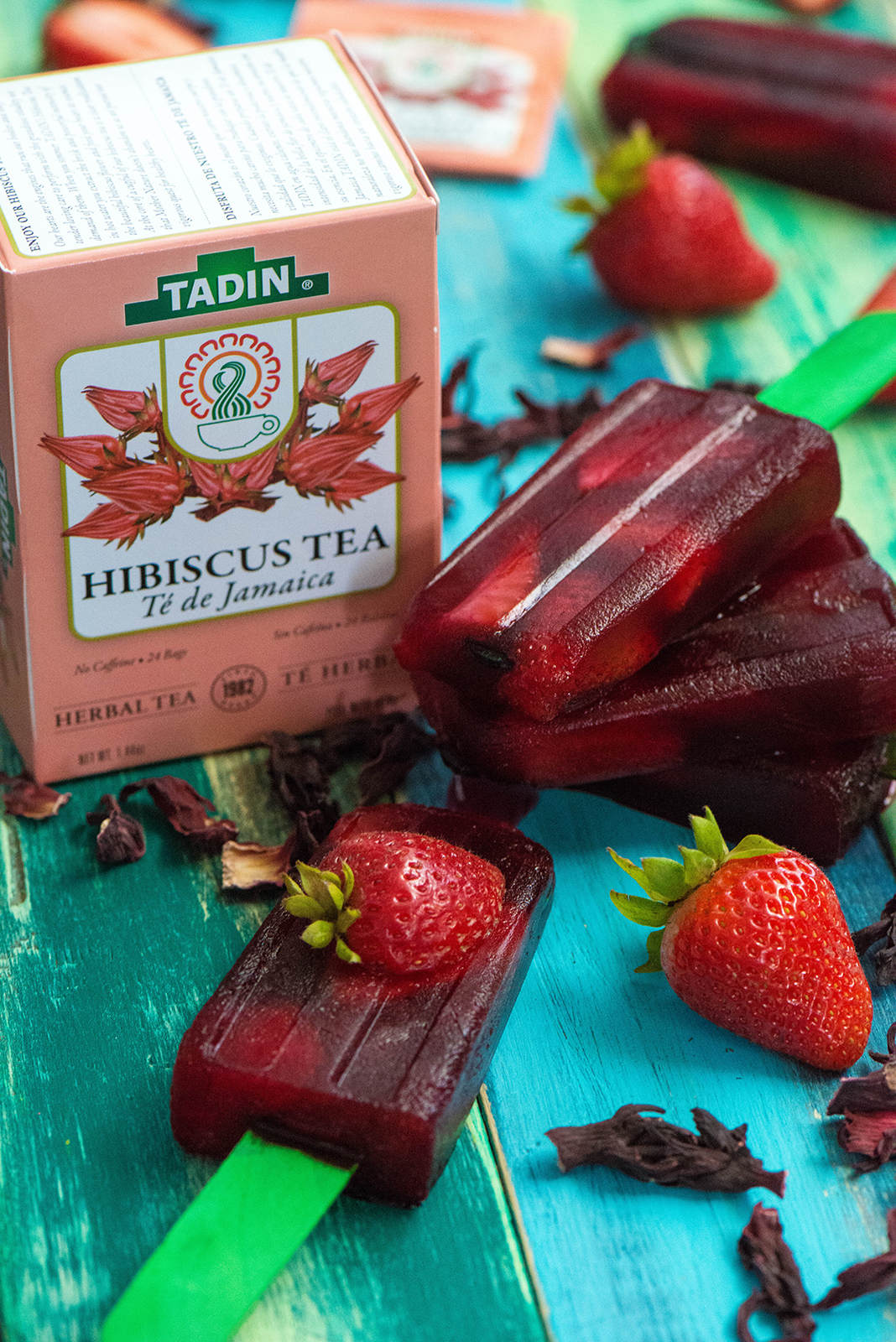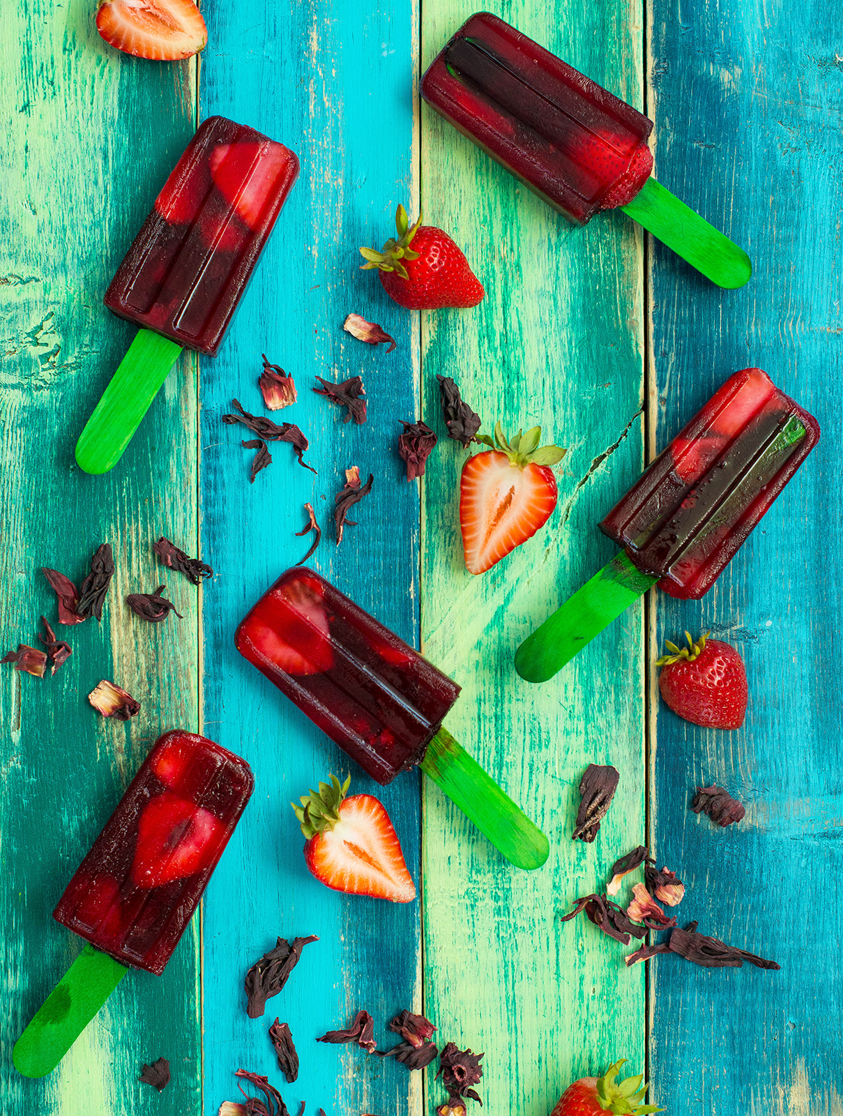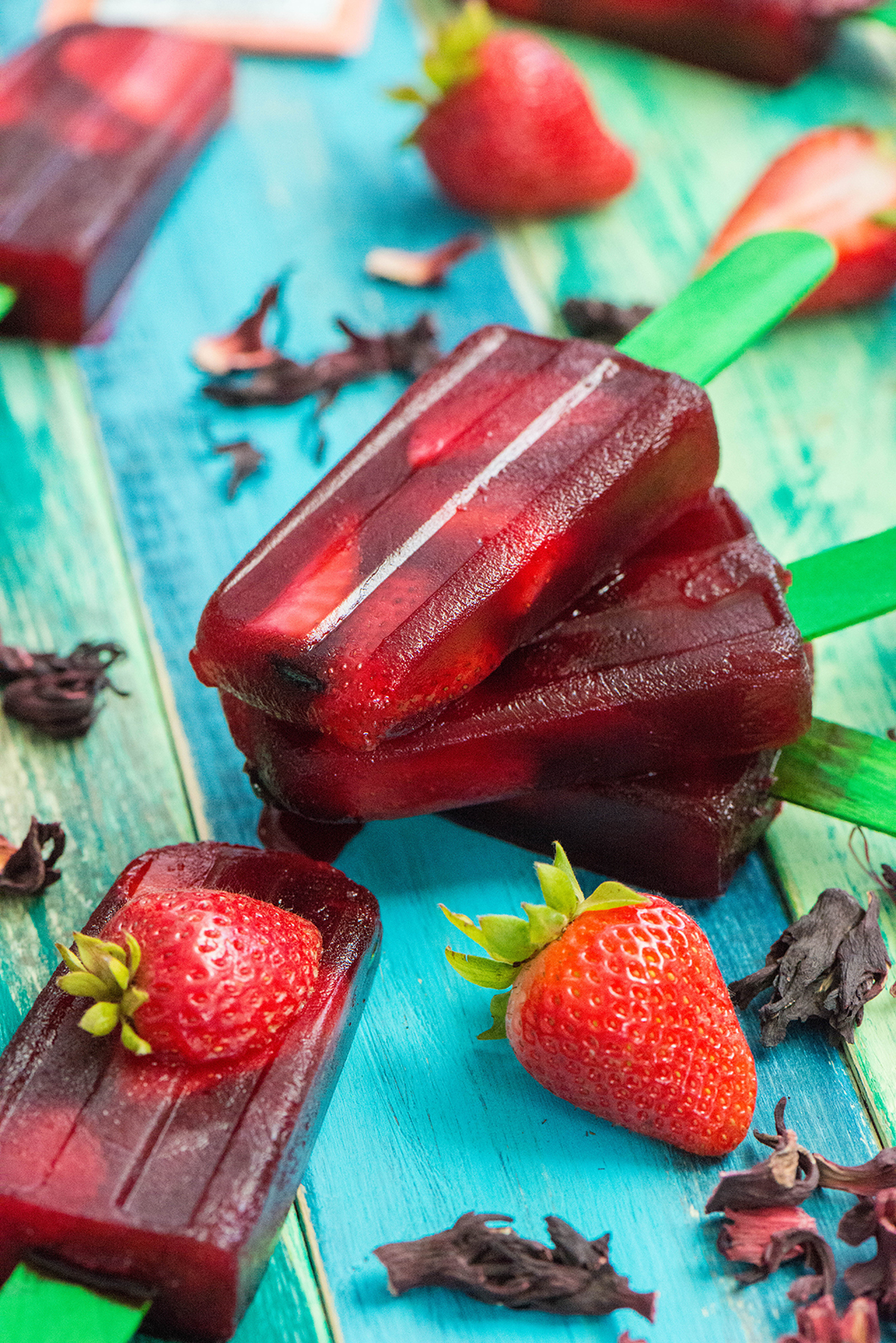 - Place once sliced strawberry in each popsicle mold. Pour in hibiscus tea mixture. Insert popsicle sticks and chill for 4 hours to overnight.