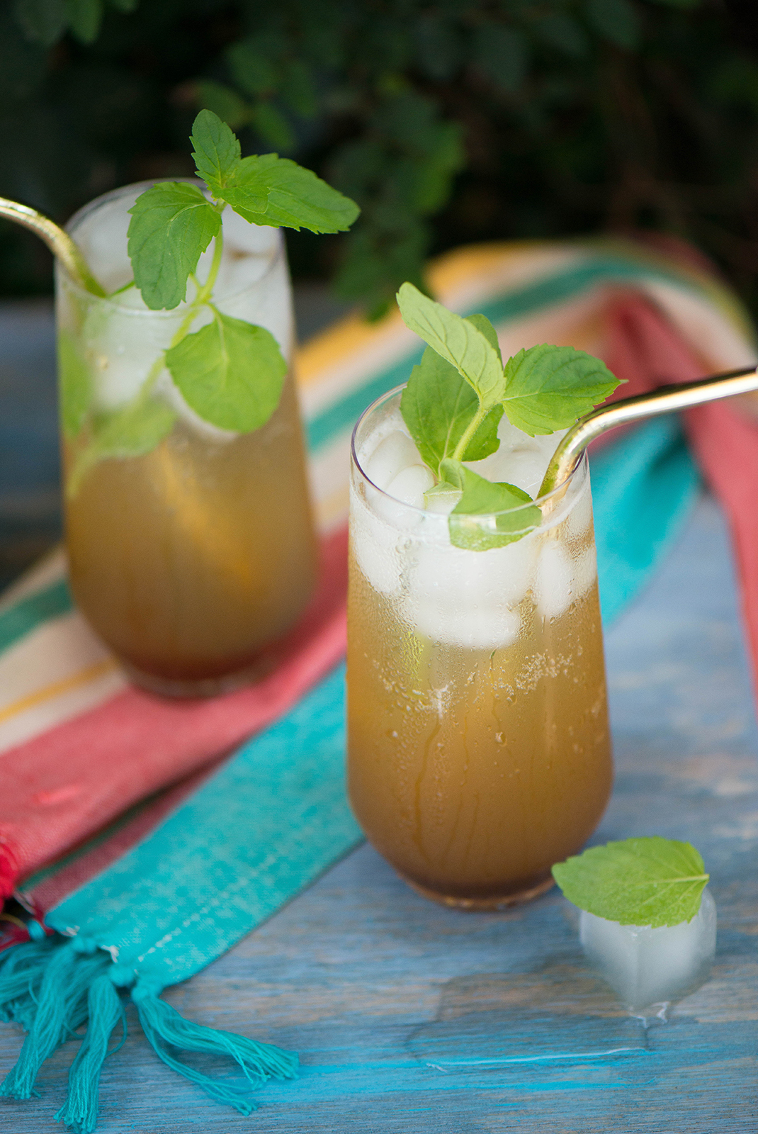The combination of green tea, hints of ginger, vinegar syrup and sparkling water bubbles is a party in itself. Enjoy a few of these this summer. Make it your own by adding bits of your favorite fruit and leafy garnishes.