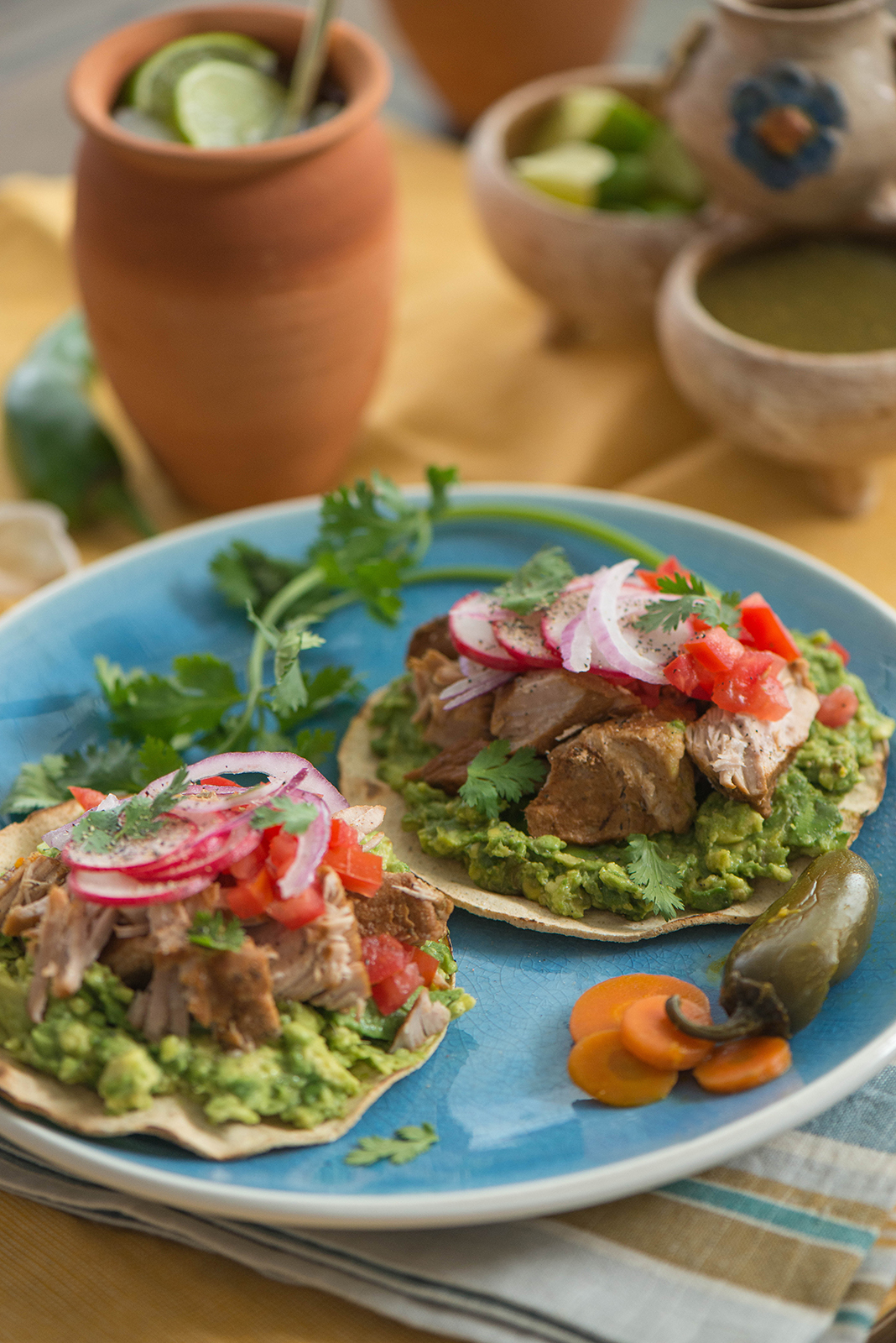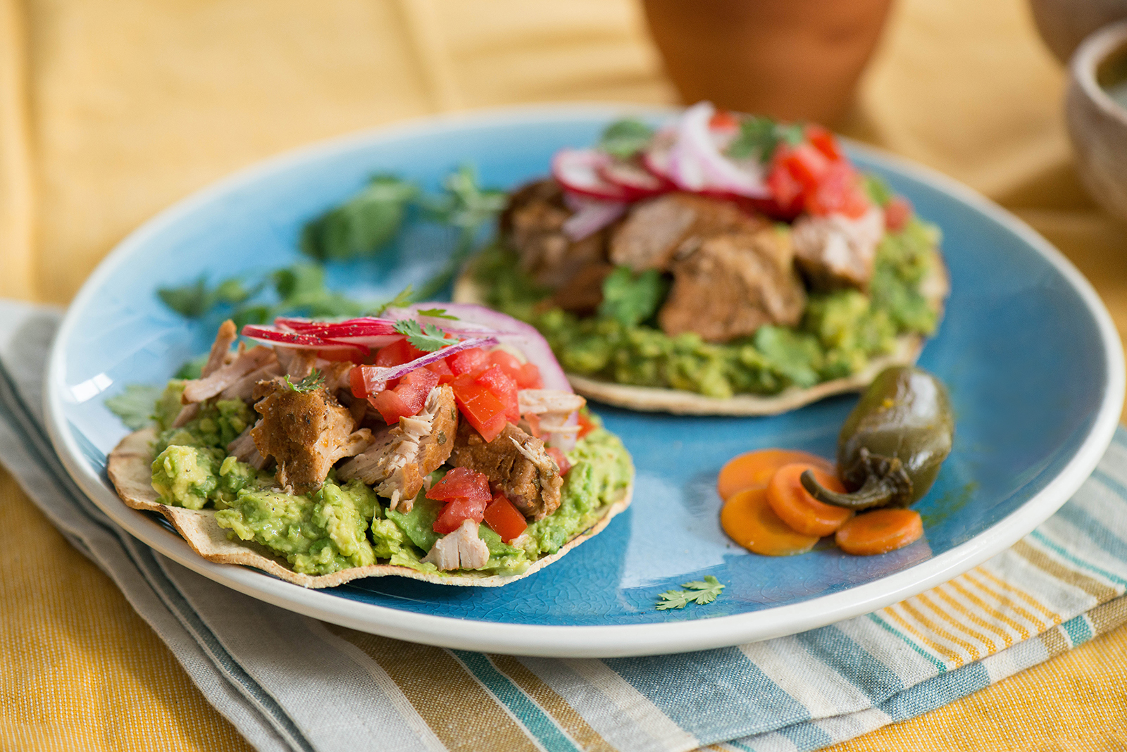 - Spread ¼ cup avocado on each tostada, top with carnitas, tomato, onion, radishes and cilantro, season with salt and pepper to taste. Serve with pickled jalapeños on the side.