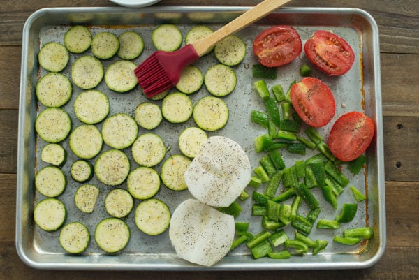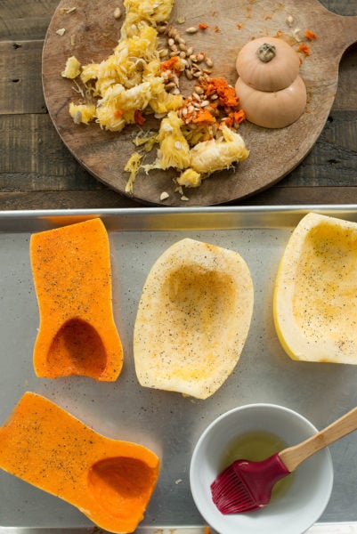For Butternut Squash: Trim butternut squash ends, stand upright and cut in half lengthwise. Scoop out seeds with a spoon, brush with olive oil, sprinkle with salt and pepper.