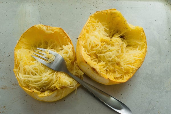 Scrape the inside of squash with fork, making strands. Discard skin.