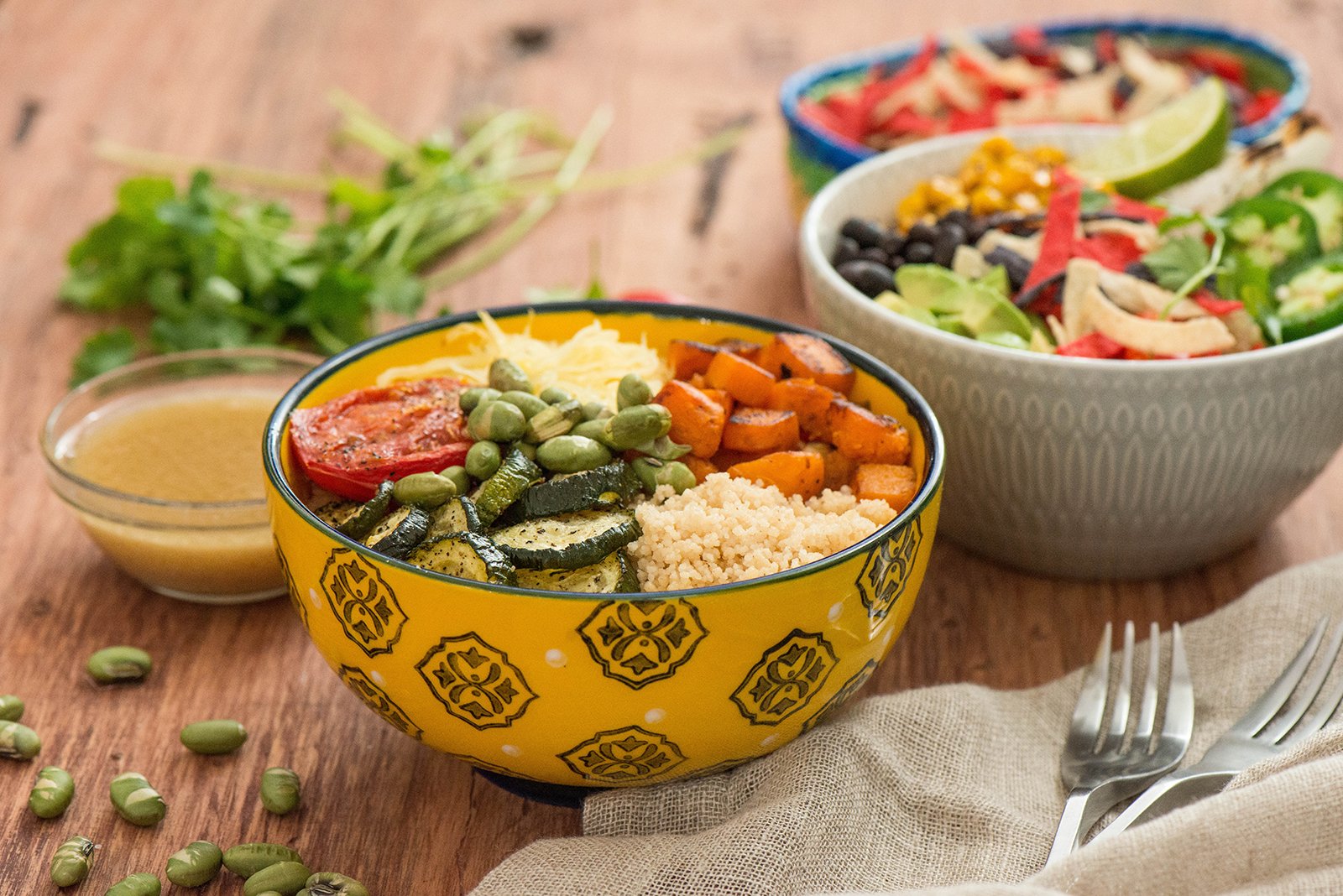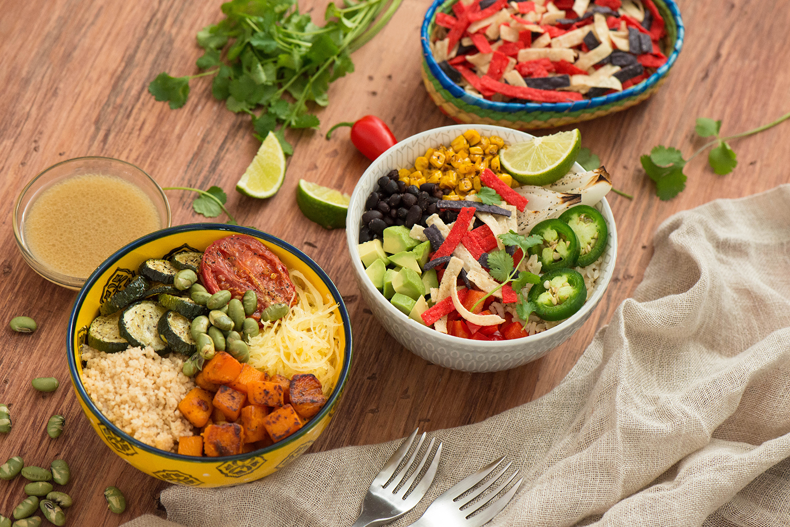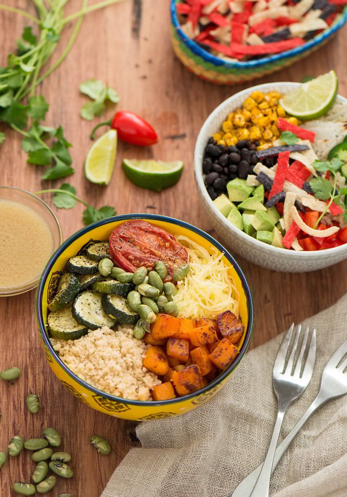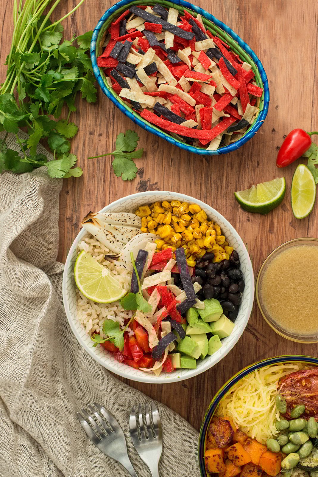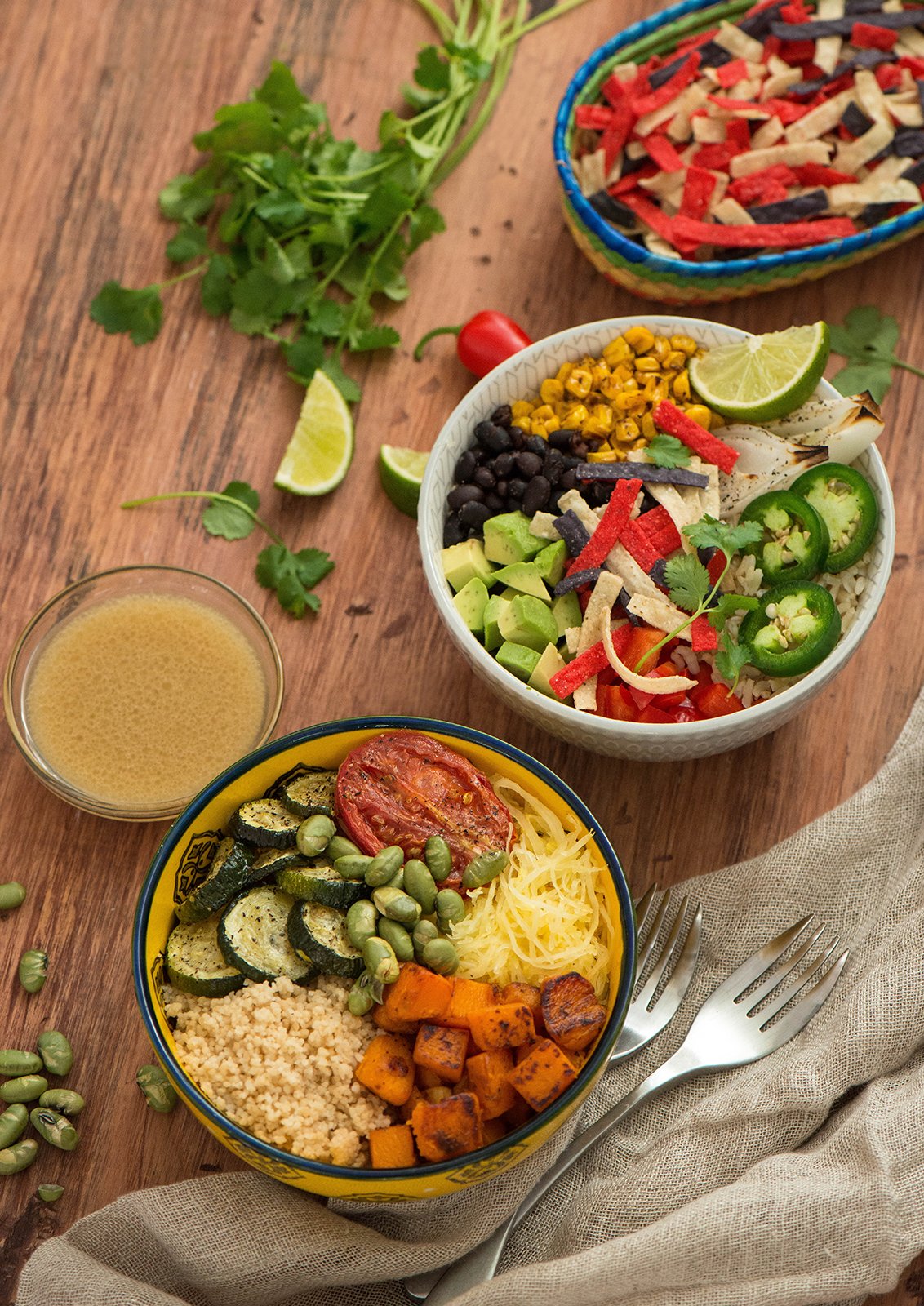 The vegetables can be either fresh or cooked. For my Buddha bowls, I decided to prepare a winter Buddha bowl with roasted vegetables and a southwestern, Tex-Mex fresh bowl..