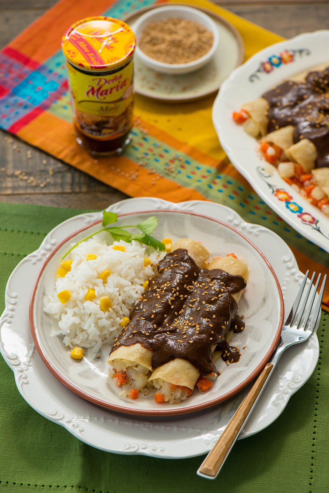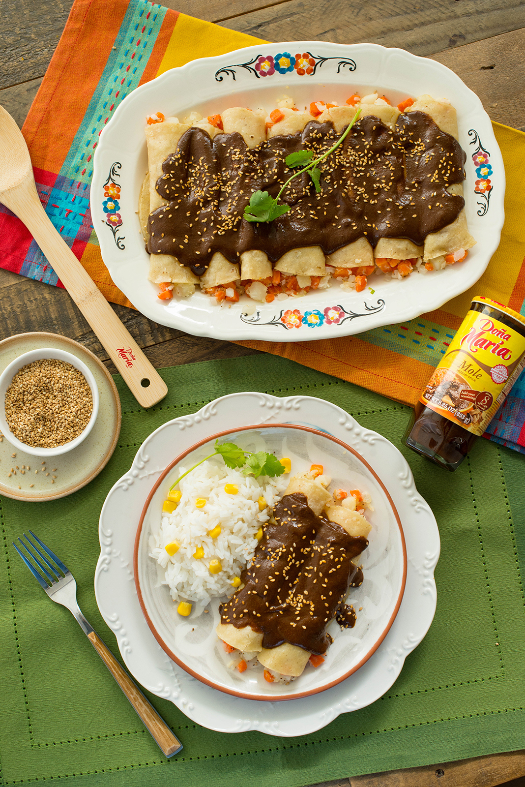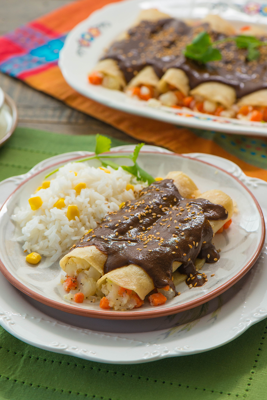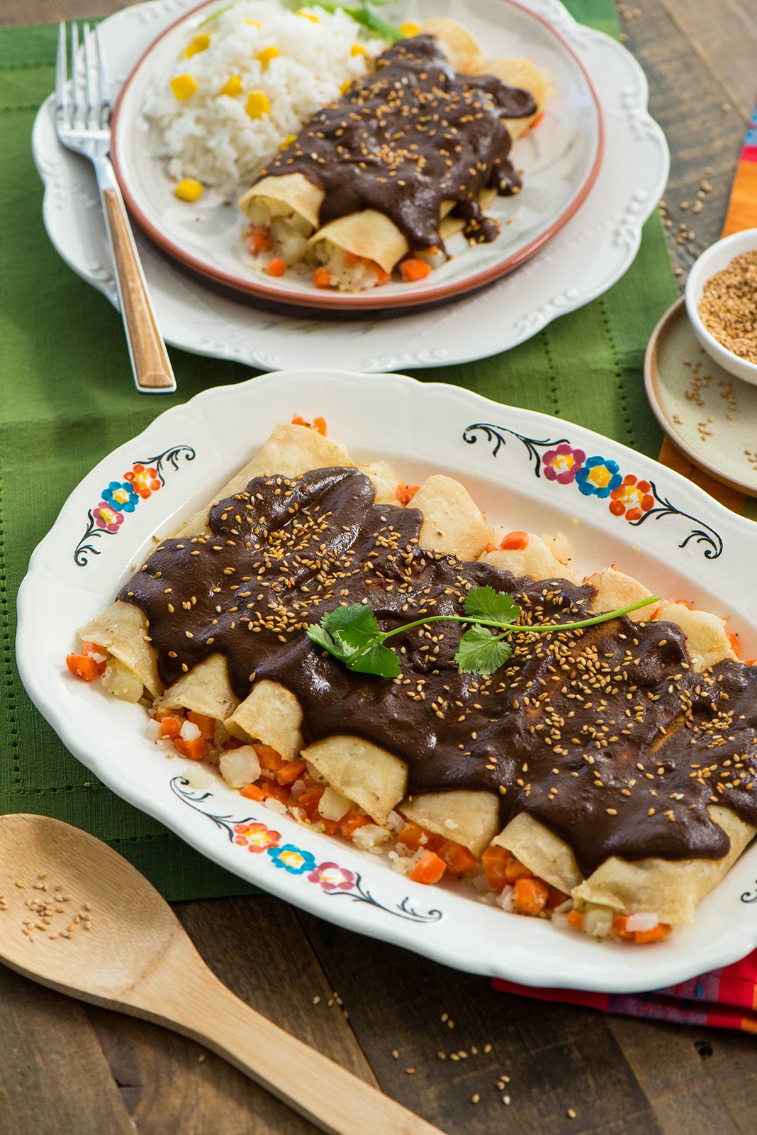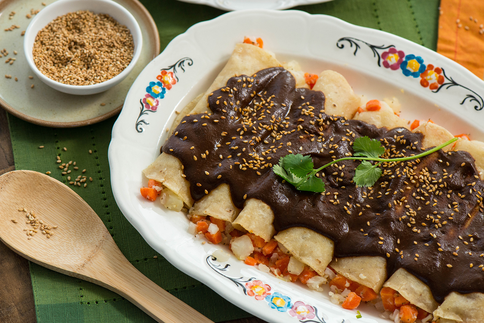 Heat ½ cup oil in a large skillet. Lightly fry tortilla one at a time (about 5 seconds each side—using tongs to flip). Transfer to a paper towel lined plate. Spoon approximately 2 tablespoons of carrot/potato mixture and roll. Place on a serving tray with seam side down. Repeat with remaining tortillas and mixture. Pour warm mole sauce over enchiladas. Sprinkle with sesame seeds. Serve with a side of rice and garnish with cilantro sprigs.