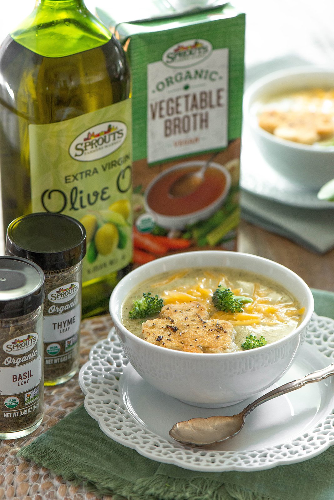 I’m a broccoli lover and I’m here to let you know that I’ve changed that perception in my home. The trick is this creamy broccoli cheddar soup. I was inspired by all the beautiful produce at Sprouts Farmers Market to create something tasty and loaded with a green vegetable. I chose broccoli. To make it more fun, I gave it a St. Patrick’s vibe with home made buttery croutons in the shape of what else? A shamrock!