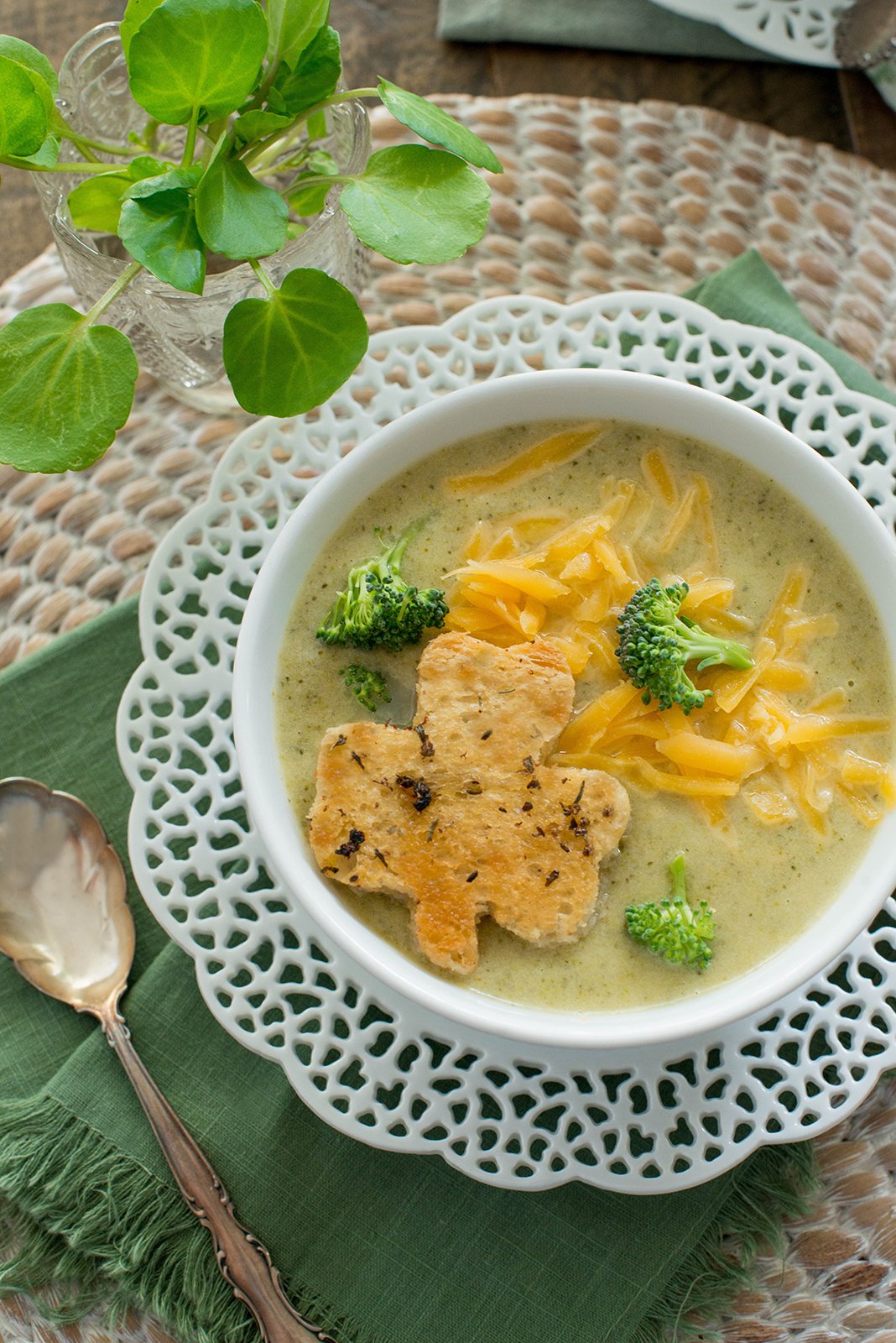 Creamy Broccoli Cheddar Soup with Shamrock Shaped Croutons