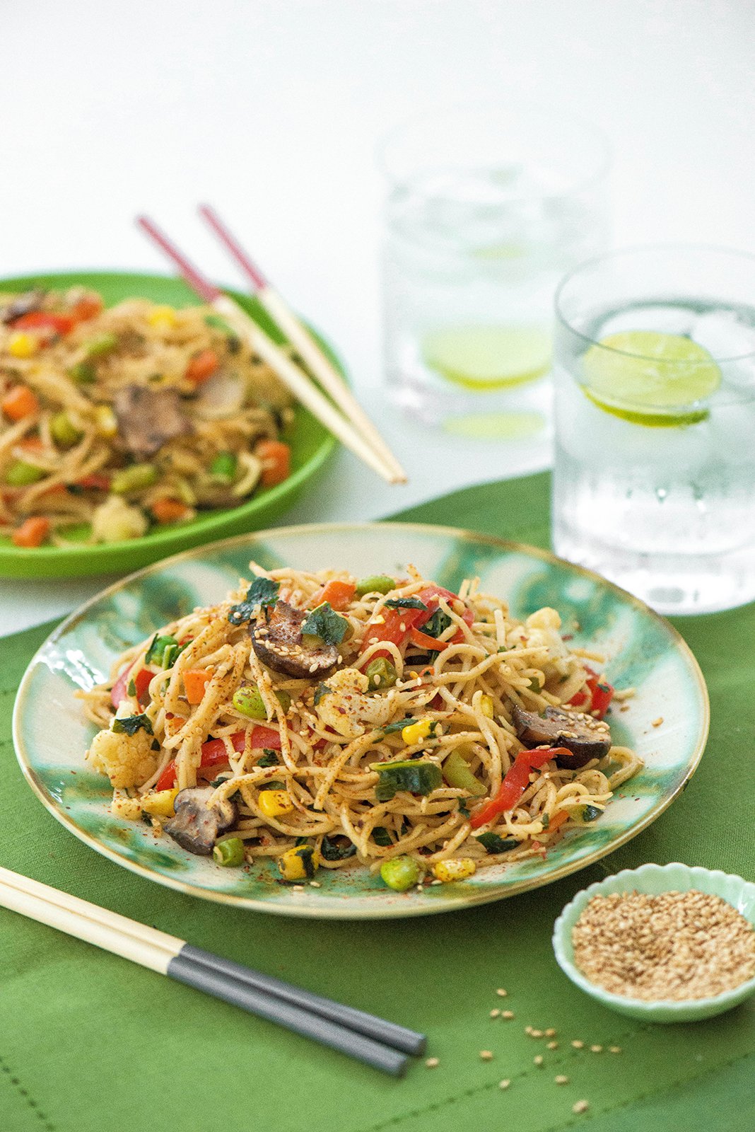 Prepare noodles according to package instructions. Drain and rinse with cold water. Set aside. While noodles are cooking, whisk together soy sauce, sugar, rice vinegar, sesame oil, black pepper and broth in a medium bowl. Heat oil in a wok or sauté pan over medium heat. Add onion, garlic, bell pepper, mushrooms and cauliflower. Cook for 2 minutes stirring constantly. Add broccoli, soybeans, corn, kale, peas and carrots. Continue to cook, stirring rapidly and constantly until vegetables are tender. Add noodles and soy sauce mixture. Increase heat to high. Carefully fold in ingredients using tongs. Cook for 1-2 minutes. If noodles stick to pan, add 2-3 tablespoons of vegetable broth and decrease heat. remove from heat, serve immediately. Garnish with toasted sesame seeds and red pepper flakes.