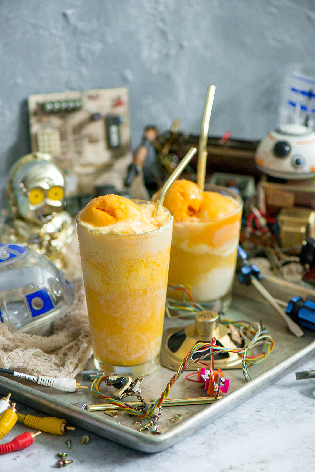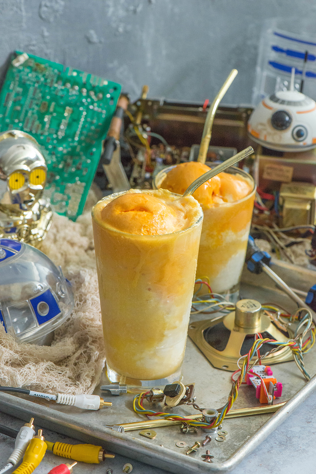 I’ve gone ahead and recreated my version of Anakin’s workshop and also made him a C3P-Orange Sherbet Float for when he needs a break. Creamy vanilla bean ice cream and orange sherbet in a mixture of pineapple juice and ginger ale. It’s creamy, it’s sweet and it’s good enough for a Jedi.