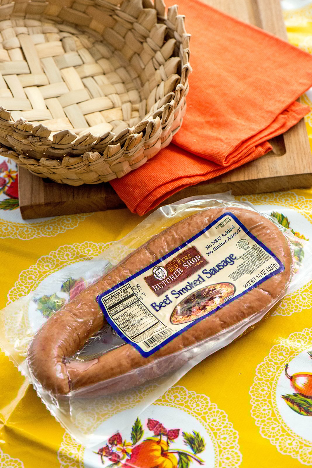 1 (14-ounce) Sprouts Brand Old Tyme Butcher Shop Beef Smoked Sausage, grilled or pan fried, chopped in small cubes