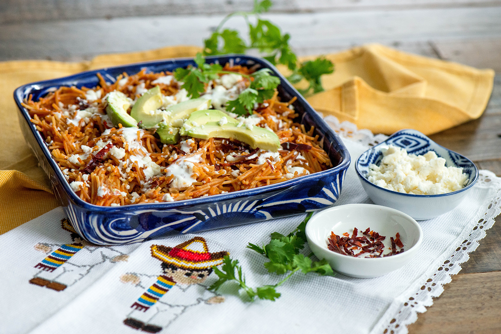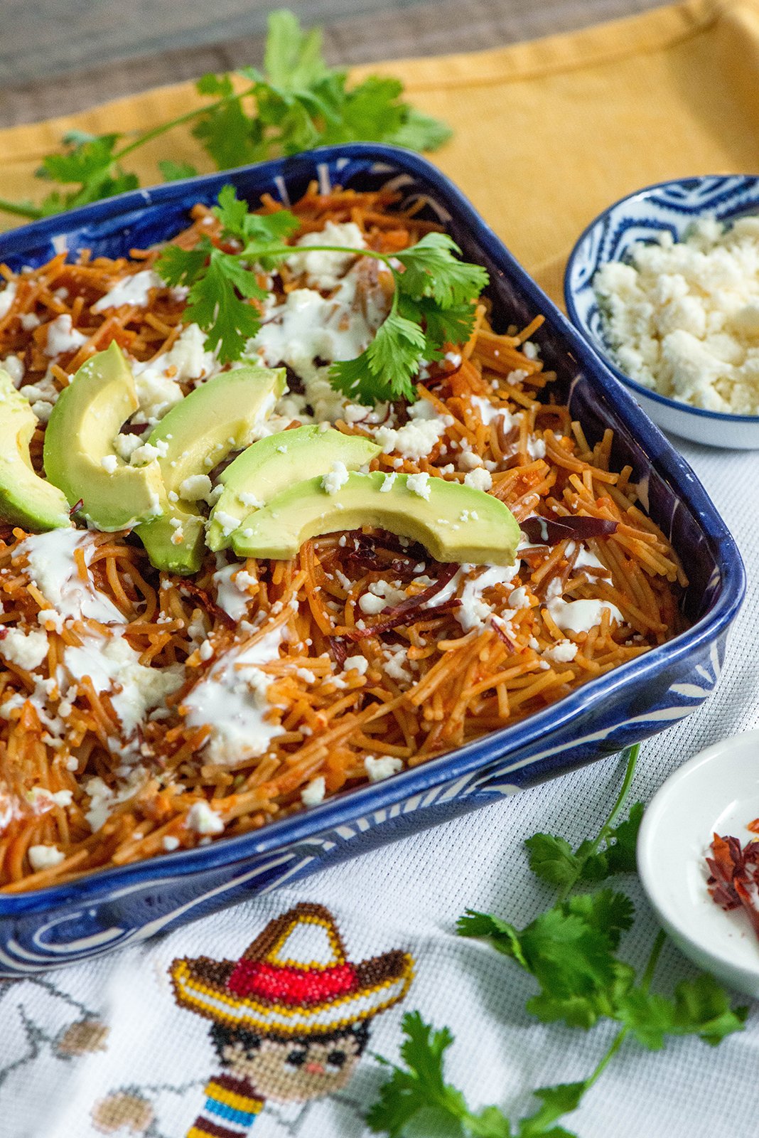 Sopa seca de fideo is delicious as a side dish and enhanced with a variety of toppings of your choice. I love queso fresco, crema (either creme fraiche or sour cream), dried chile strips, fresh cilantro, and of course, creamy avocado.