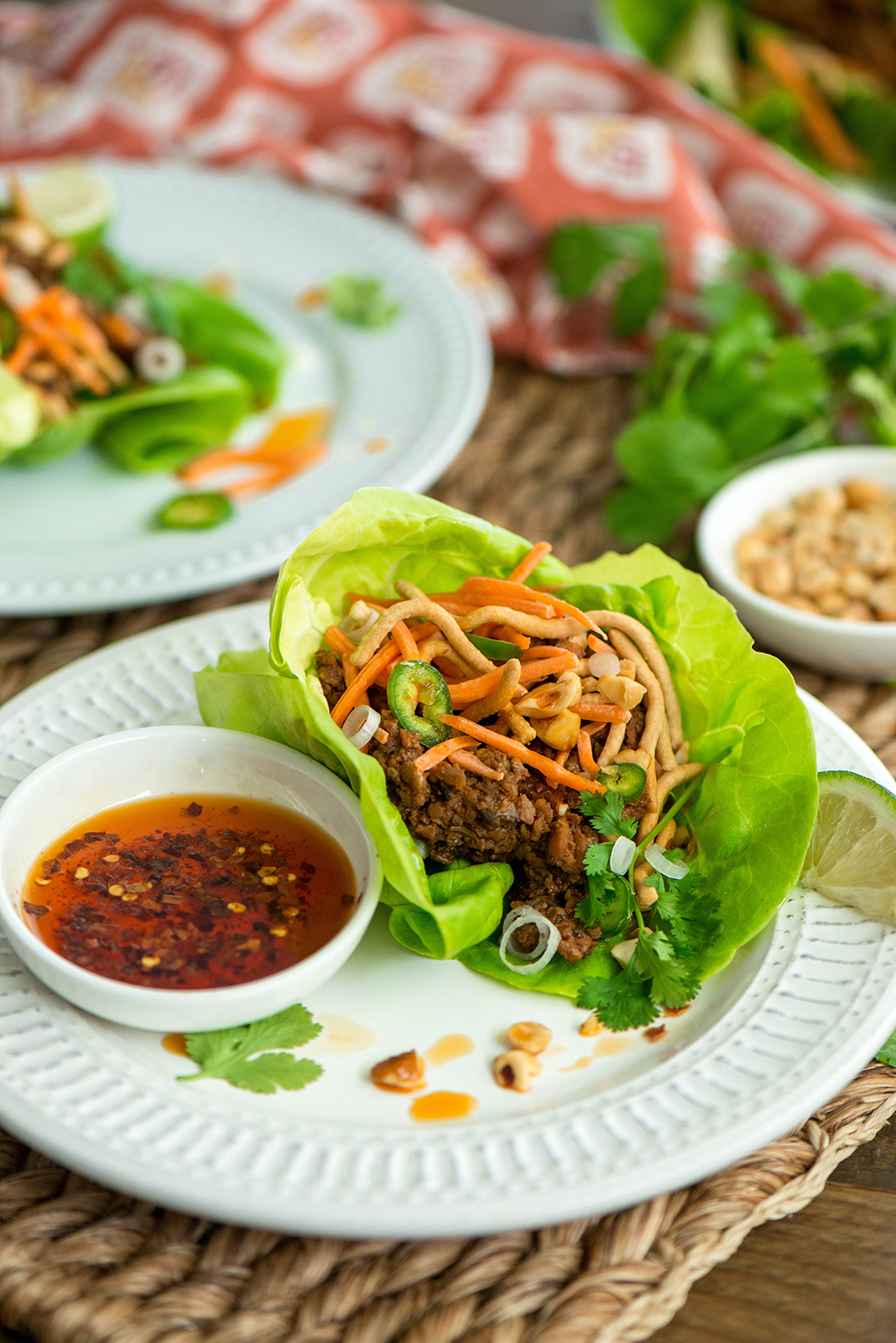 These fresh lettuce cups are a flavorful vegan alternative to traditional lettuce cups. Top with your favorite garnishes.