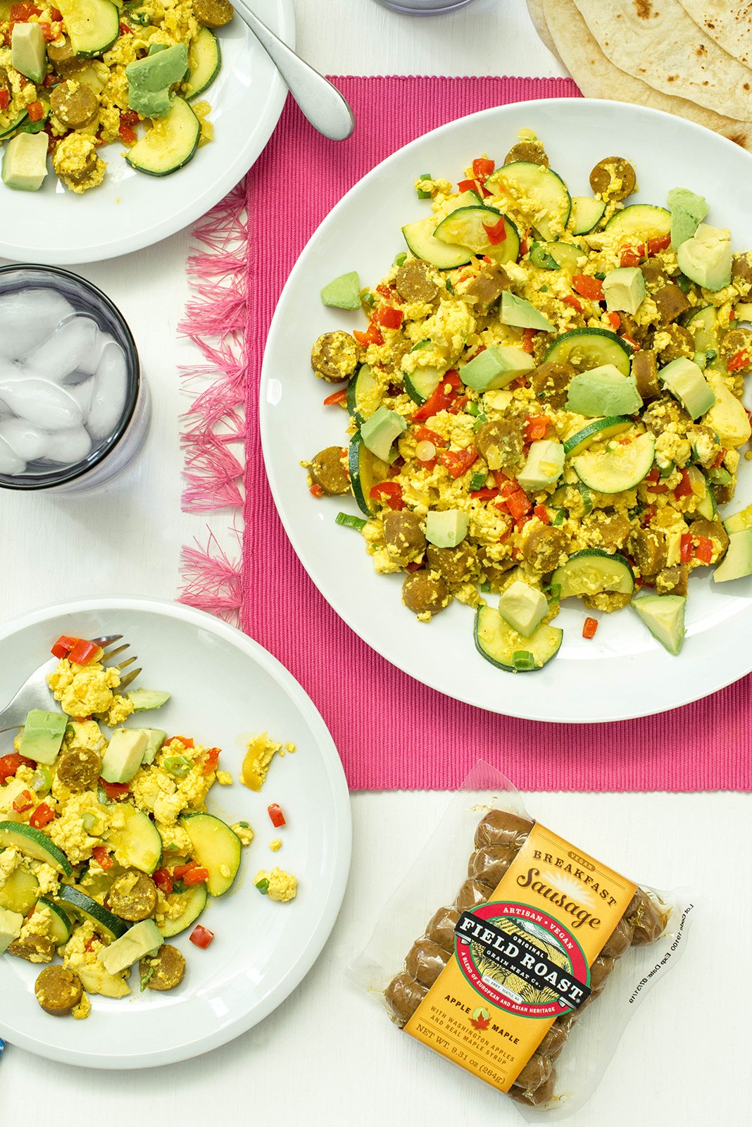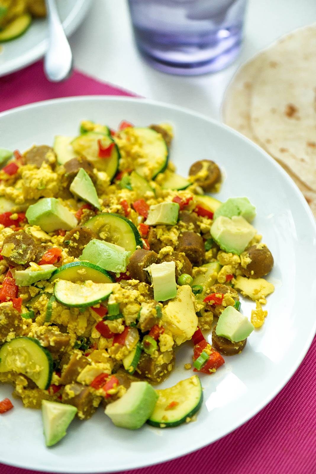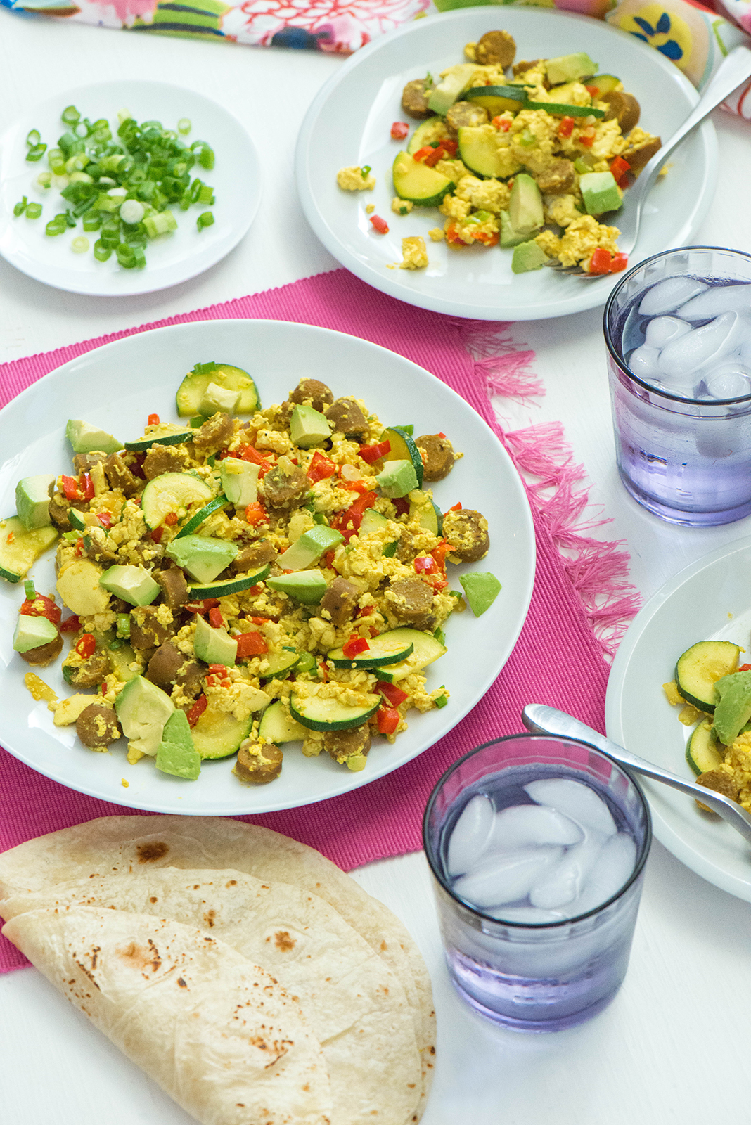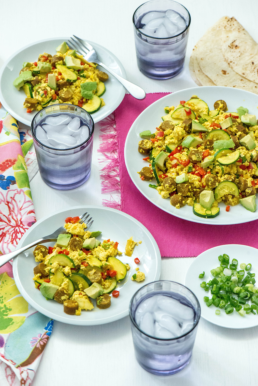 We’ve been getting really creative during breakfast time lately. One of our new creations and latest addition to our start-of-the-morning menu rotation is this colorful tofu scramble with vegan sausage.