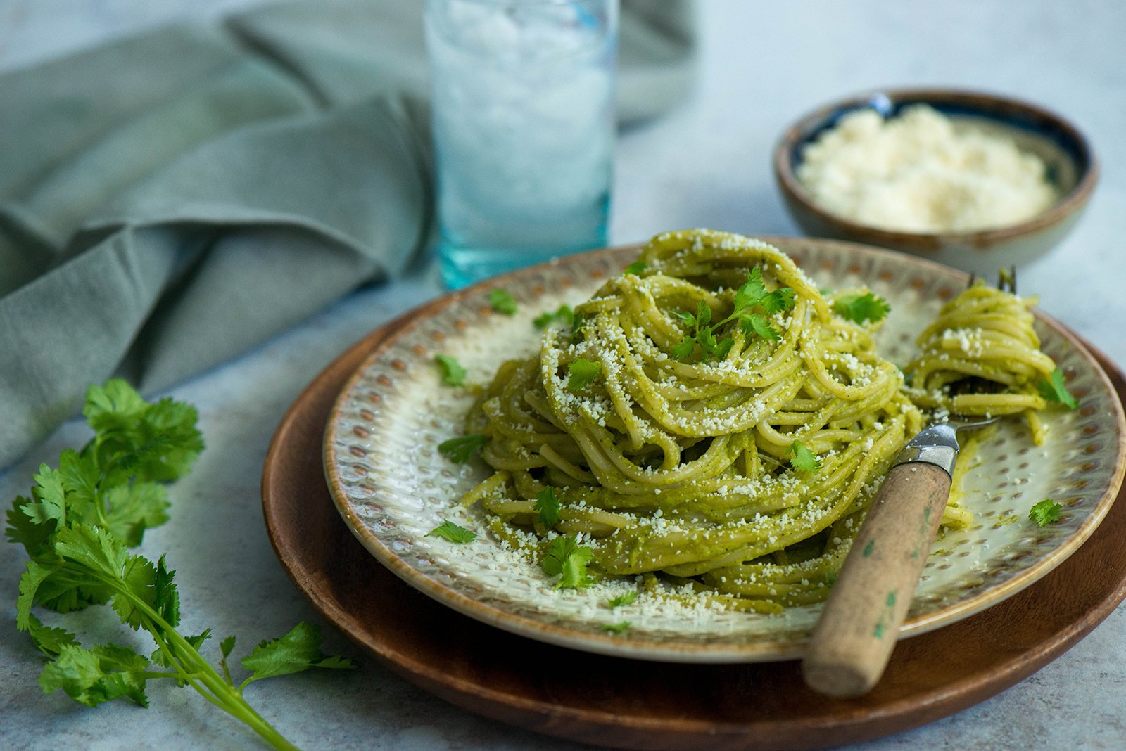 While Poblano mixture cooks, prepare spaghetti according to package instructions. Drain and transfer pasta into Poblano mixture, carefully folding into sauce until completely covered. Remove from heat and serve. Garnish with cotija cheese and pieces of cilantro sprigs.