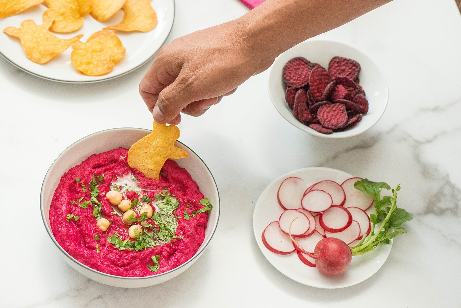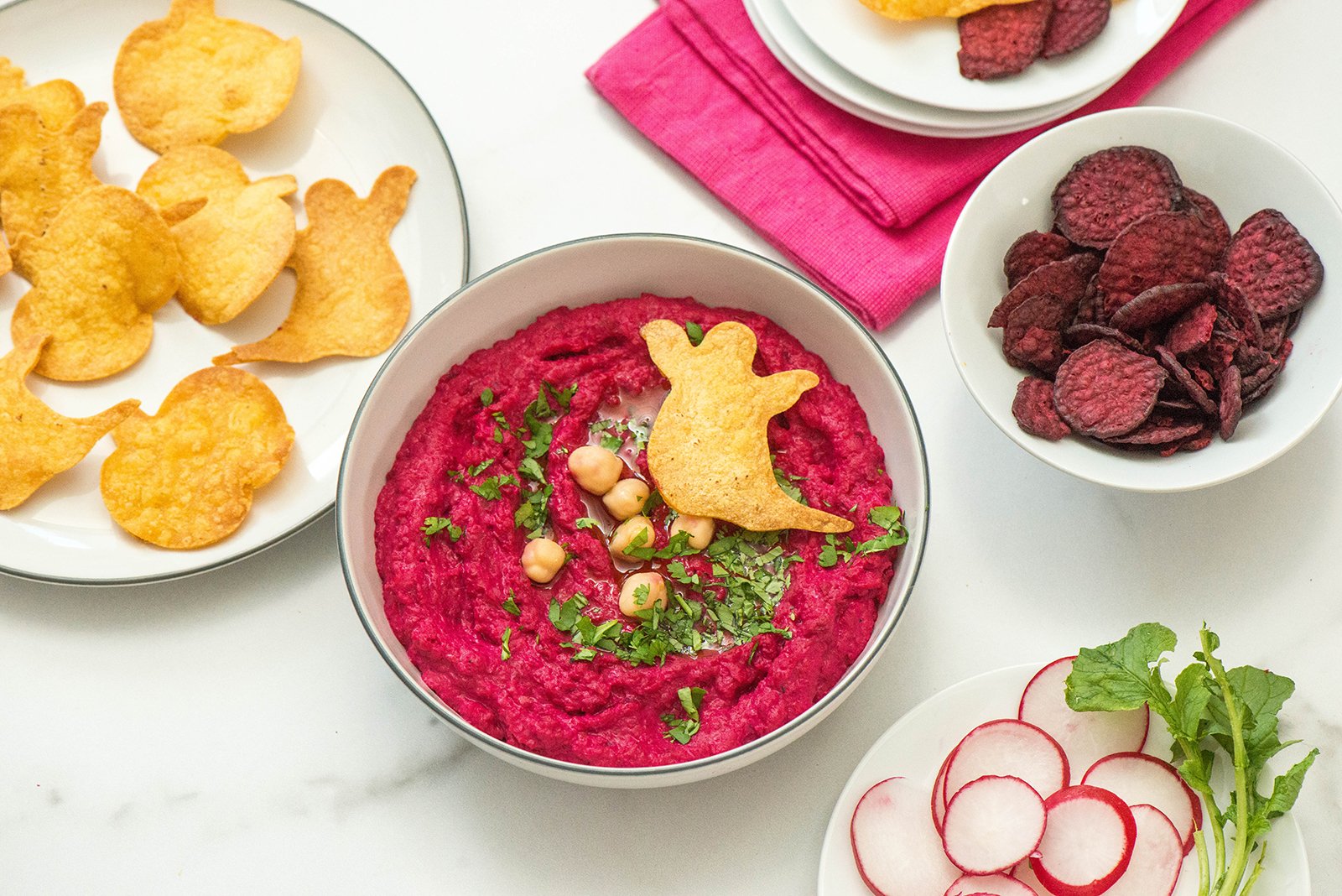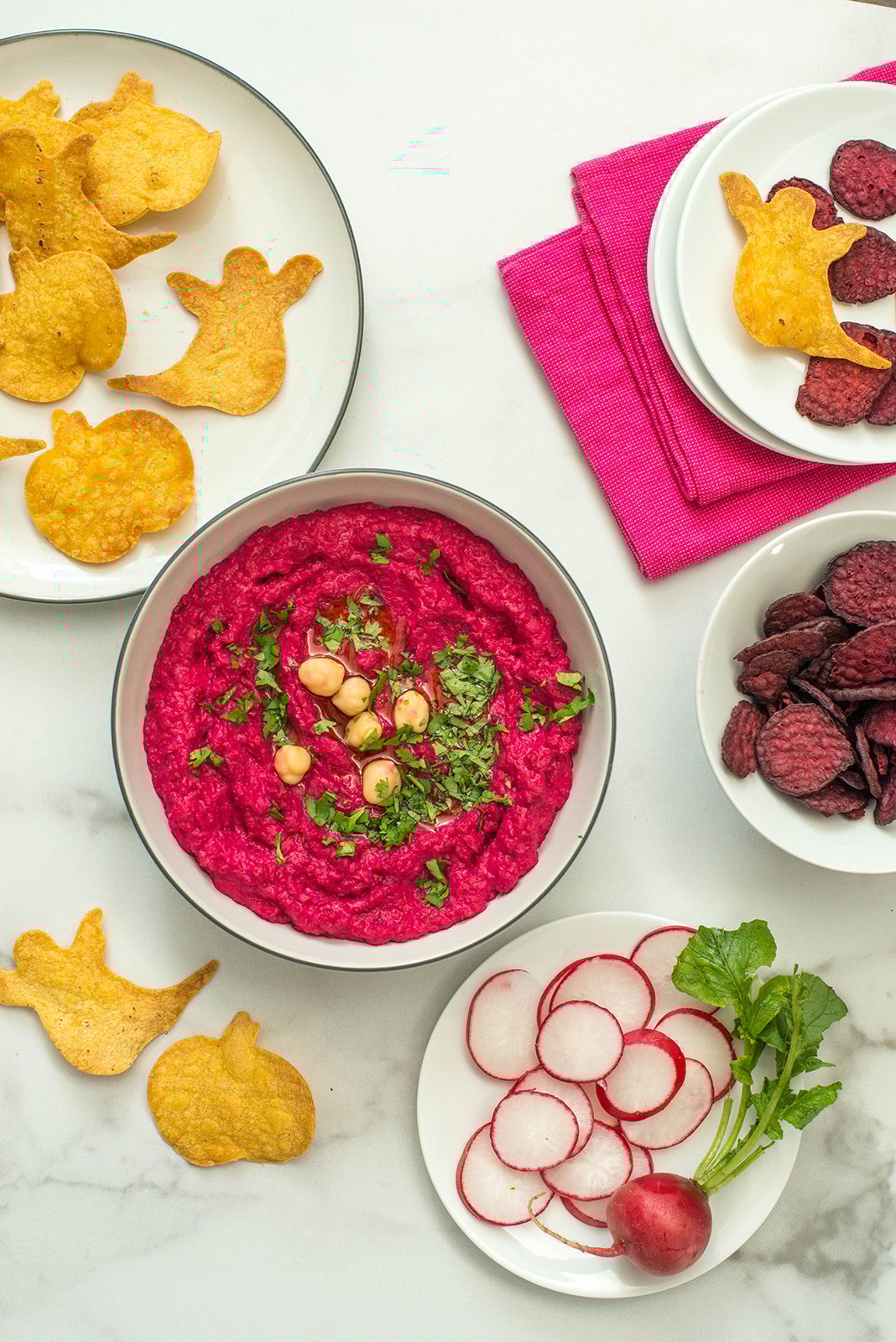 Hummus Beet Dip with Halloween Shaped Tortilla Chips