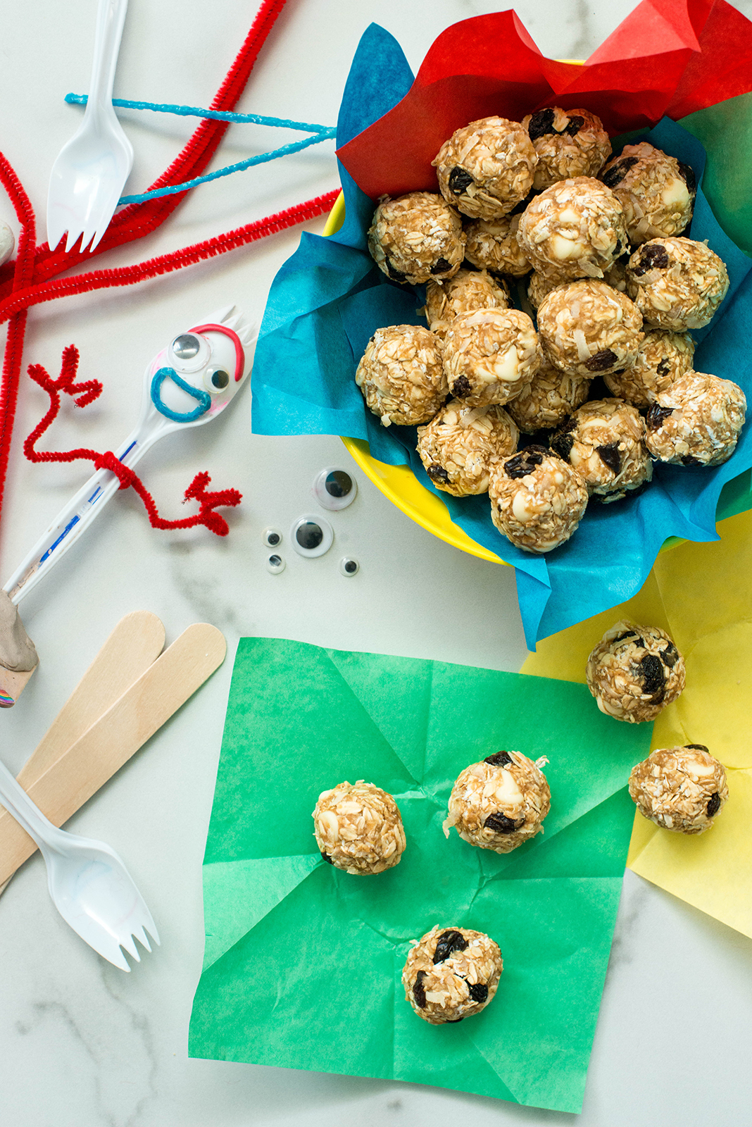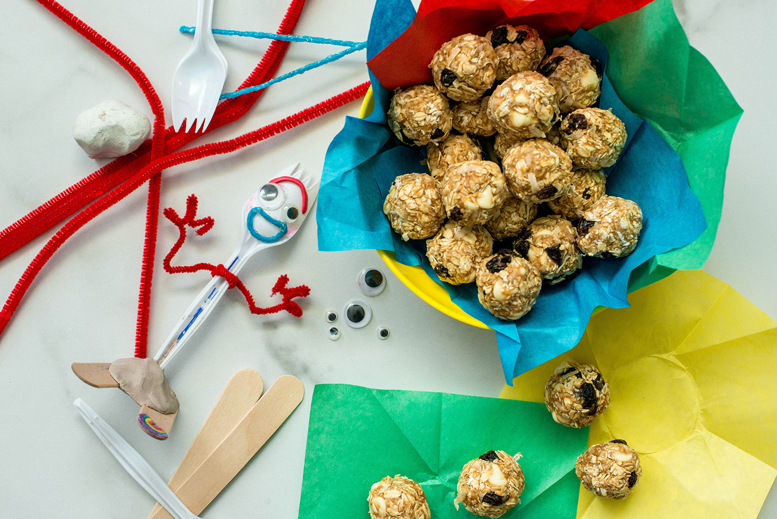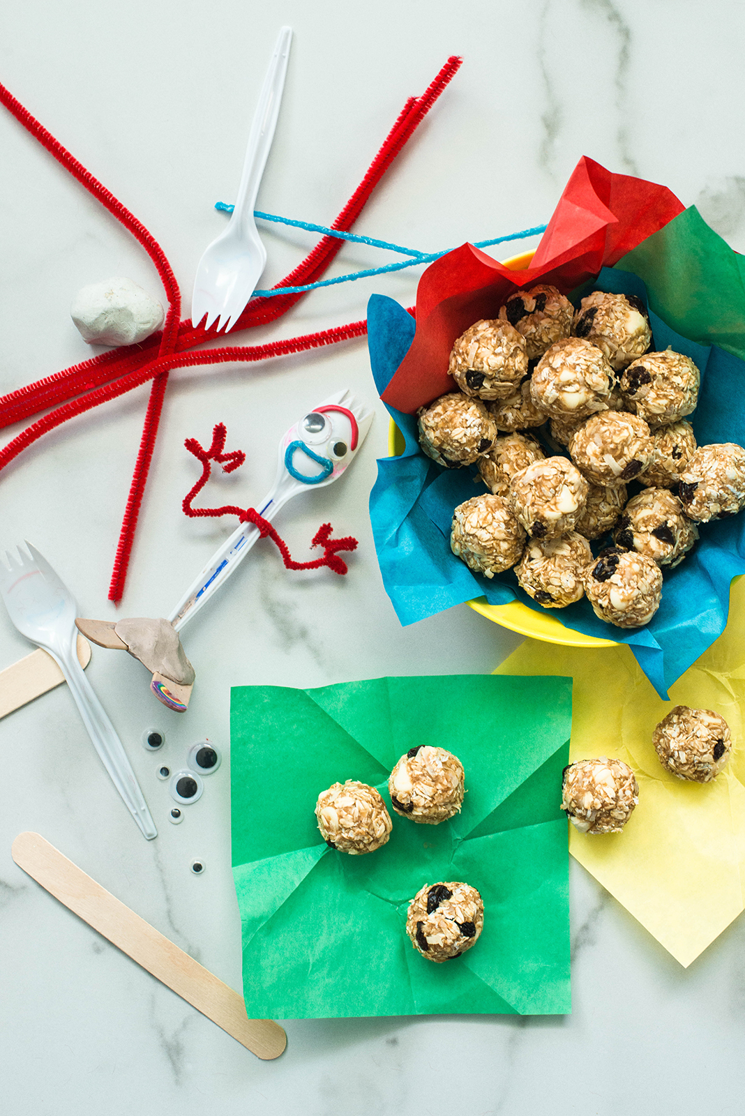 Because we wanted to keep the spirit of traveling on the road, we decided to make our very own Forky and peanut butter oat bites. Those little treats are perfect to pack for lunch and to take on road trips. No baking is needed, they pack and travel well in a tightly sealed container. They are also a great snack to prepare with your entire family.