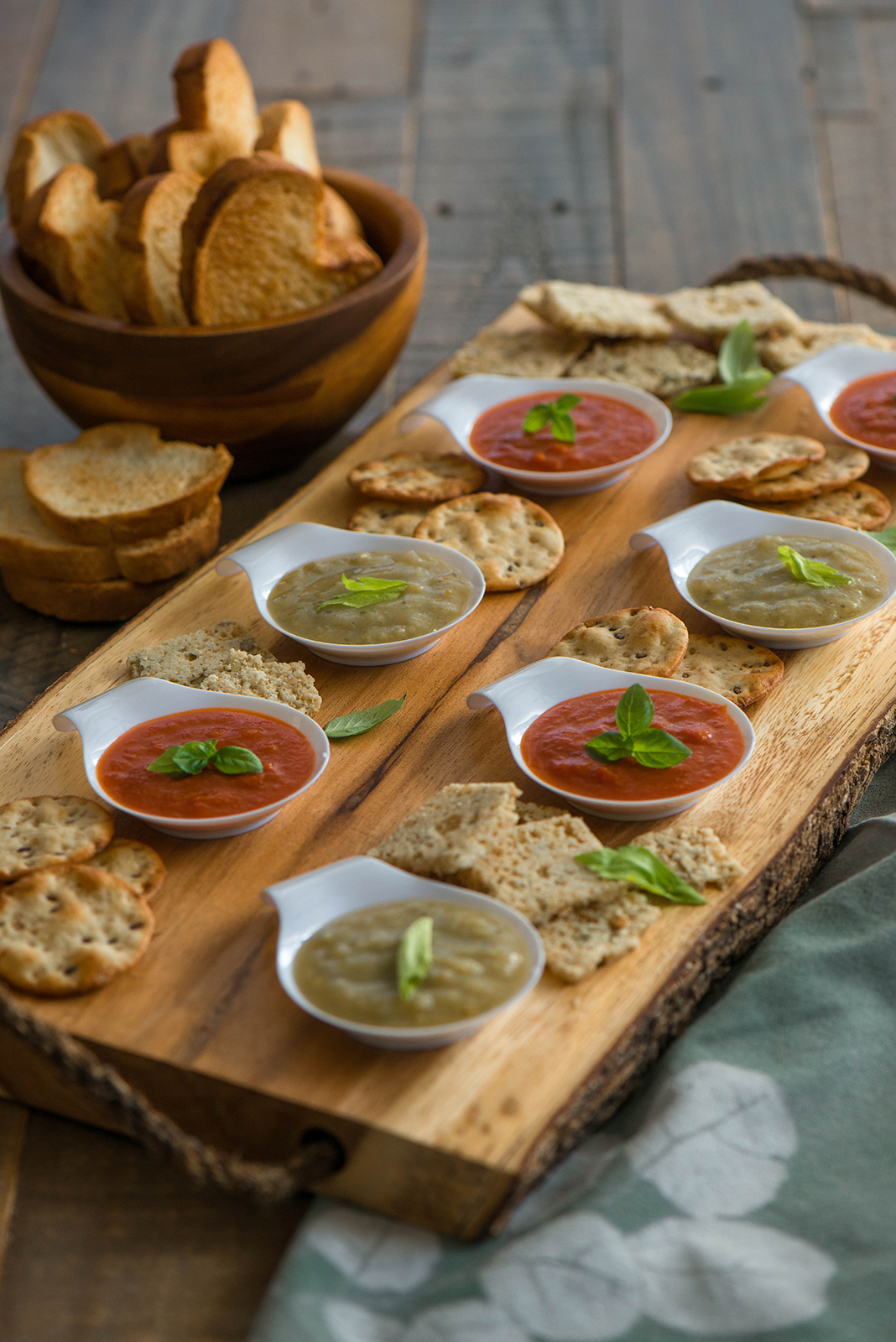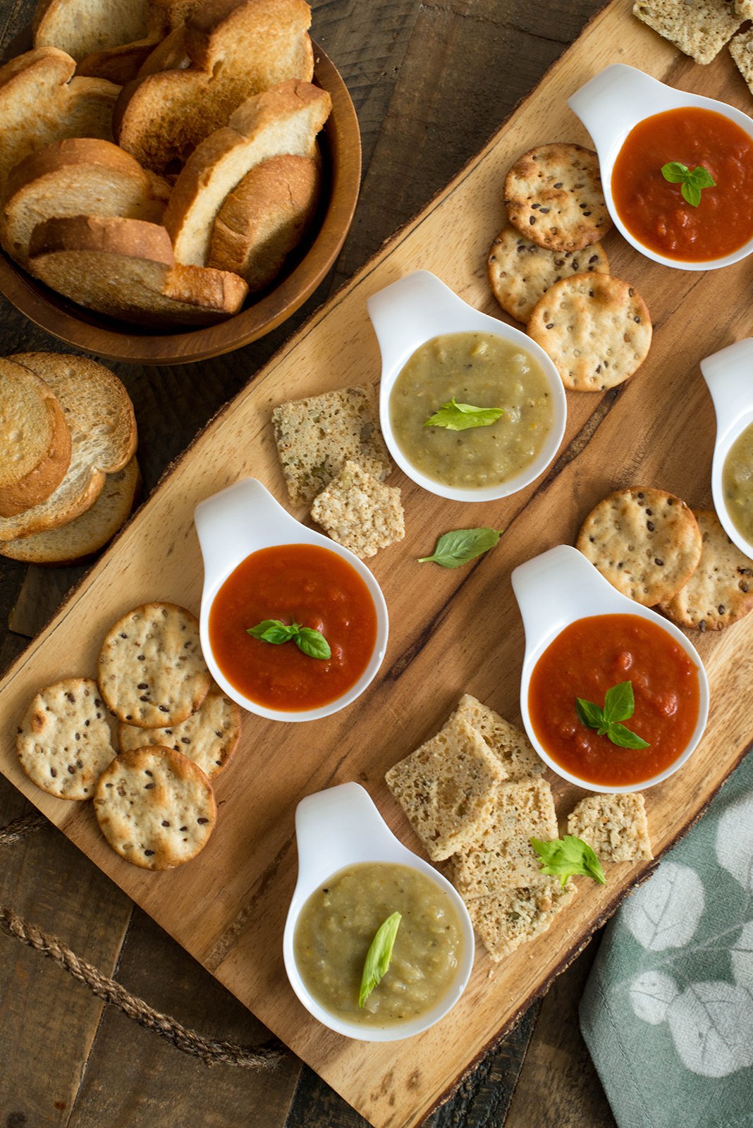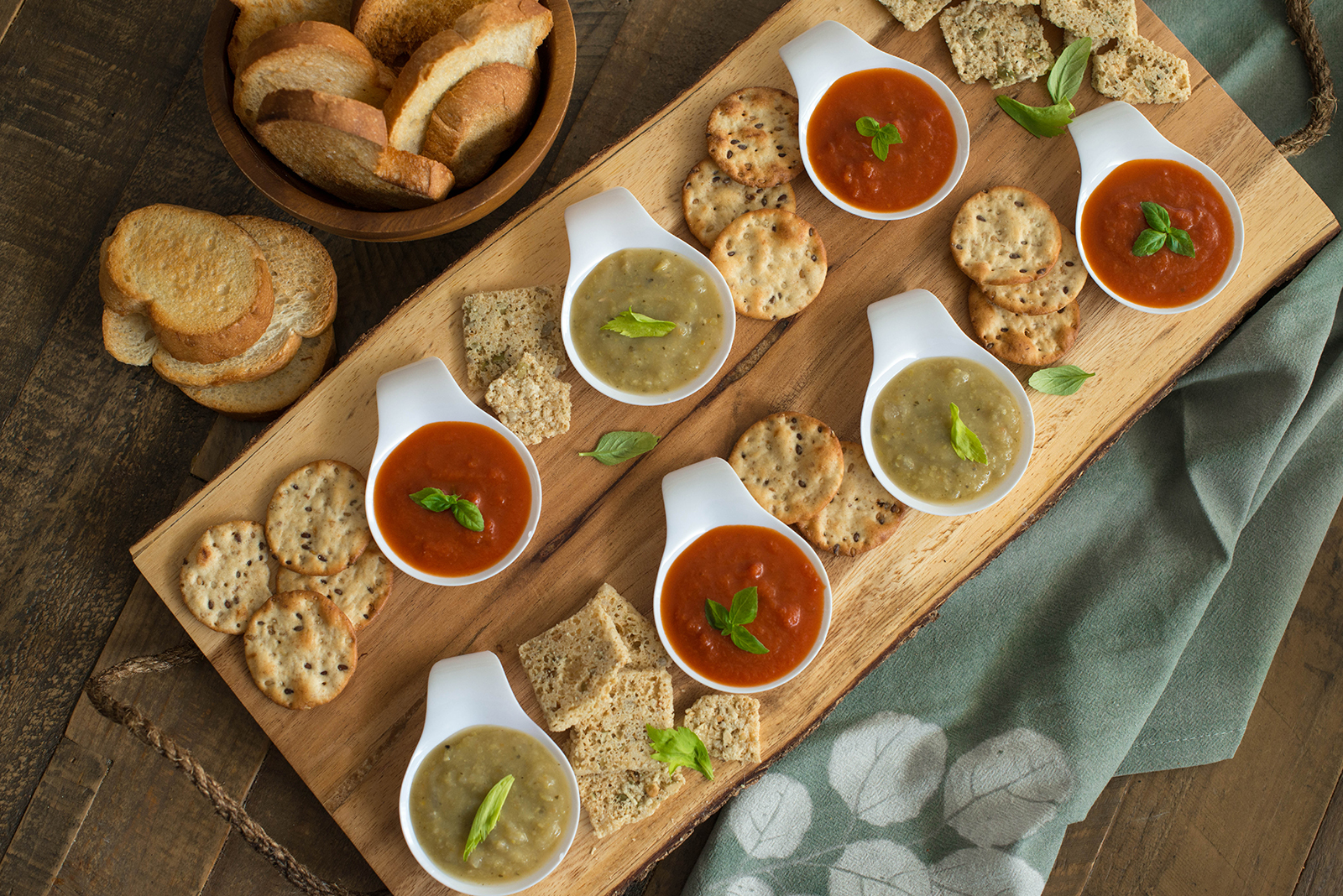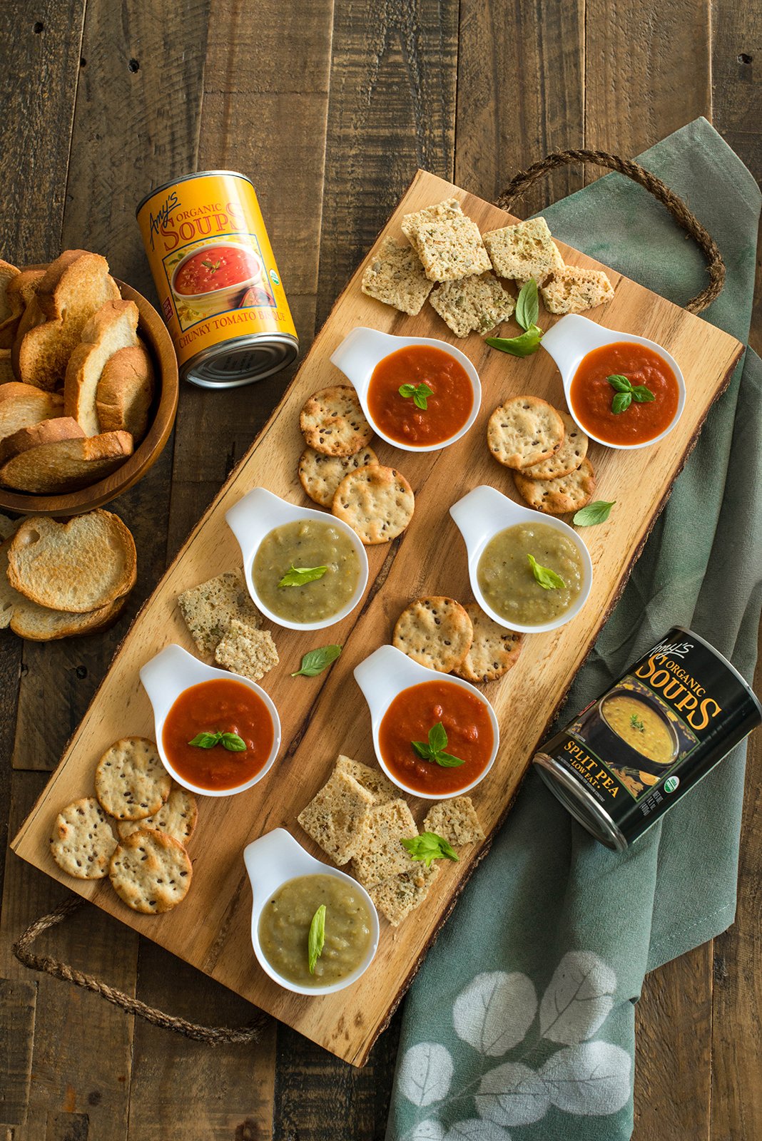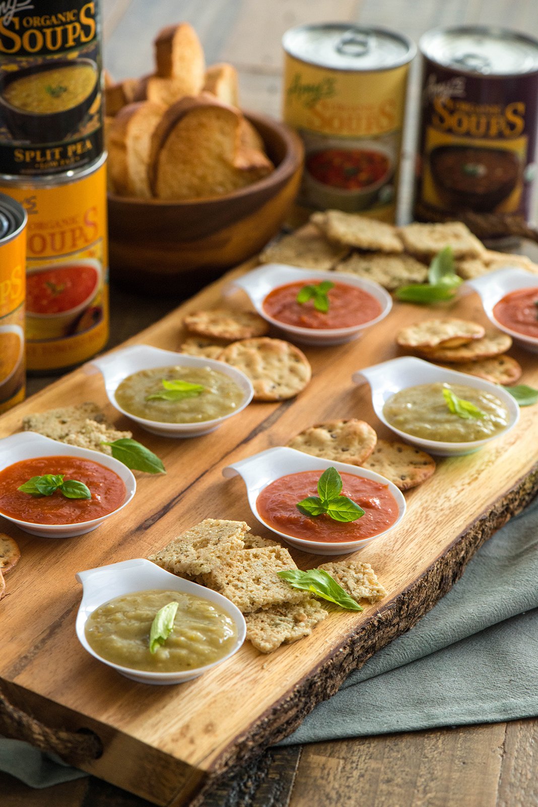 Presentation is very important. Use wooden boards, warm colors and small appetizer soup spoons to make the occasion more festive and attractive. Appetizer spoons can be found online or at restaurant specialty stores. If your menu is small, serve Amy’s Soups made with organic ingredients as an introductory course in small bowls as a larger portion. All you have to do is heat and serve. Because Amy’s Soups are made with organic ingredients, you know you are getting a great tasting course. Amy’s has it handled for you.