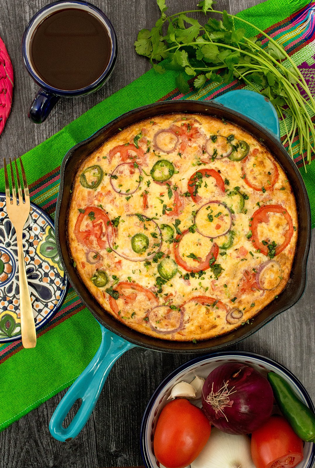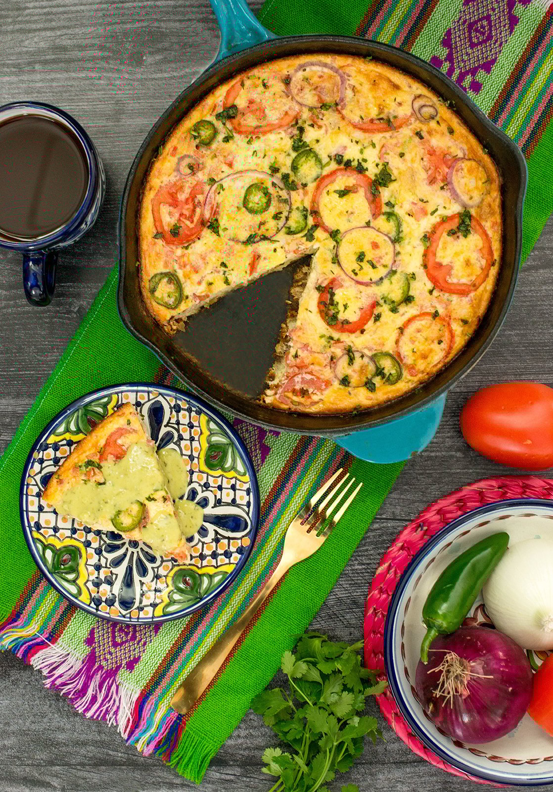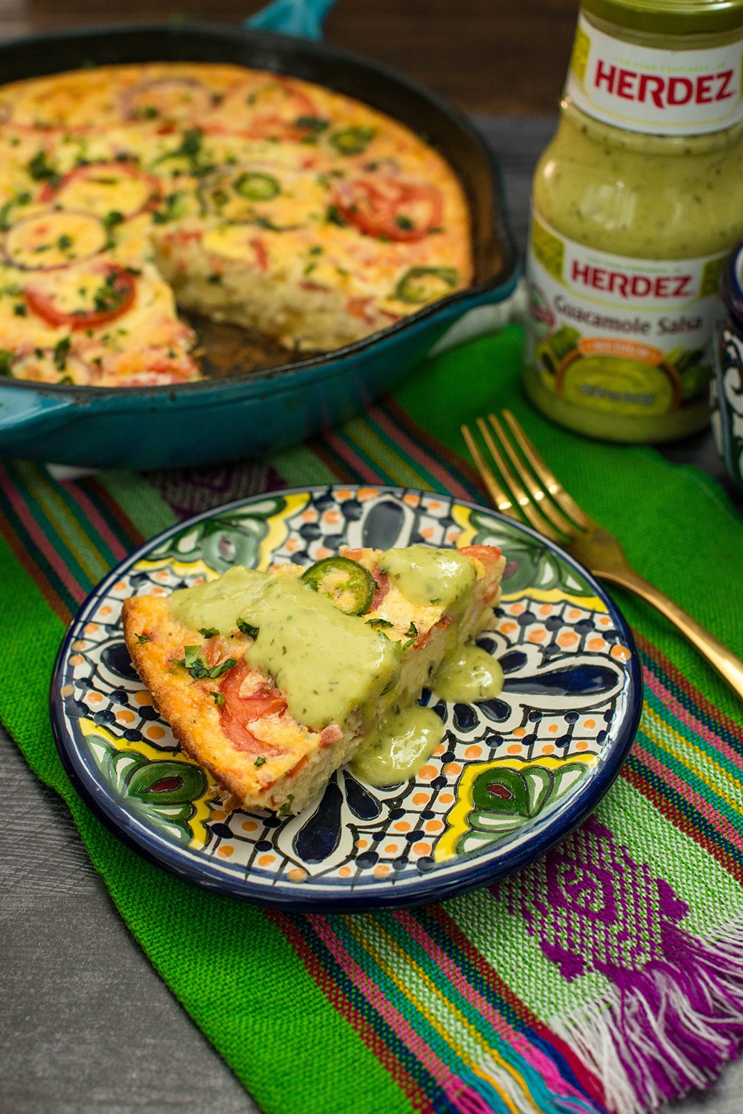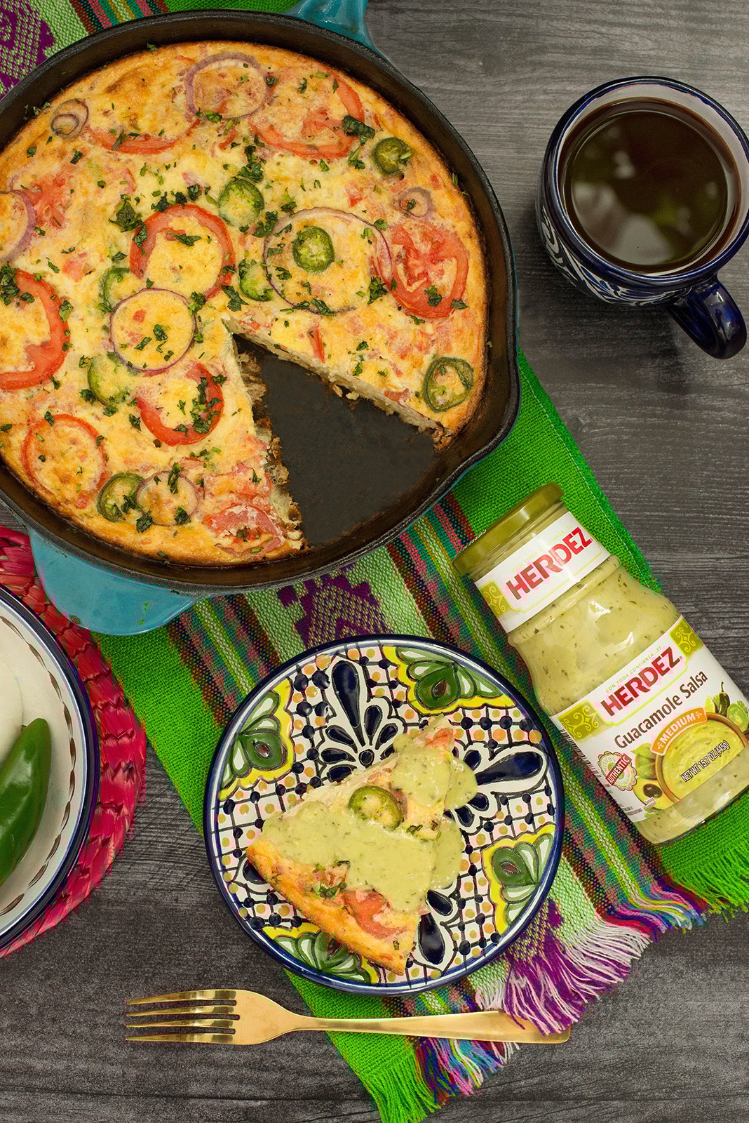 A pico de gallo, or “a la Mexicana”, style frittata is the way I like to prepare mine. Jalapeños, tomato and onion, “chile, tomate y cebolla” the colors of the Mexican flag. It’s full of flavor with the perfect amount of gooey cheese and hearty potatoes. There is one thing it needs, though. My favorite salsa, HERDEZ® Guacamole Salsa. A generous drizzle on top completes this mouthwatering feast. It’s colorful and festive enough to enjoy at a celebratory breakfast and brunch too.
