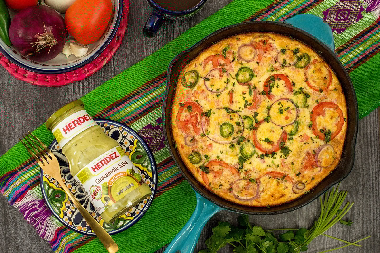 Beat together eggs, table cream, milk, cheese, salt and pepper in a large bowl. Pour into cast iron mixture and stir to combine all ingredients. Arrange tomato slices, jalapeño slices and red onion slices on top. Bake for 20-22 minutes. Center will be wobbly. Remove from oven and let rest for 5 minutes. Sprinkle with fresh cilantro. Slice and serve with Herdez Guacamole Salsa.