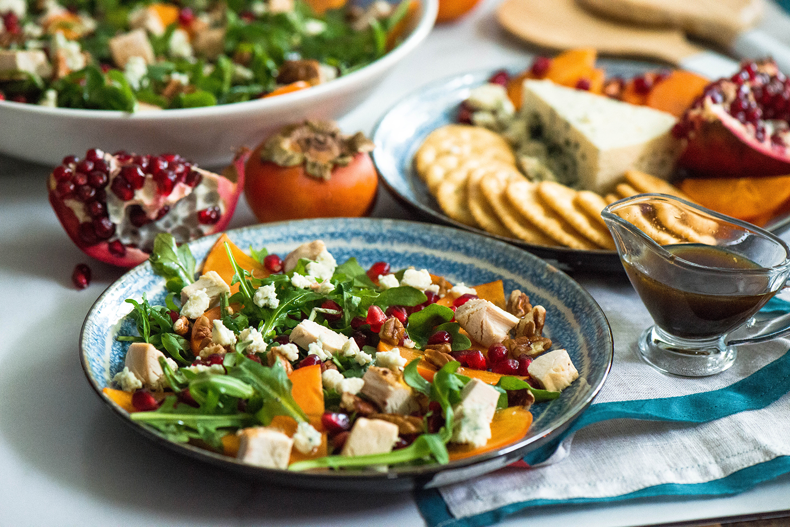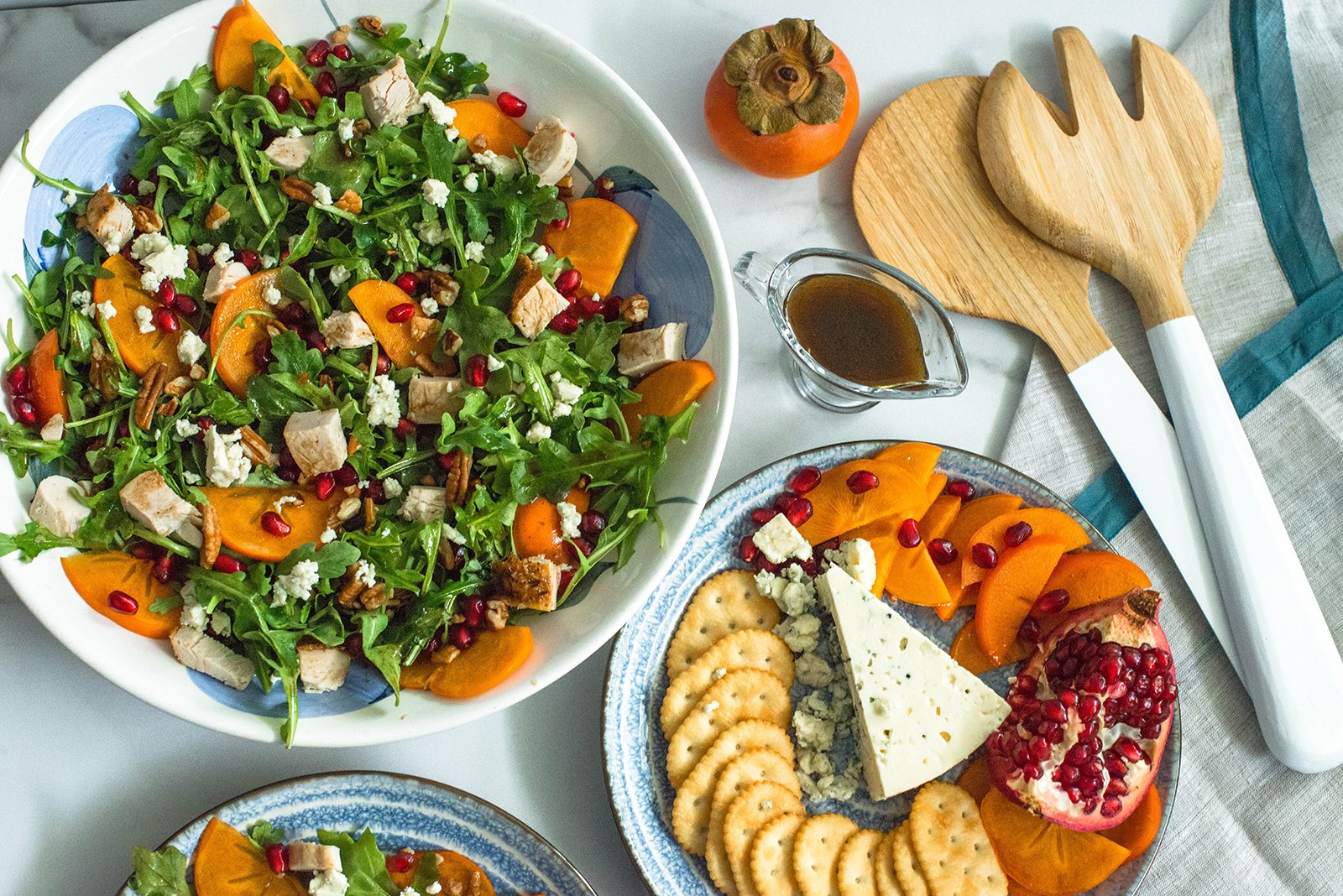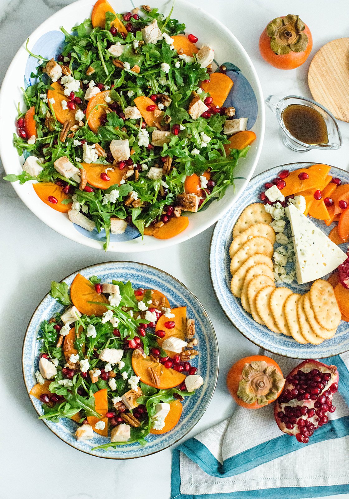 Arrange arugula, slices from 2 persimmons, ¾ cup pomegranate arils, blue cheese, pecans and chicken in a large salad bowl. Toss with dressing. Store remaining dressing refrigerated in a jar with lid.