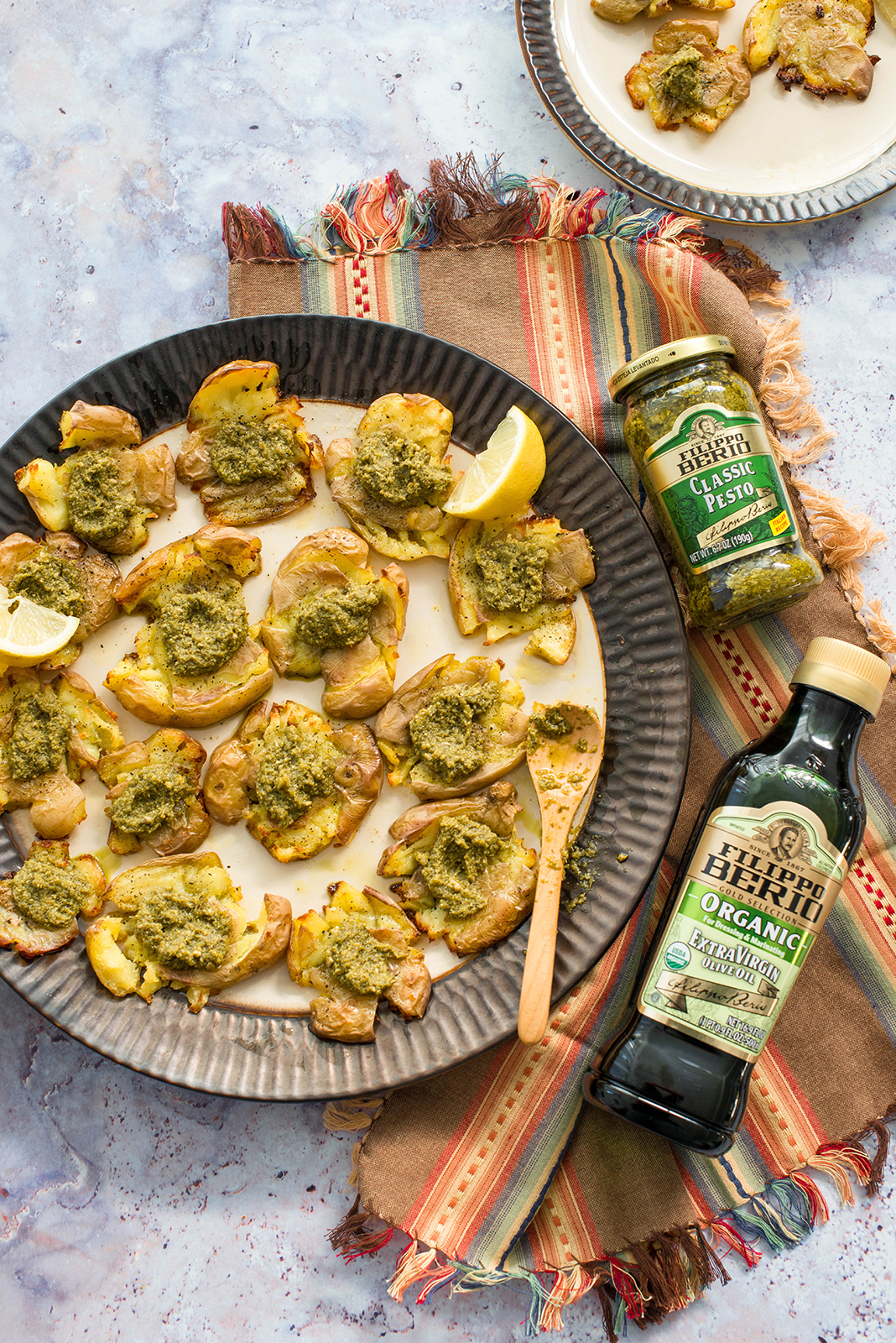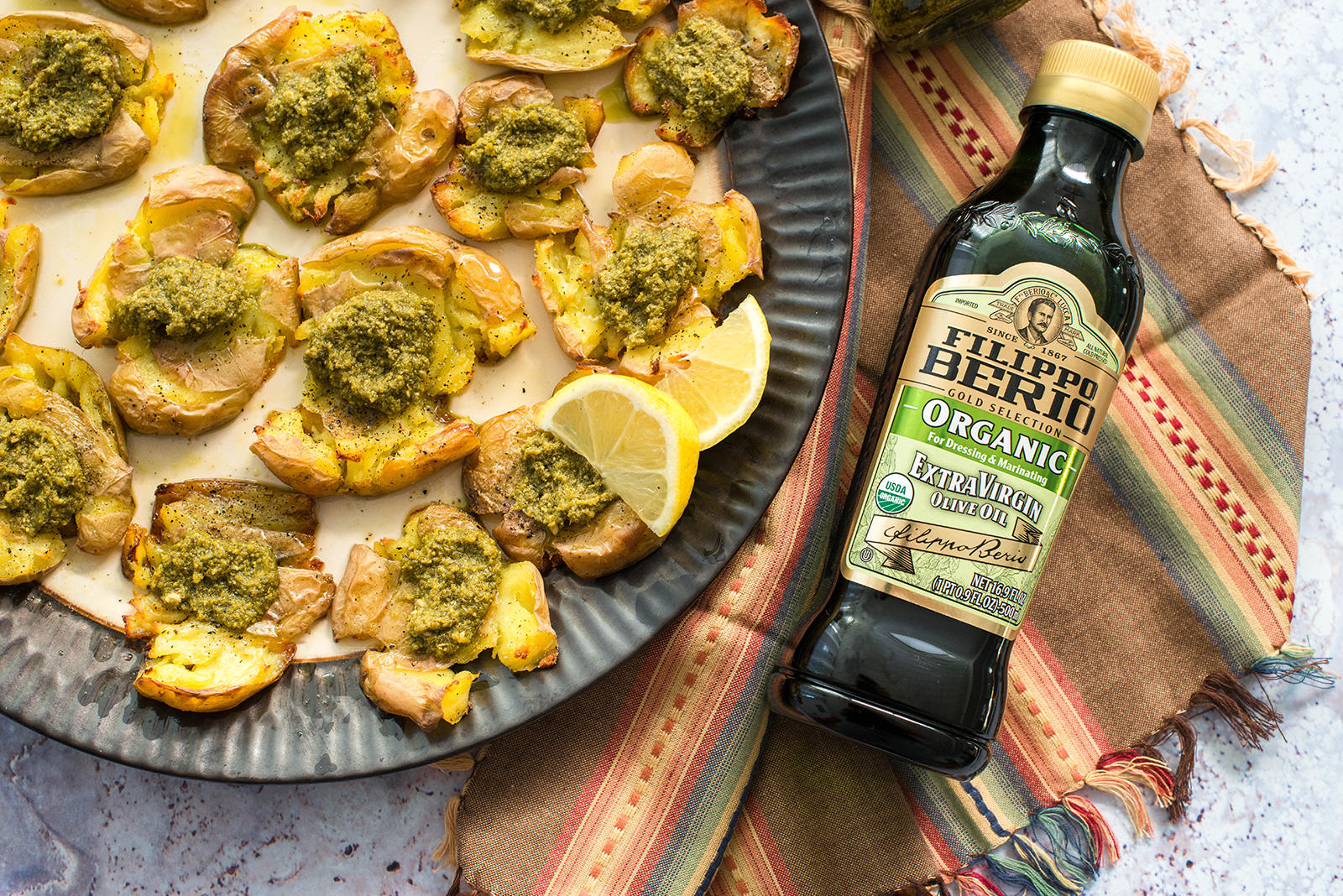 Not only are these crispy smashed potatoes delicious and flavorful, they are so easy to make and it only takes five ingredients. What makes these so simple to prepare? Filippo Berio Organic Extra Virgin Olive Oil and Filippo Berio Classic Pesto.