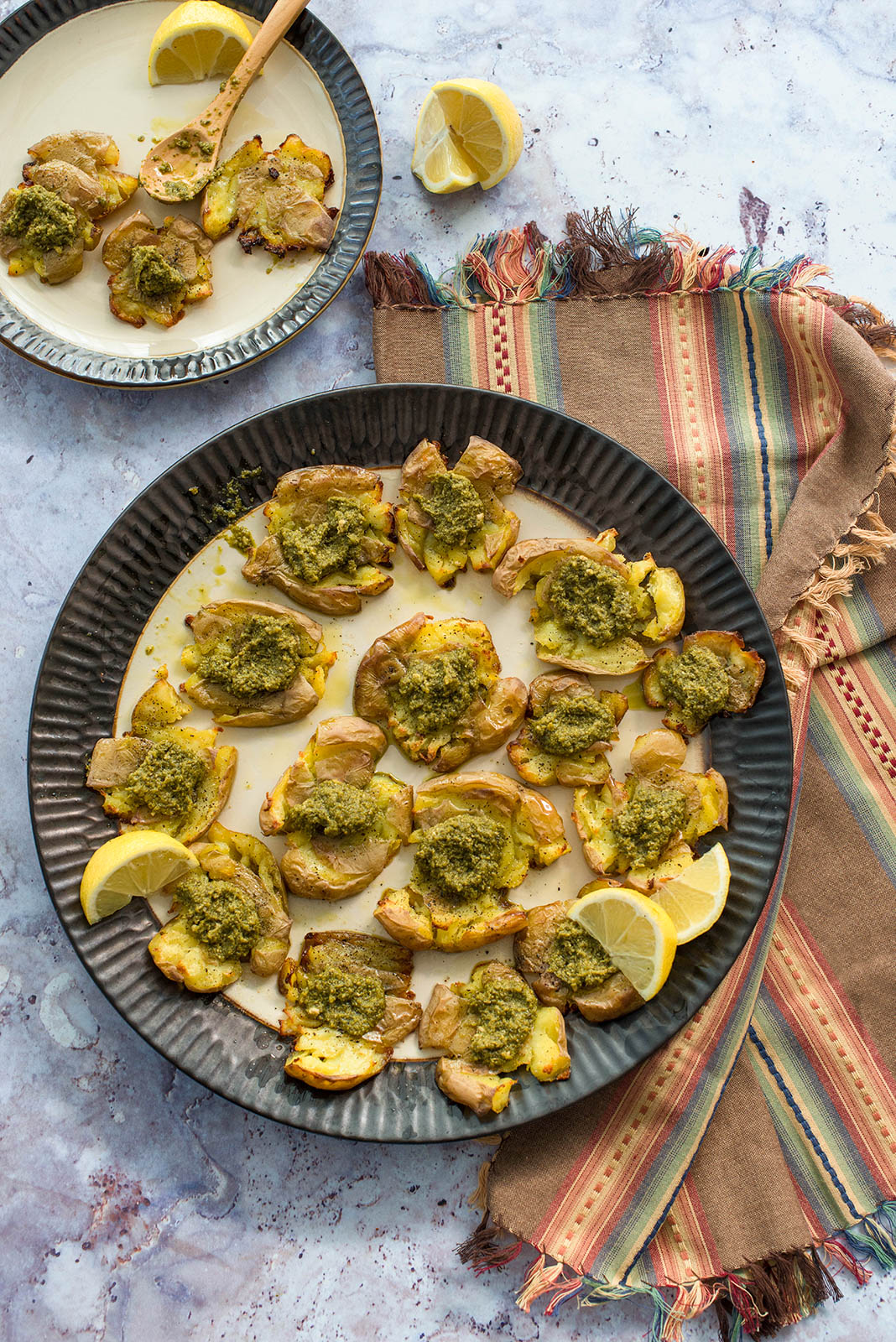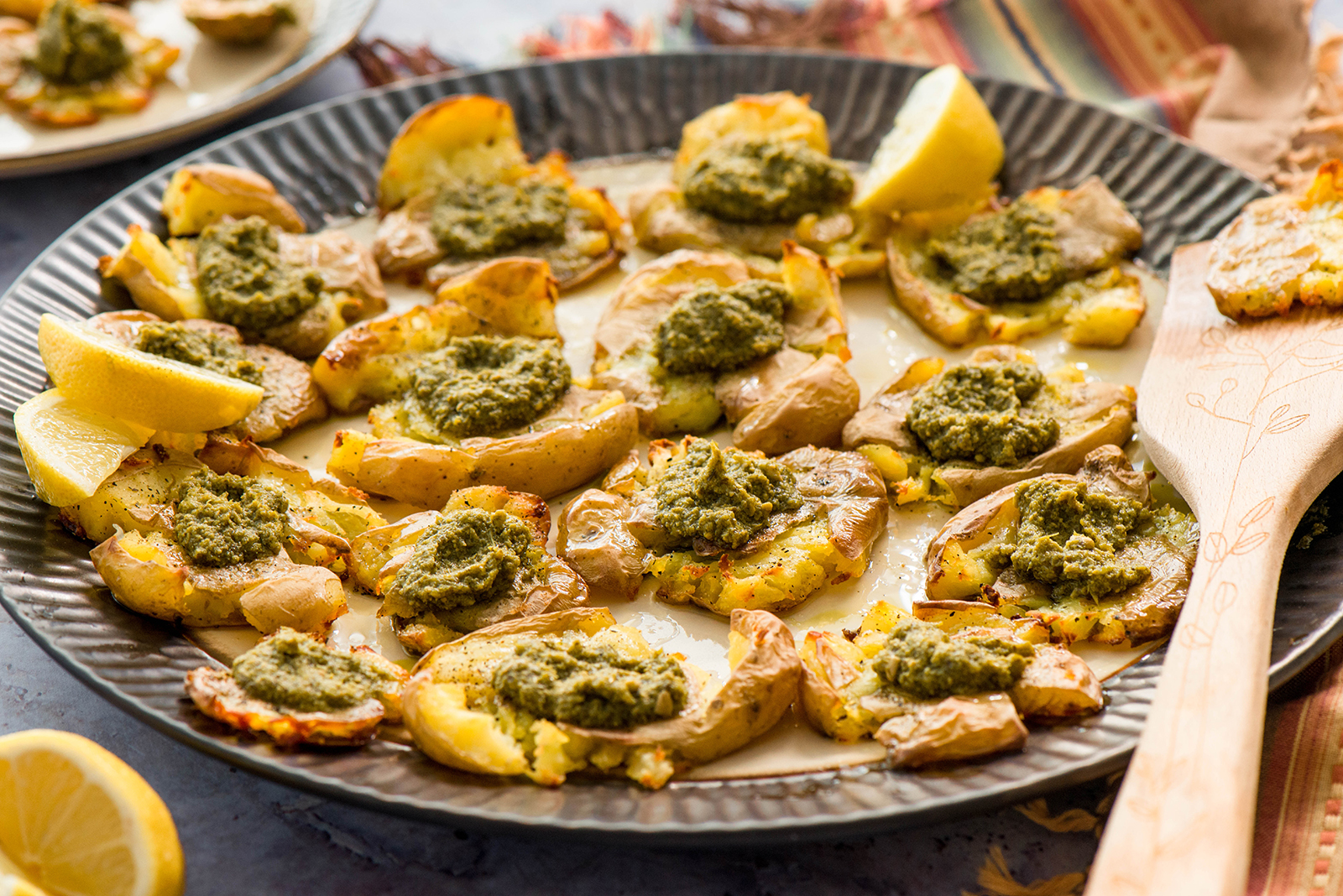 Make this delicious appetizer for your next gathering. Crispy and golden smashed potatoes topped with a flavorful pesto and a sprinkle of lemon juice. A perfect bite for each one of your guests.