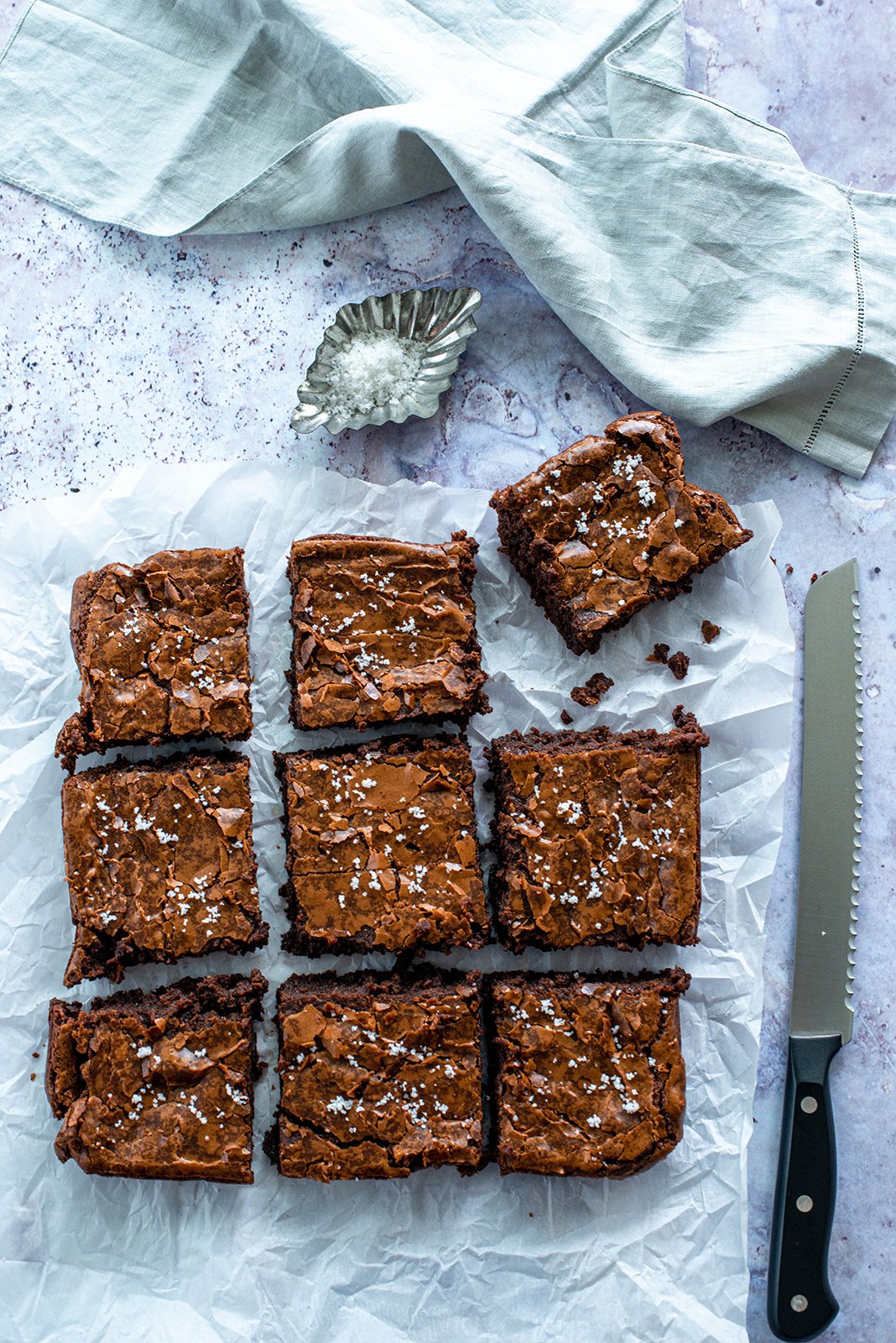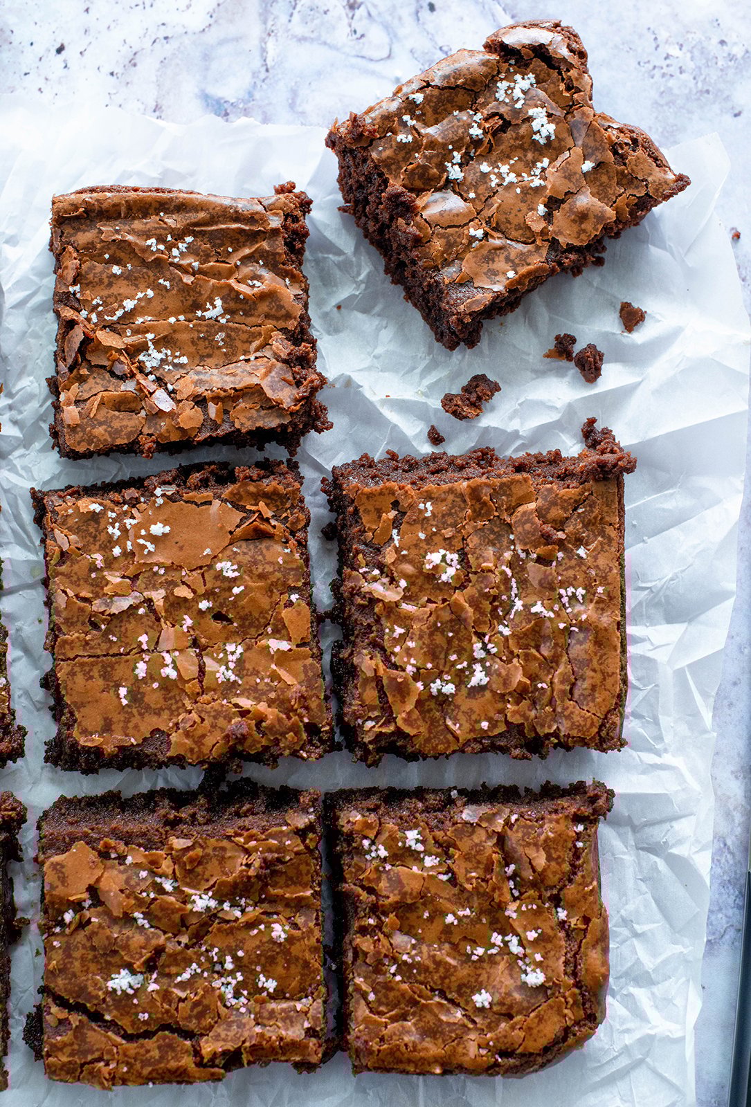One of the many things I love about these brownies is that little thin crust that bakes right on top. It’s heaven. They also keep well in a tight sealed container. I like to divide them with pieces of parchment paper between each slice so they won’t stick.