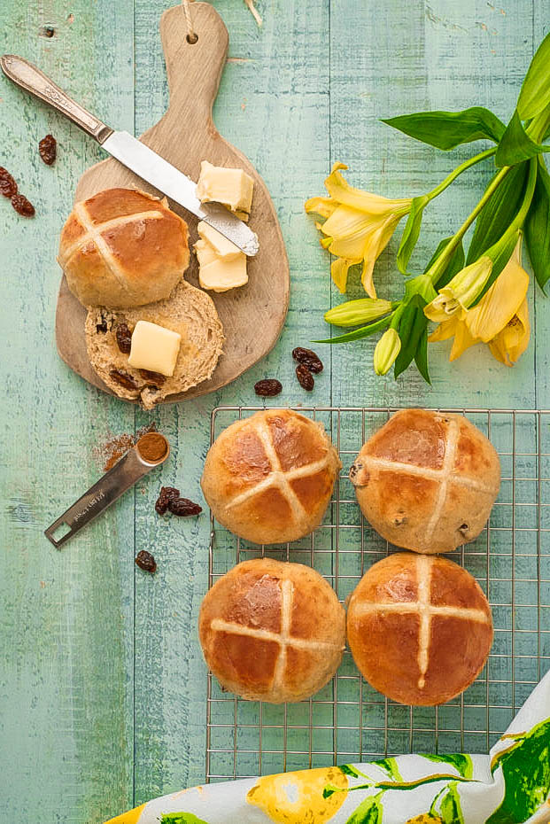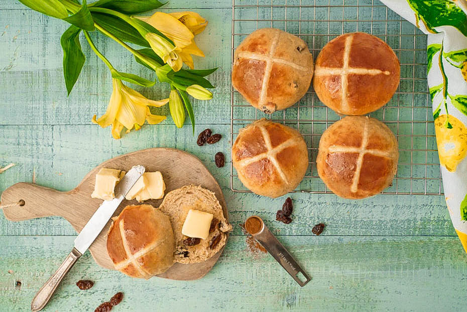 First up, hot cross buns with raisins. If you’ve never made hot cross buns, now is the time! I love to enjoy these sweet buns with my morning coffee. If you don’t have raisins in hand, use cranberries or any other dried fruit. You can also add seeds and nuts. They are so fluffy and comforting. You can always change up the decoration and pipe on a flower, a squiggle or a happy face. You can use frosting as well. Your choice.