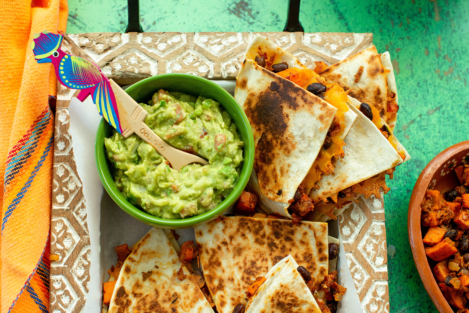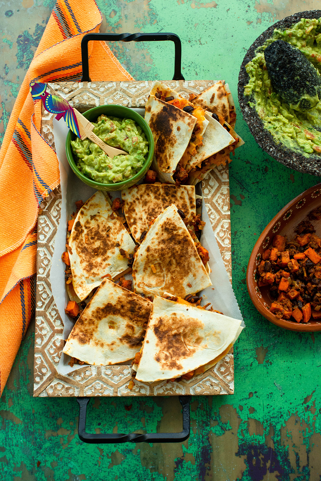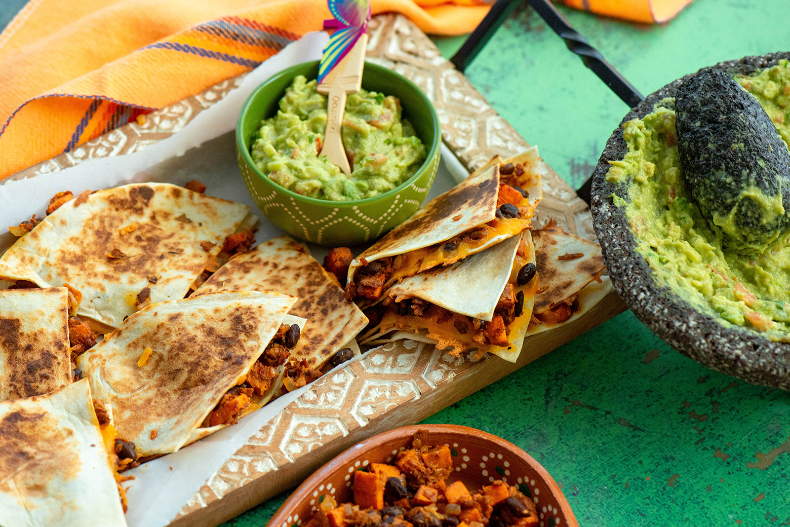 A flavorful family spread: Sweet Potato, Black Beans and Chorizo Quesadillas