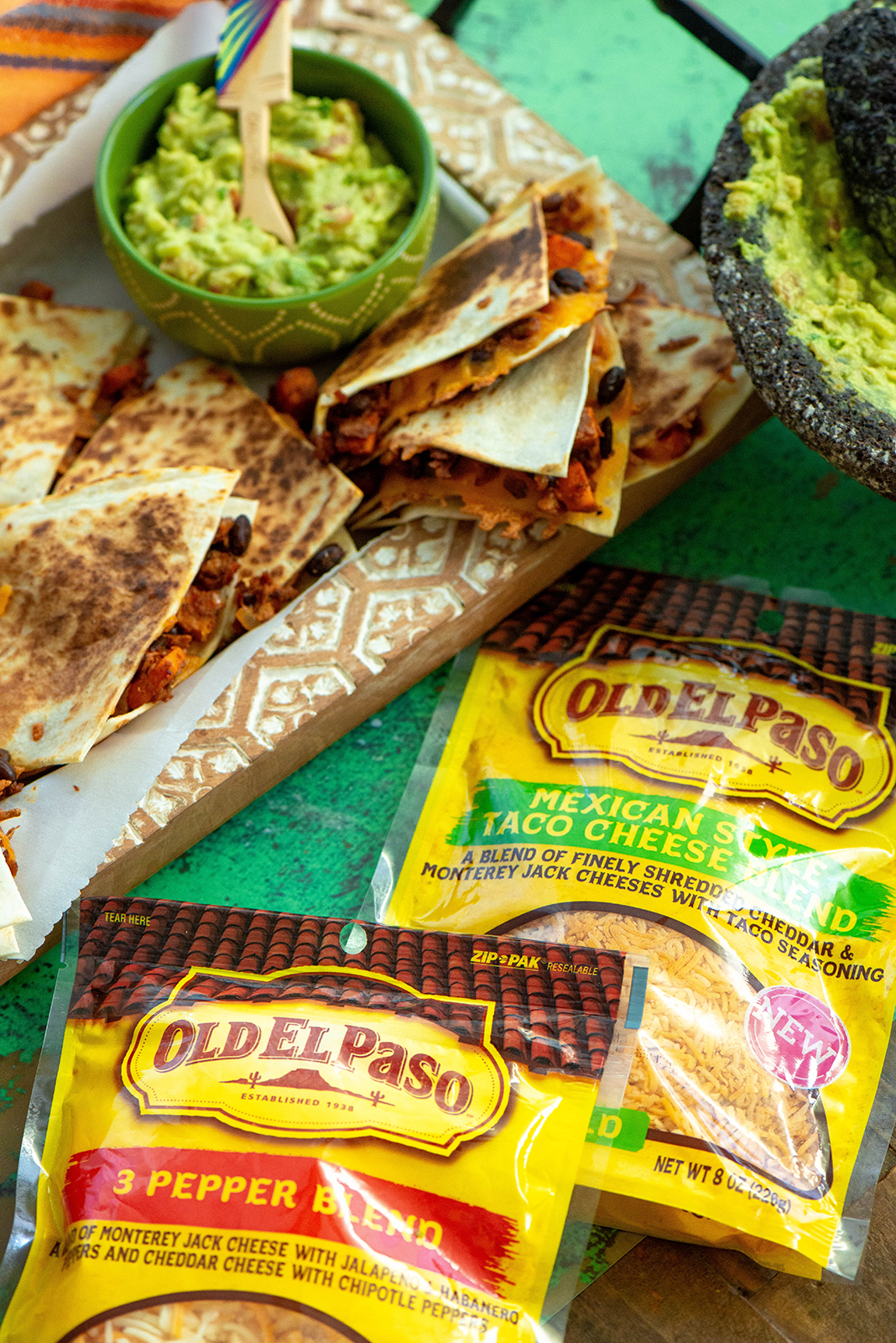 I’ve been cooking with Old El Paso’s new line of shredded cheeses these past few weeks. I love them all! My favorite for quesadillas is the 3 Pepper Blend and the Mexican Style Taco Cheese Blend. They are so flavorful and really balance out the sweetness of the sweet potato. The chorizo and a spicy guacamole are great compliments.