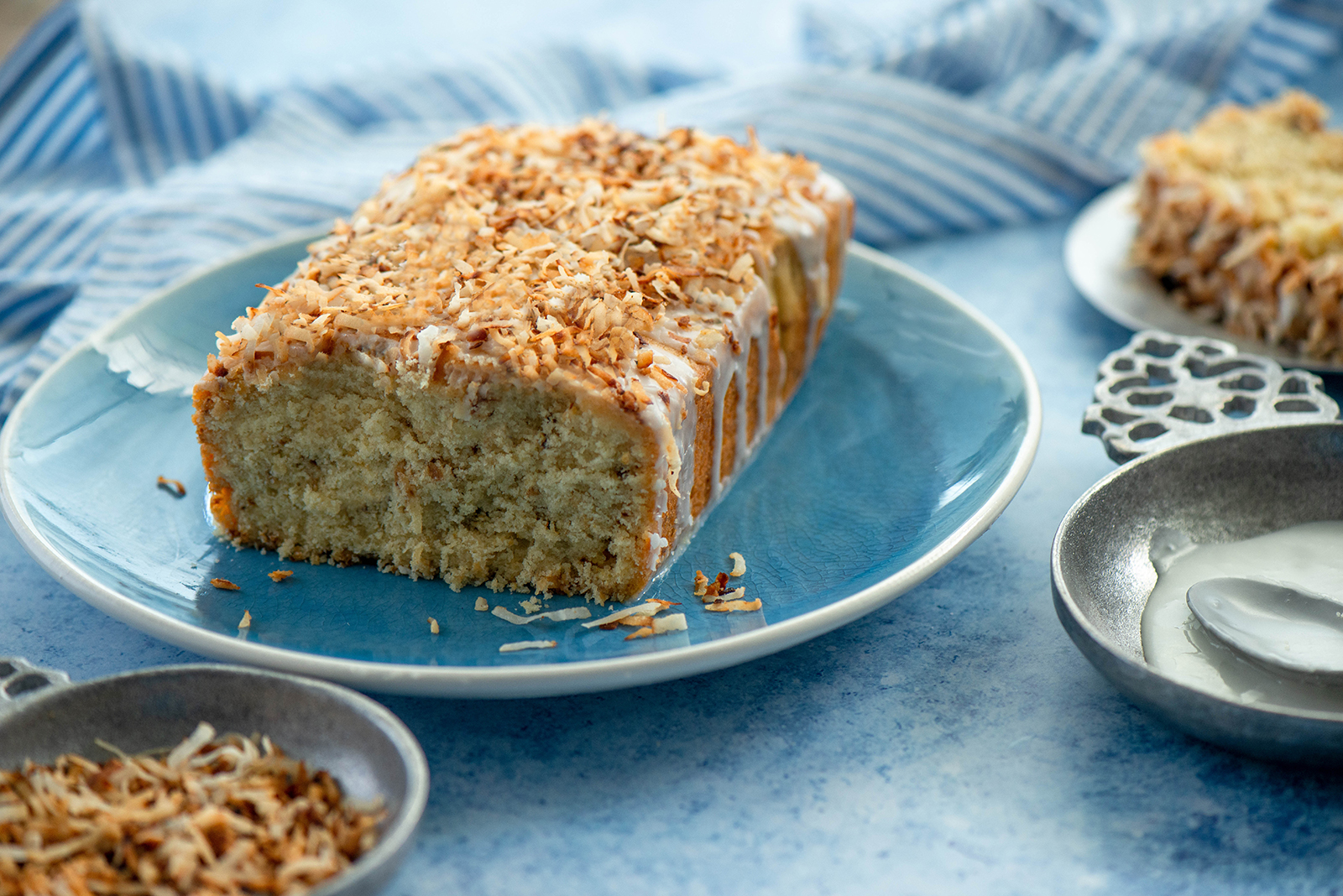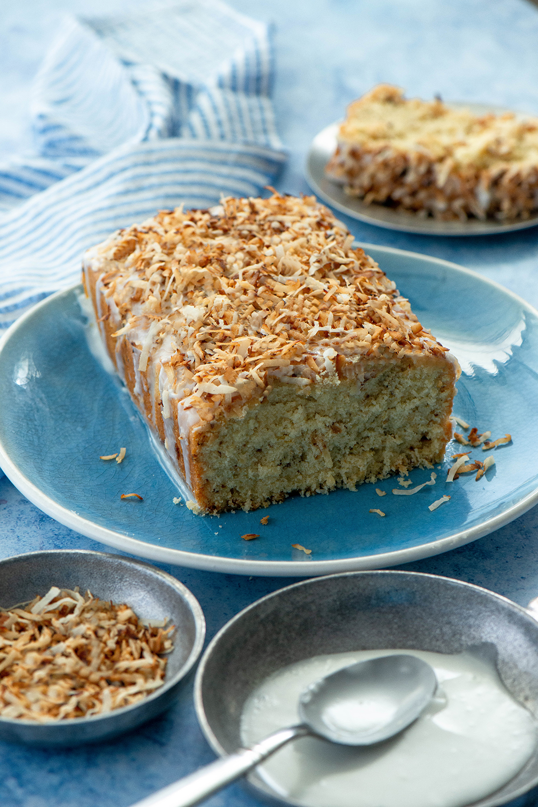 Sweet coconut inside and out this decadent dessert. Topped with a sweet coconut milk glaze and what else? More coconut!