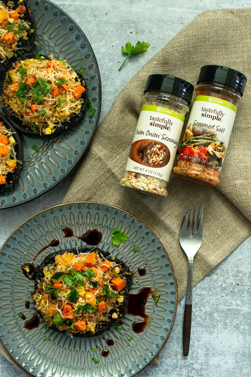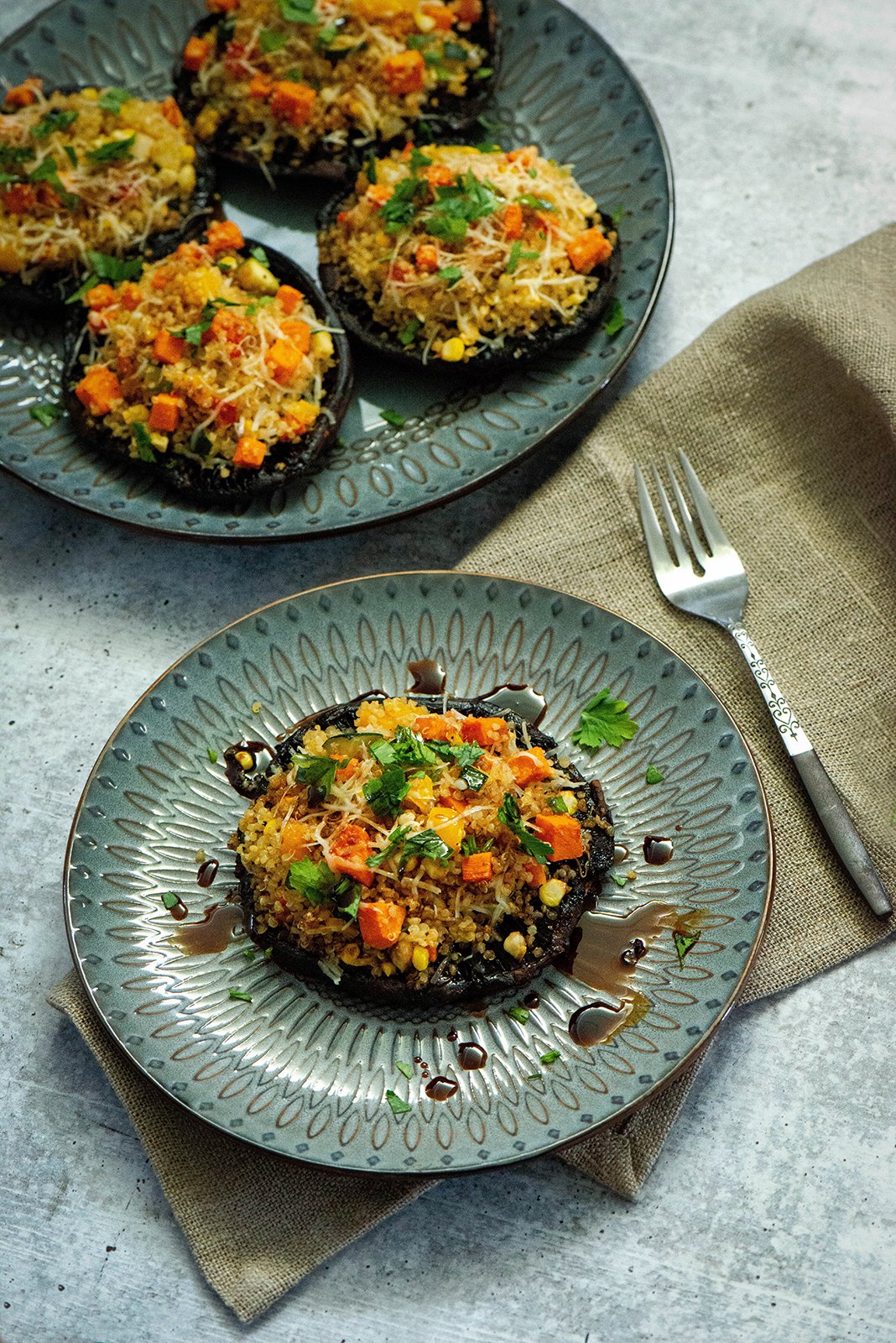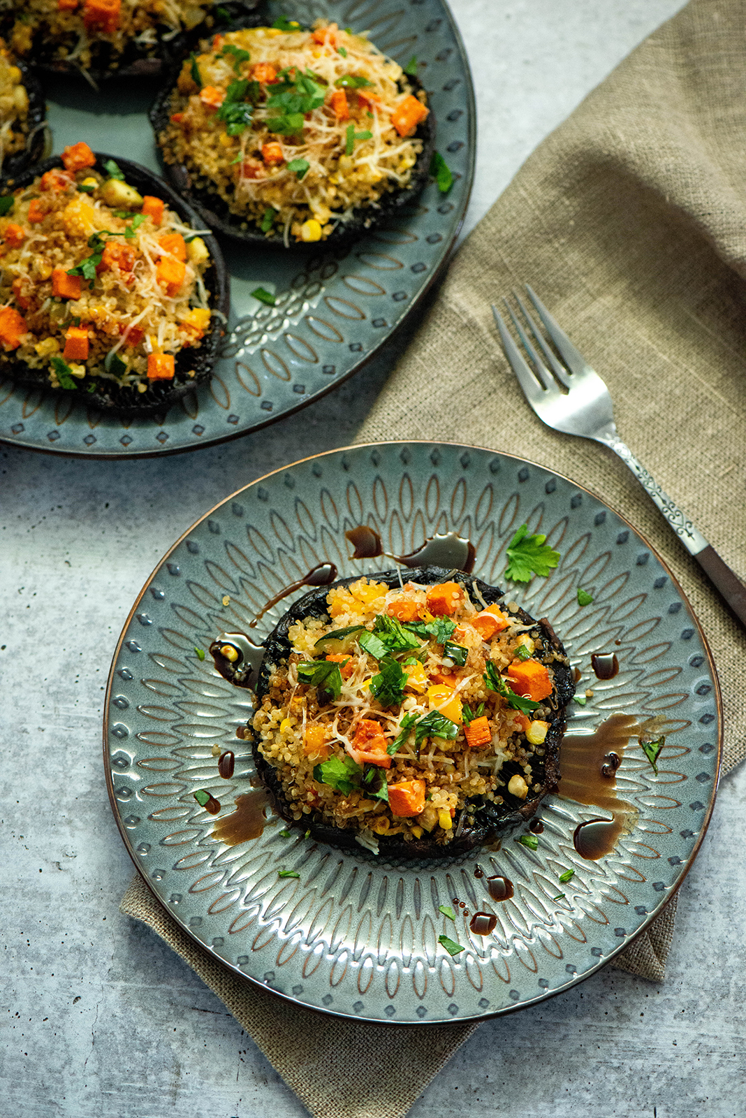 Flavorful portobello mushroom caps stuffed with colorful veggie quinoa.