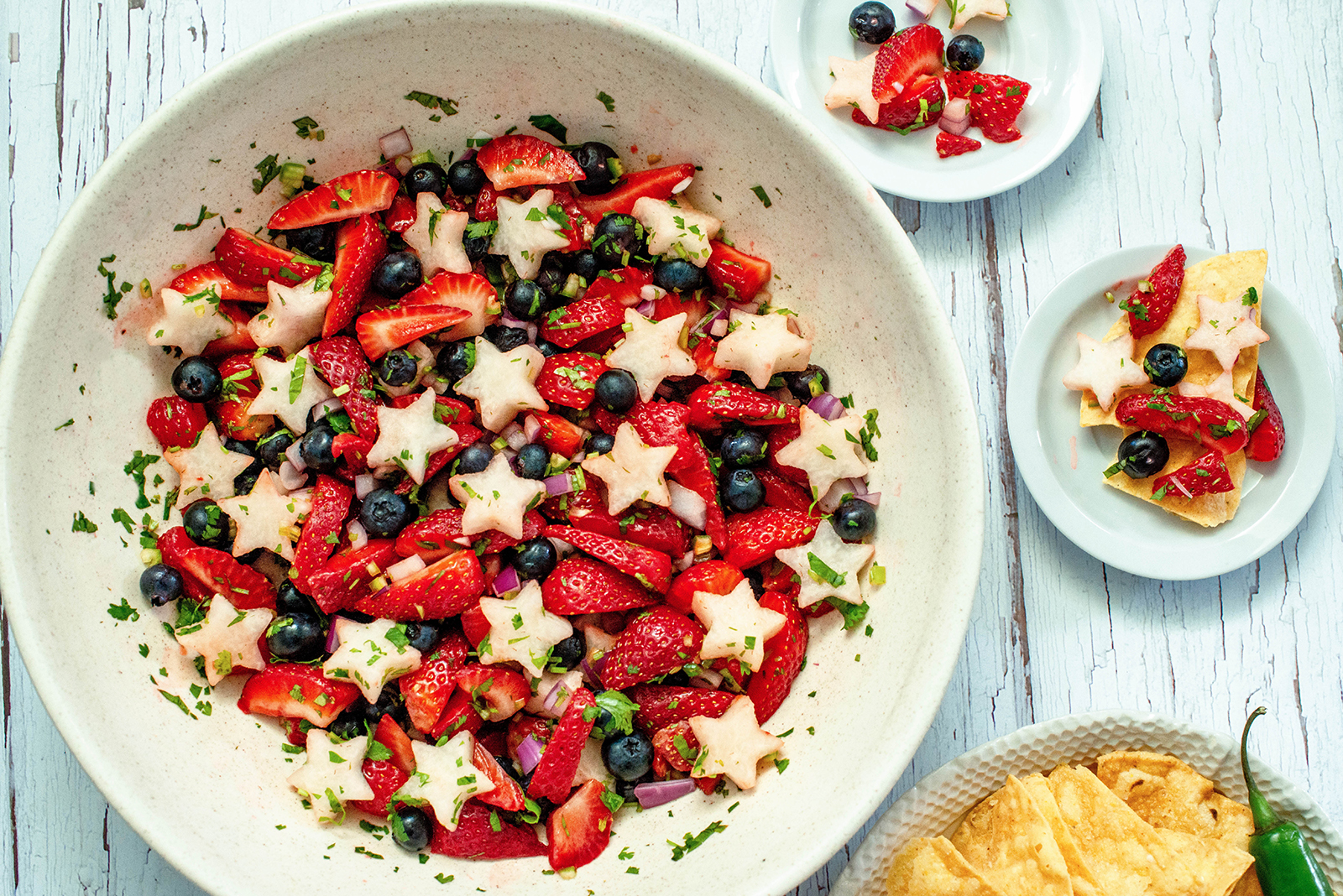 Sweet blue berries and strawberries and spicy serrano pepper and a delicious jicama crunch make this festive salad the hit of the picnic.