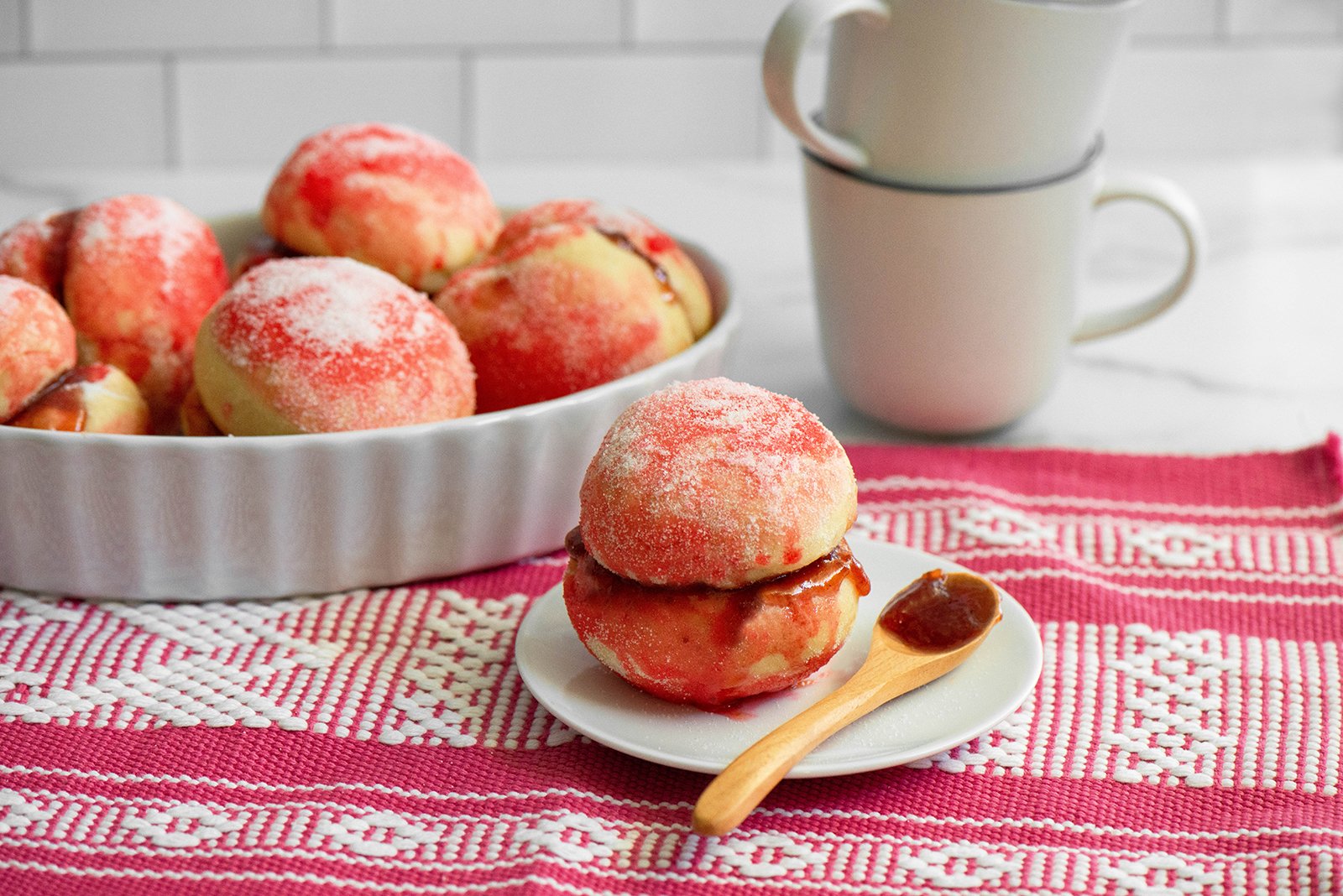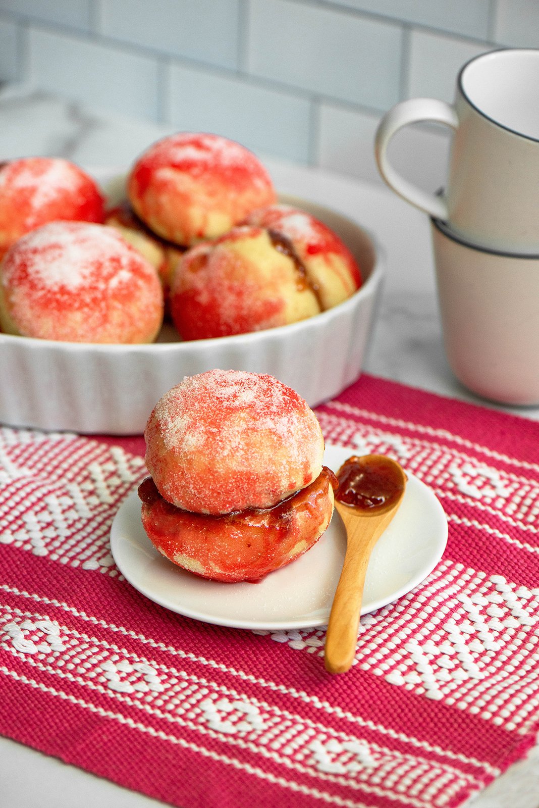 - In a working surface, place strawberry syrup and sugar in separate shallow bowls. Quickly and carefully, lightly dip smooth sides of breads into strawberry syrup then immediately cover with sugar. Set aside to on a serving plate and let sugar and syrup set for a few minutes.
