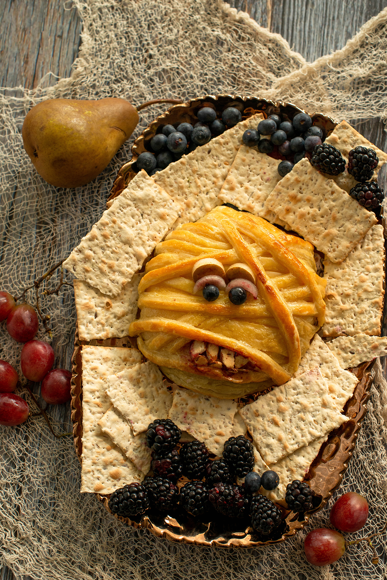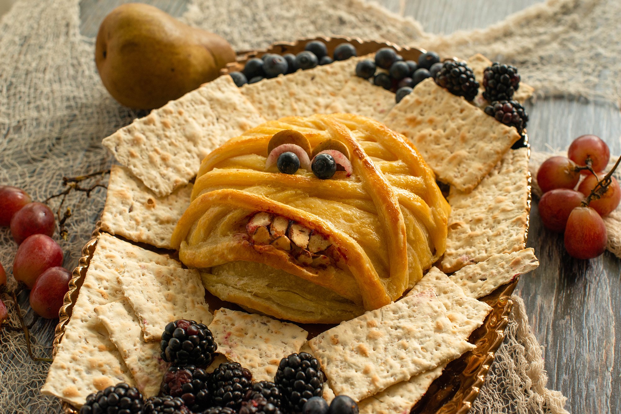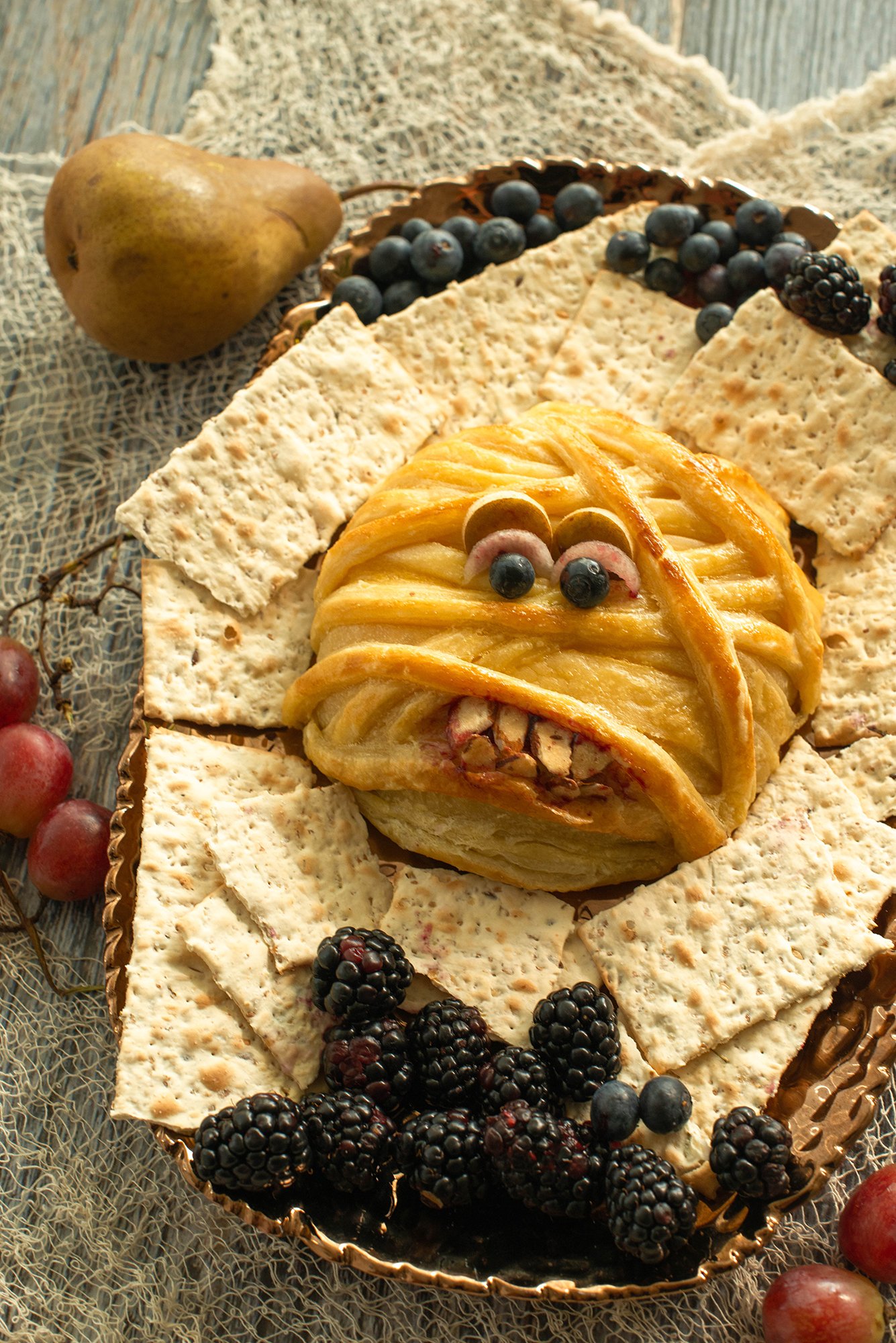 Scare up some fun this Halloween with a pastry puff baked mummy brie. Stuffed with blackberry preserves and your favorite crackers.