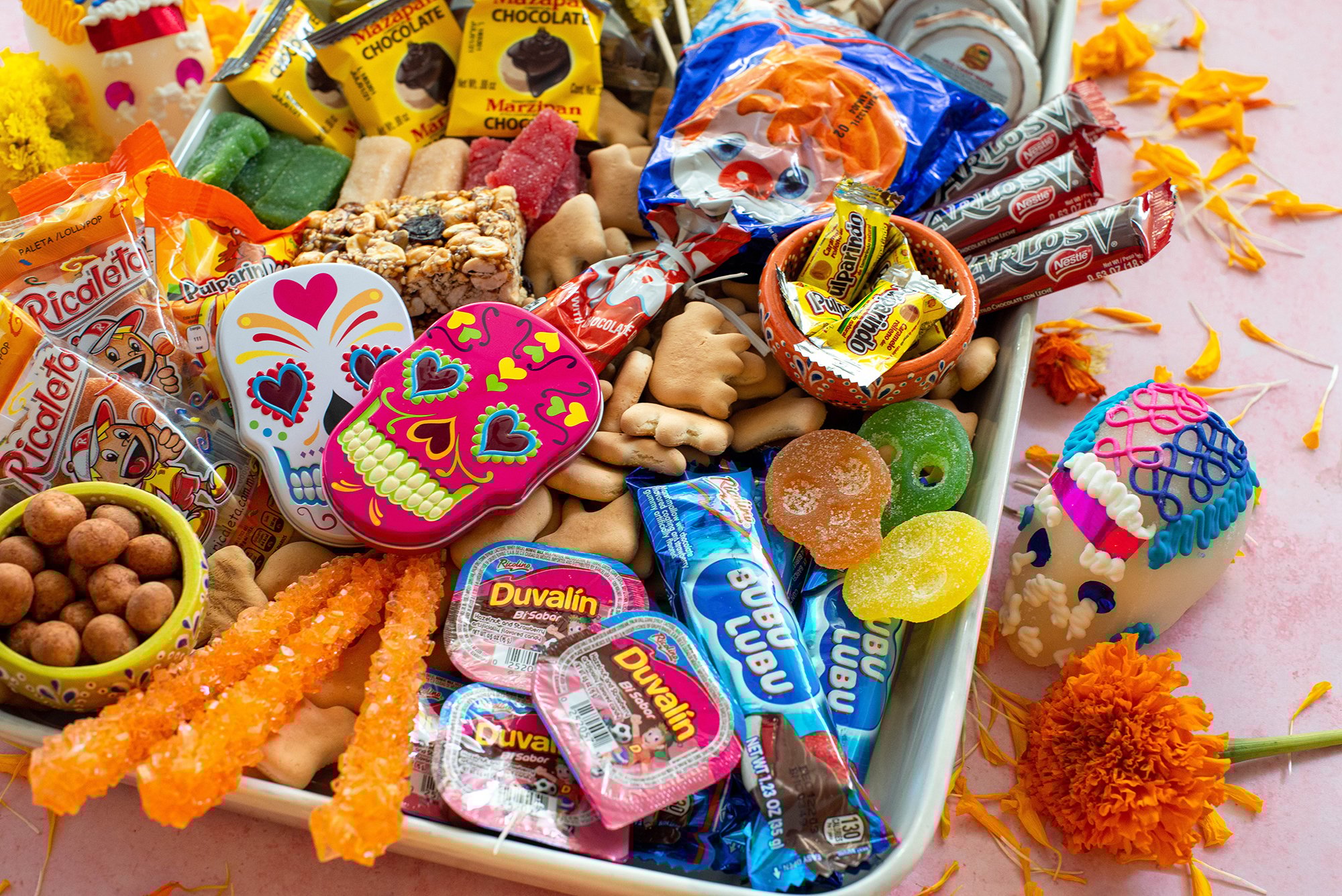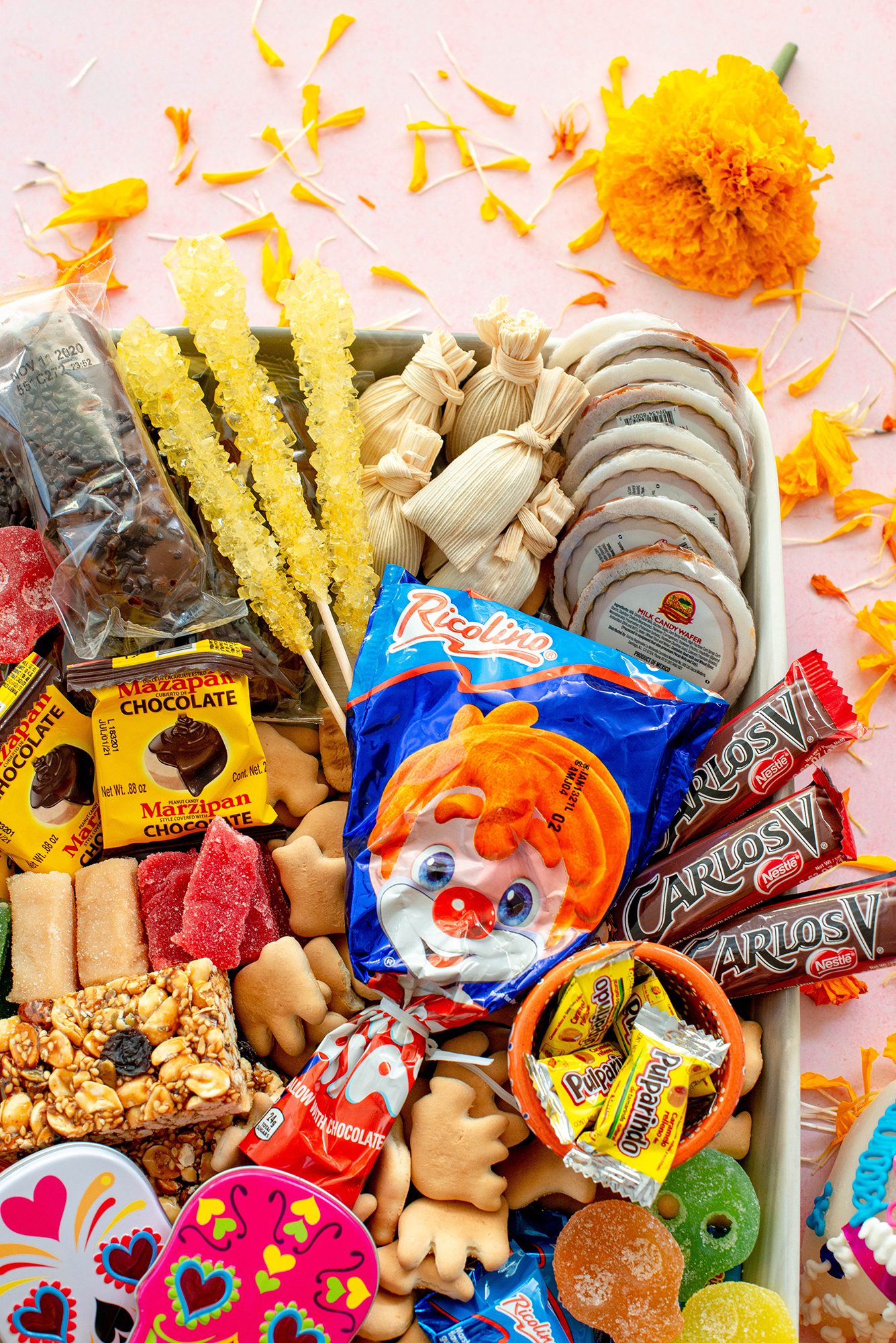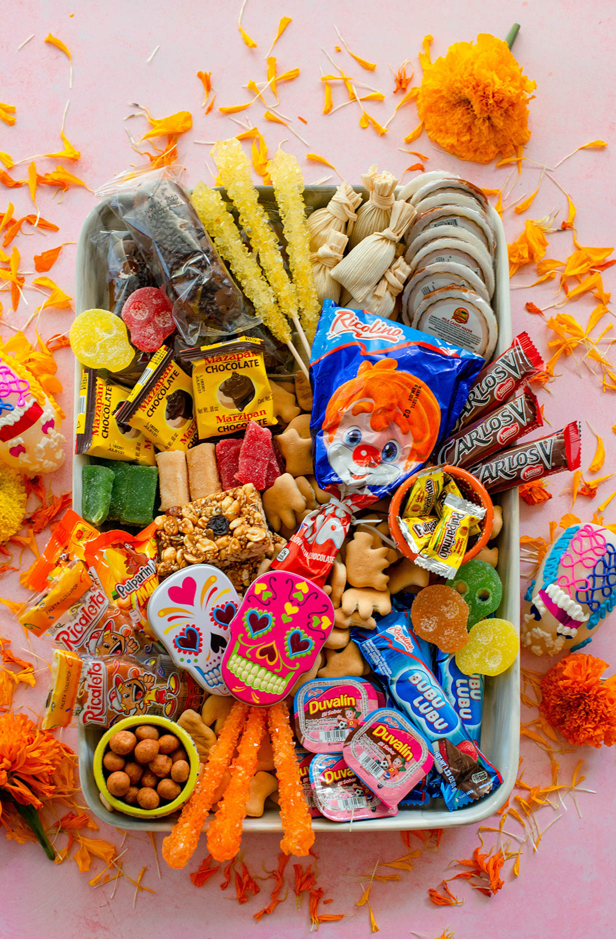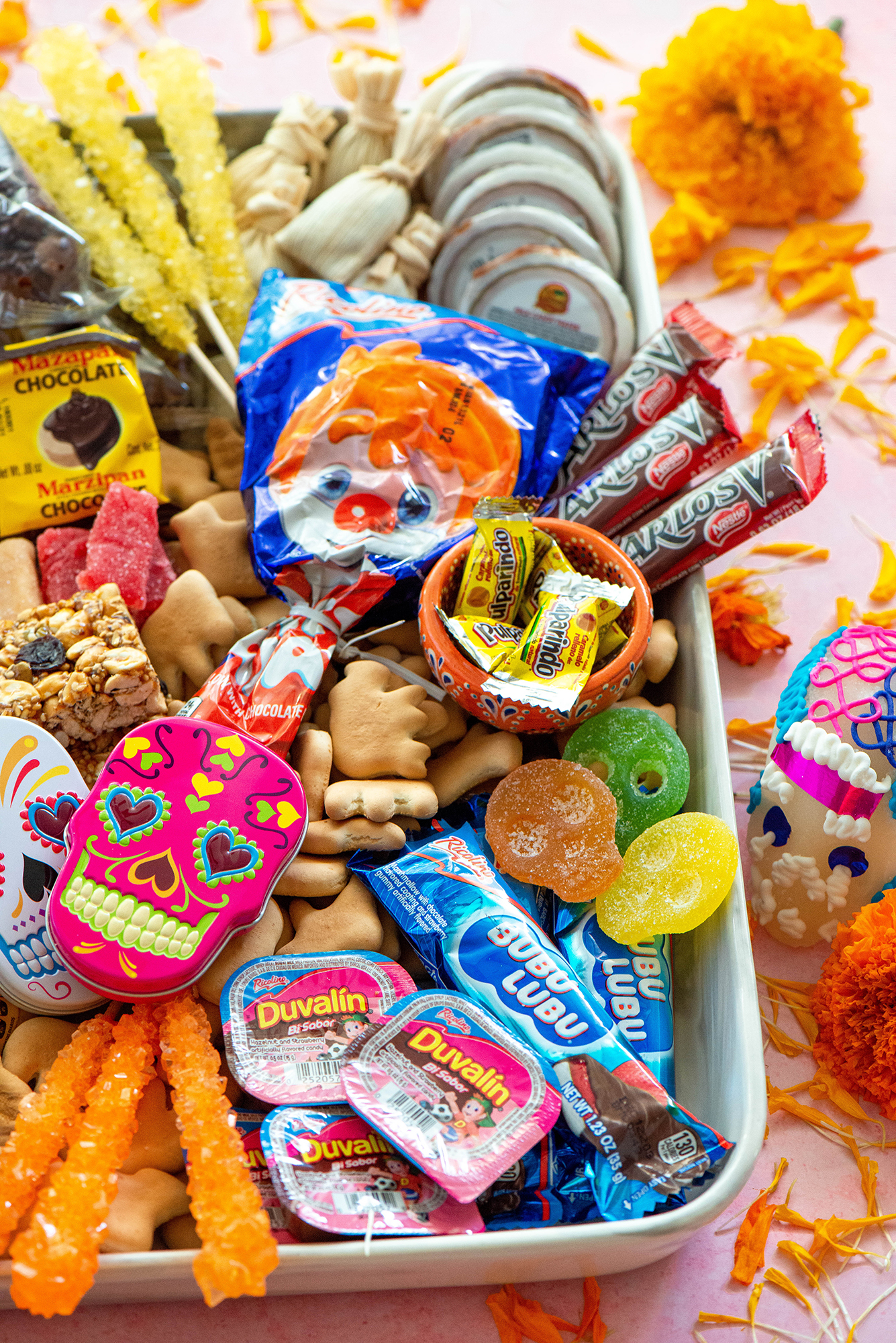 I was able to find a good variety of treats at one of my favorite candy stores, Loteria Candy Co. They ship! The sugar skill tins and rock candy I purchase through Amazon and the rest, galletas de animalitos, pepitoria, flowers and sugar skulls at my local Latin grocery store Northgate Market.