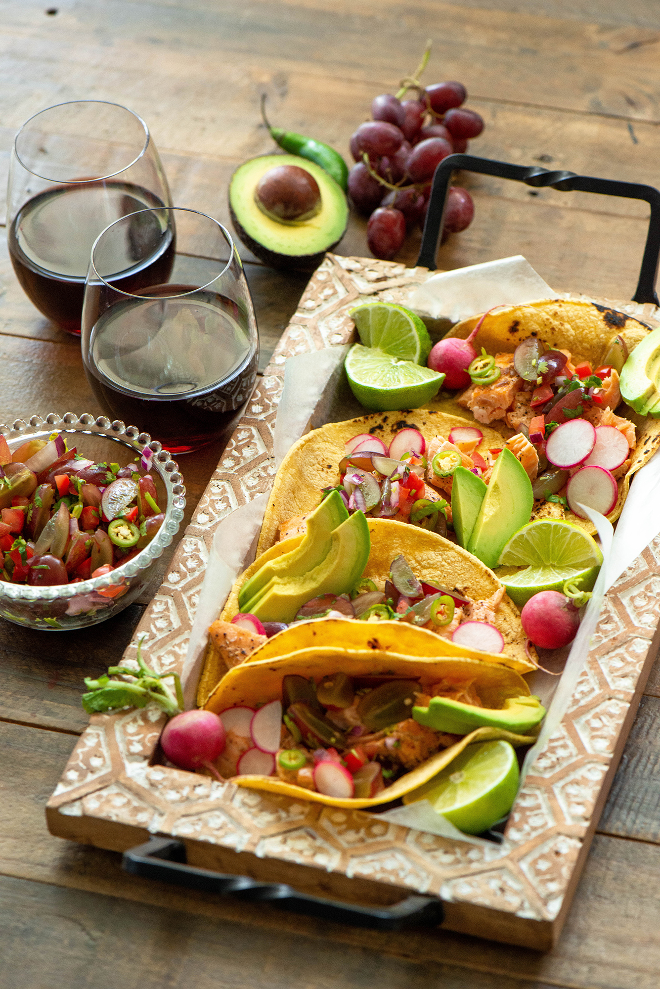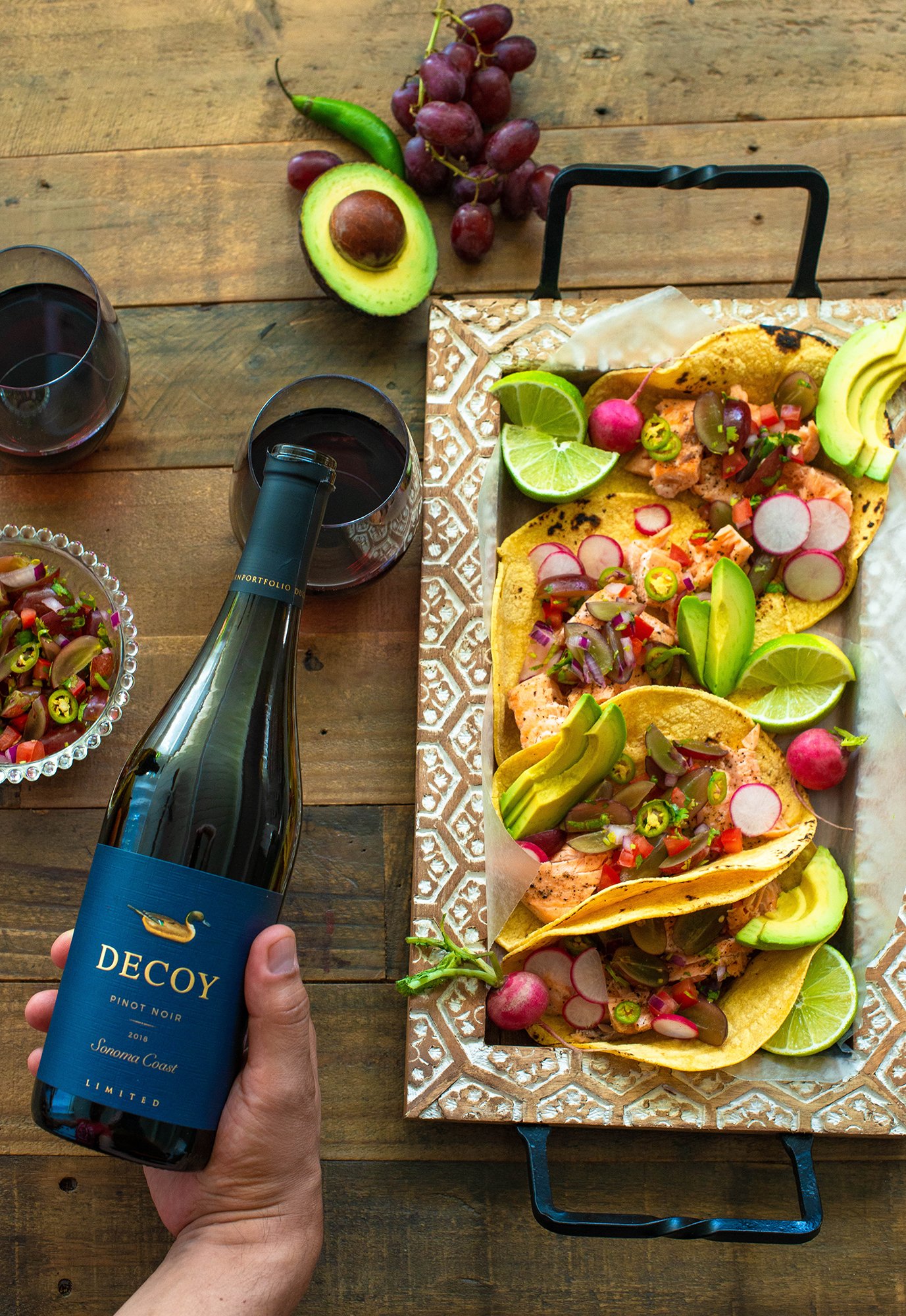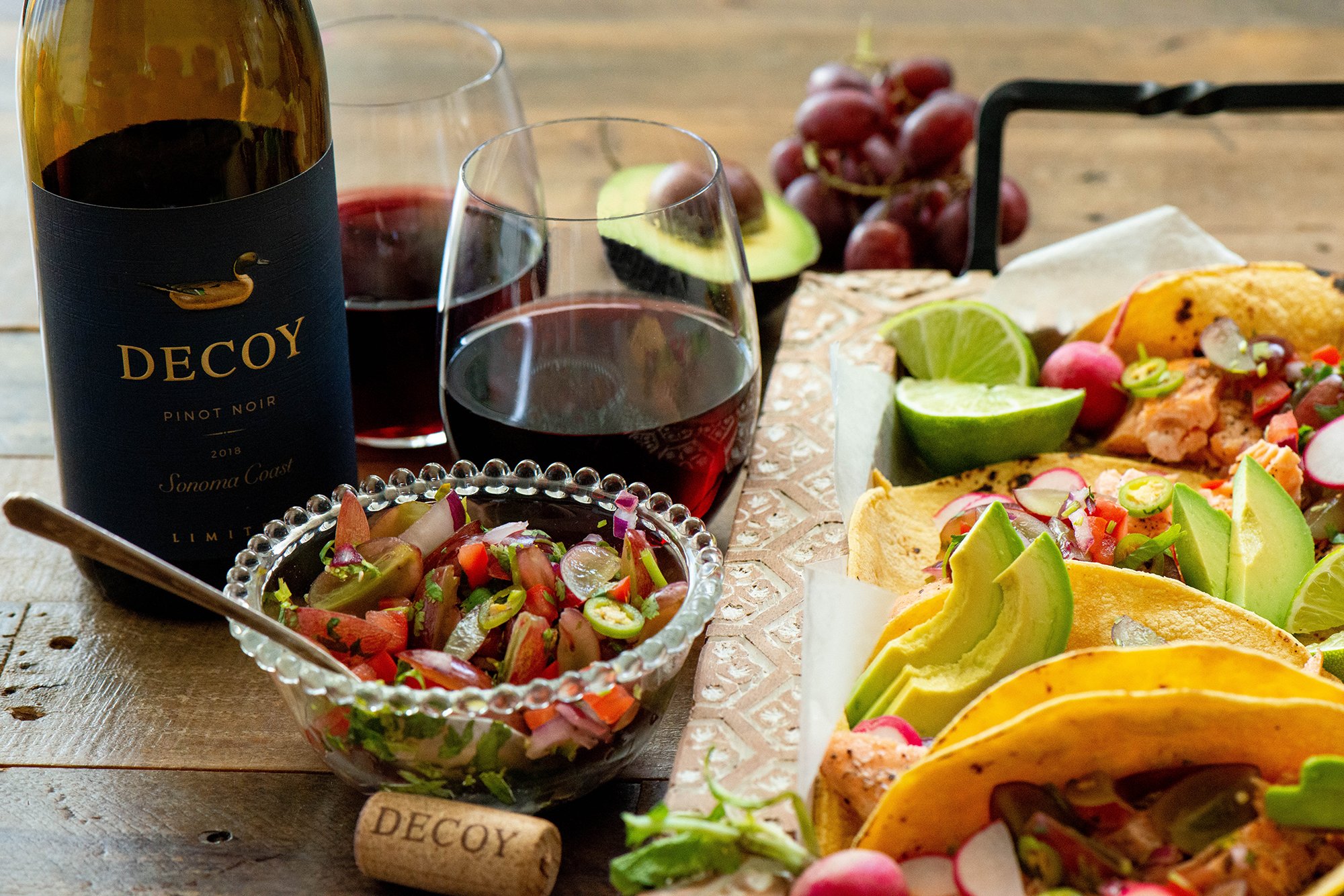 Elevate a special evening with Salmon Tacos with Grape Pico de Gallo and Decoy Wine