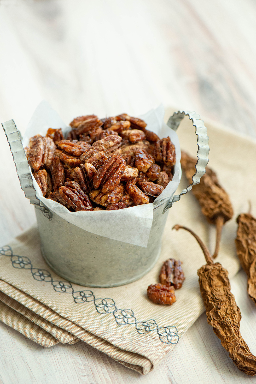 Since Thanksgiving and Christmas will eventually meld together this year, I decided to share this recipe of sweet chipotle pecans to get you through the rest of the year. I like to make big batches of these extremely addictive candied pecans and enjoy them while I decorate, work or cook. They also make a wonderful edible gift. You can package them up in cellophane bags, tied with a cute holiday ribbon or place them in an elegant, festive jar.