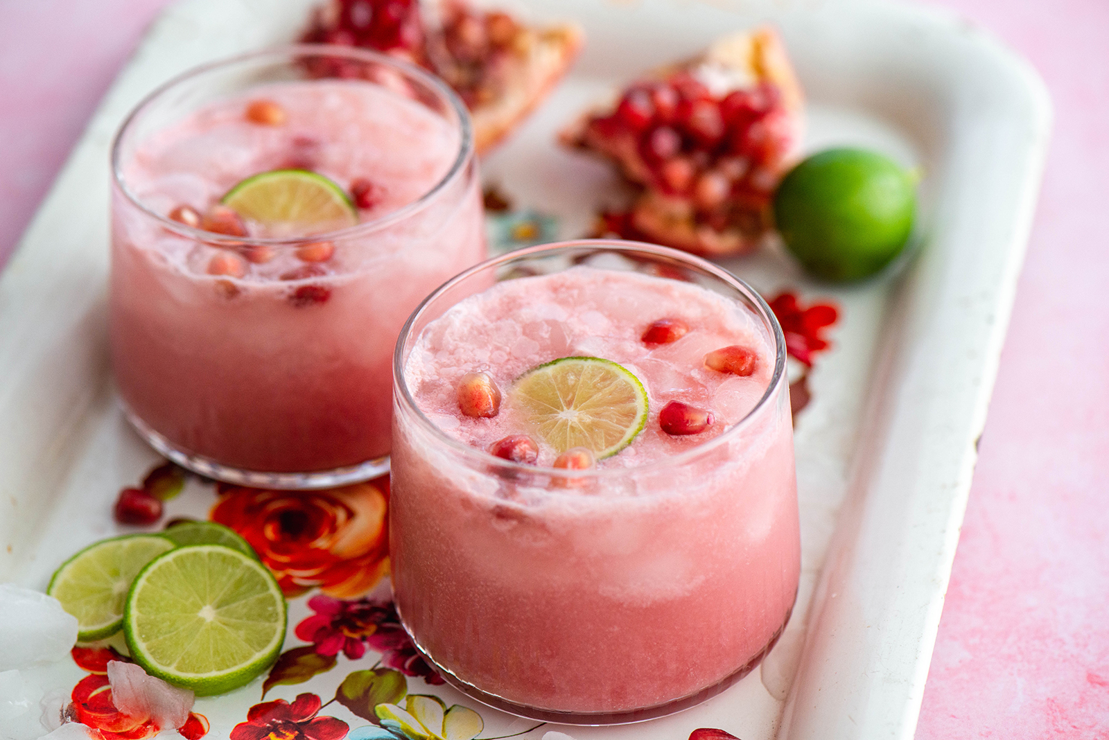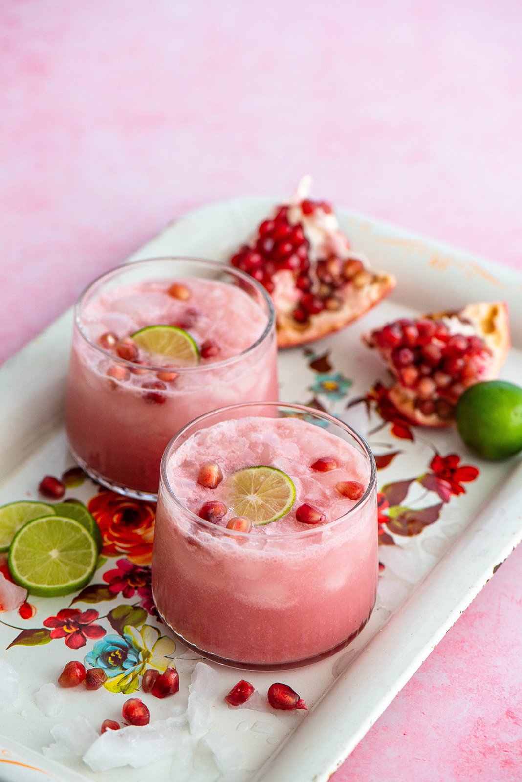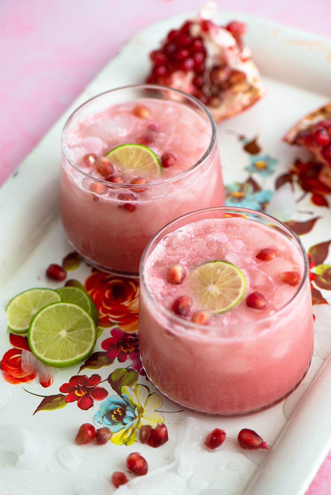 Serve over ice. Garnish with lime slices and pomegranate arils.