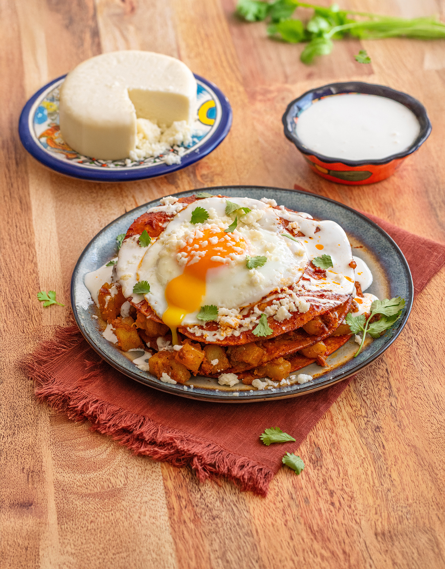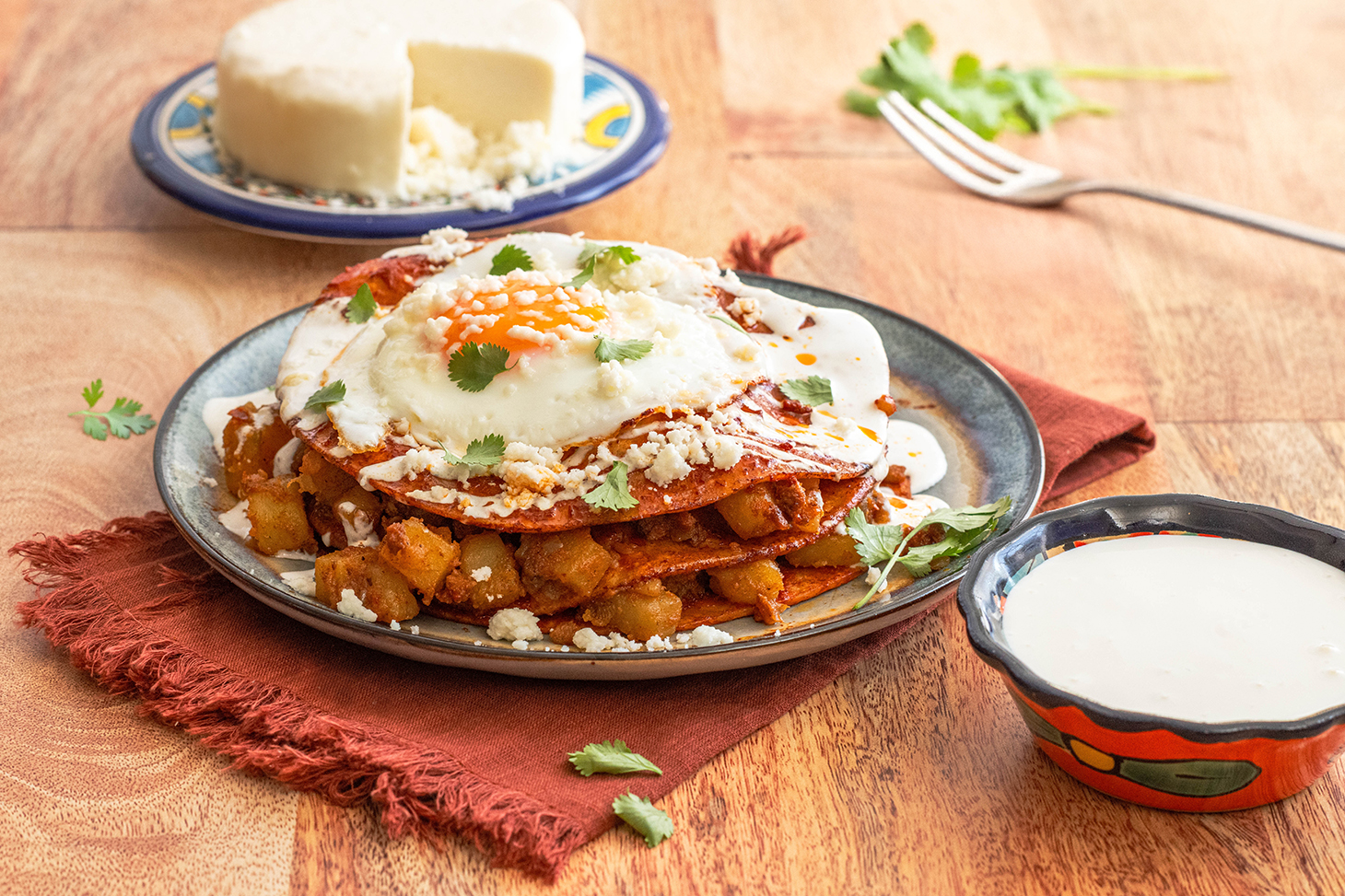 Three layers of crispy, sauce-dipped tortillas, filled with golden potatoes and flavorful chorizo, stacked high and finished with a perfectly fried egg, a drizzle of Mexican crema, crumbled queso fresco, and fresh cilantro. A dish that’s bold, comforting, and packed with rich flavors!