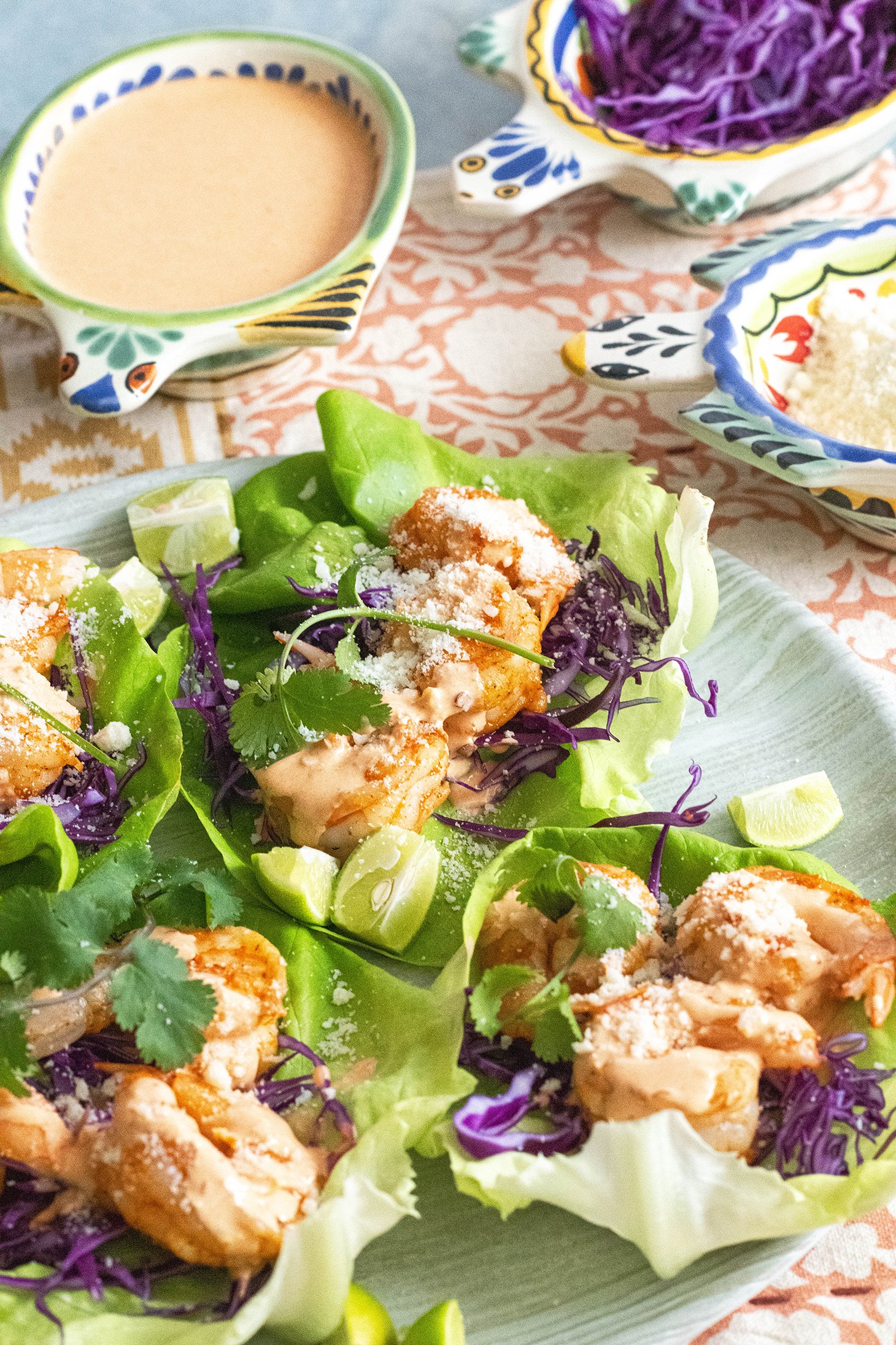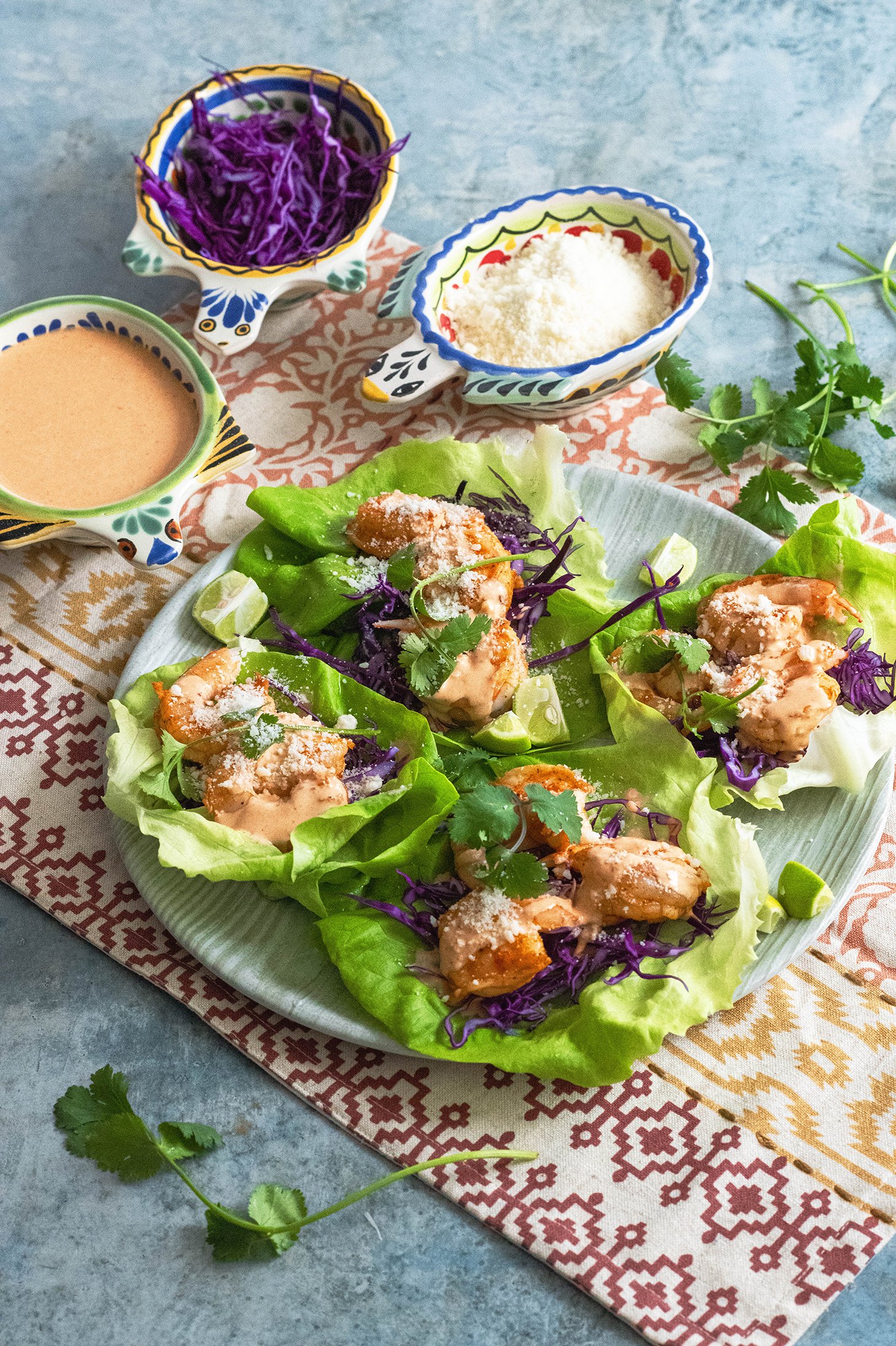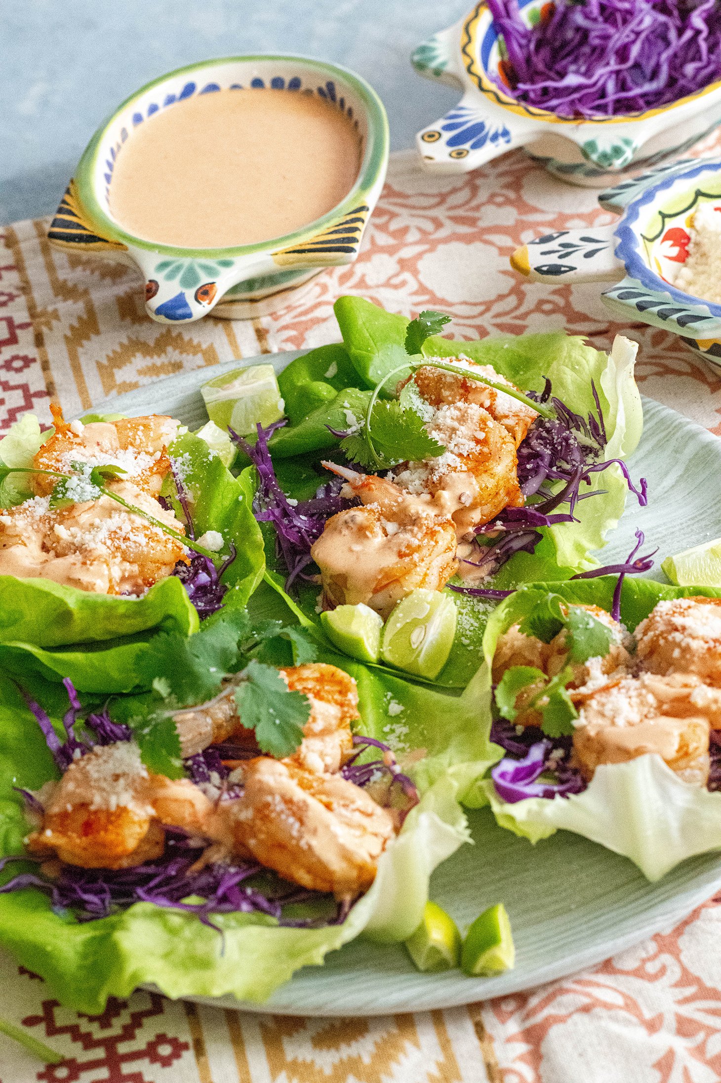 - Arrange lettuce leaves on a serving plate top with cabbage, 2-3 shrimp, a drizzle of chipotle yogurt sauce, cilantro sprig and a sprinkle of cotija cheese. Serve with lime slices for juicing.