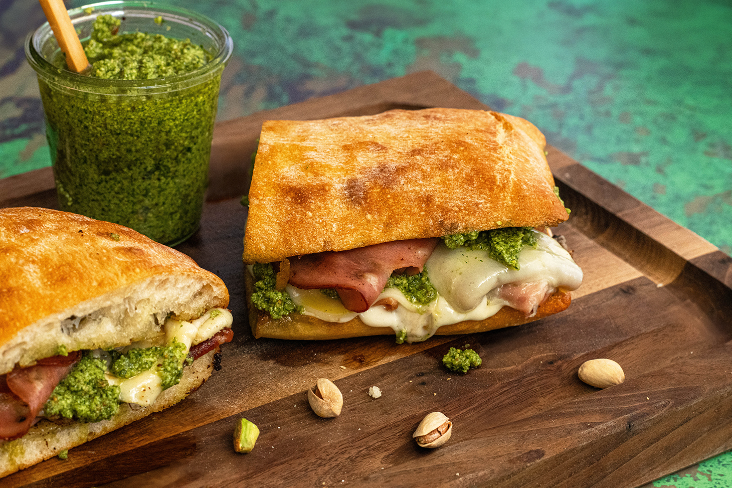Whether you’re celebrating Grilled Cheese Month or just in the mood for a satisfying lunch, this sandwich is a bold fusion of Italian deli flavors and fresh, California-sourced ingredients. The pistachio pesto brings brightness and bite, while the double cheese combo offers that irresistible gooey factor. It’s rich and melty with just the right crunch from that ciabatta. Basically, everything a grilled cheese should be and more.