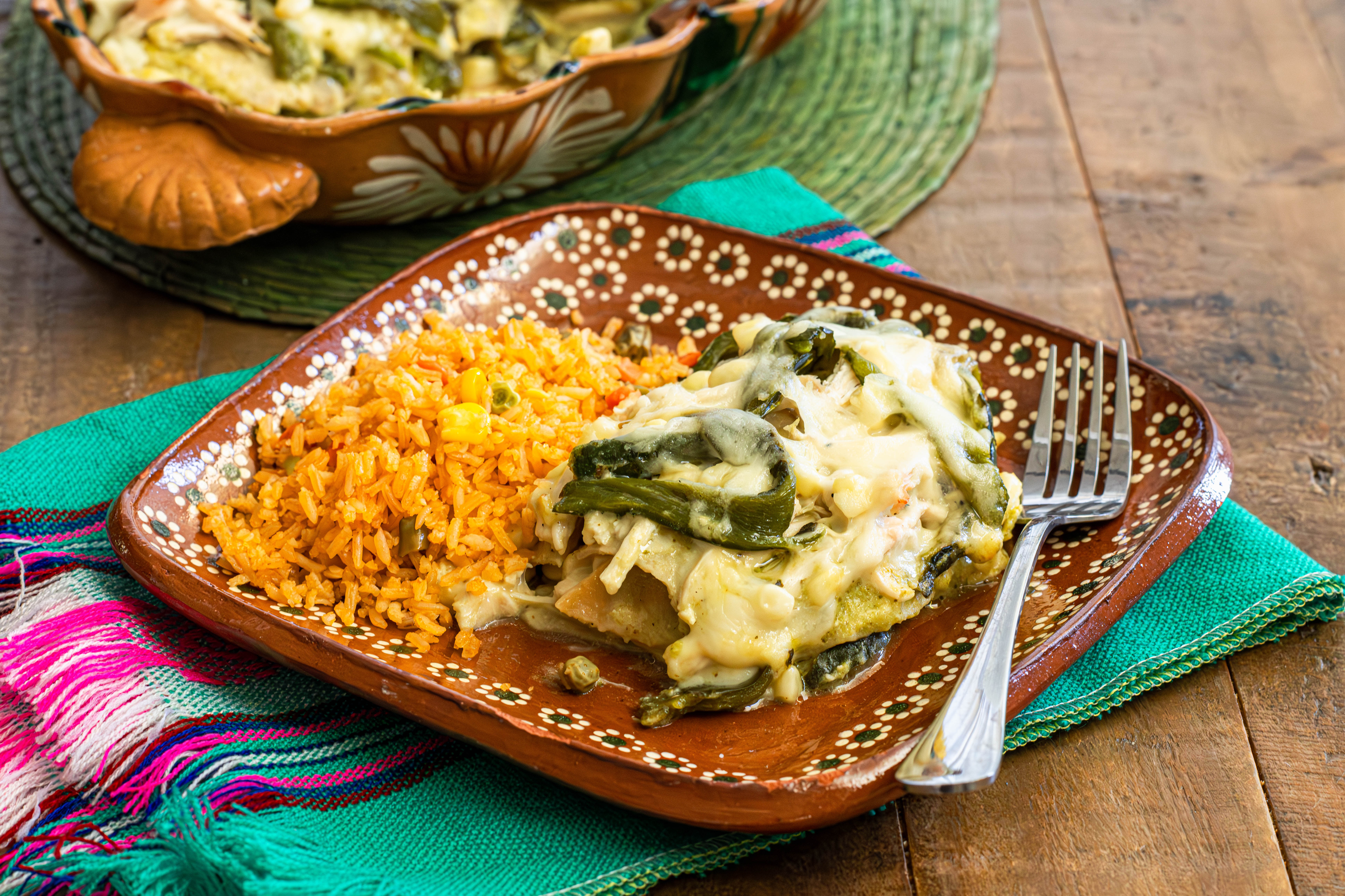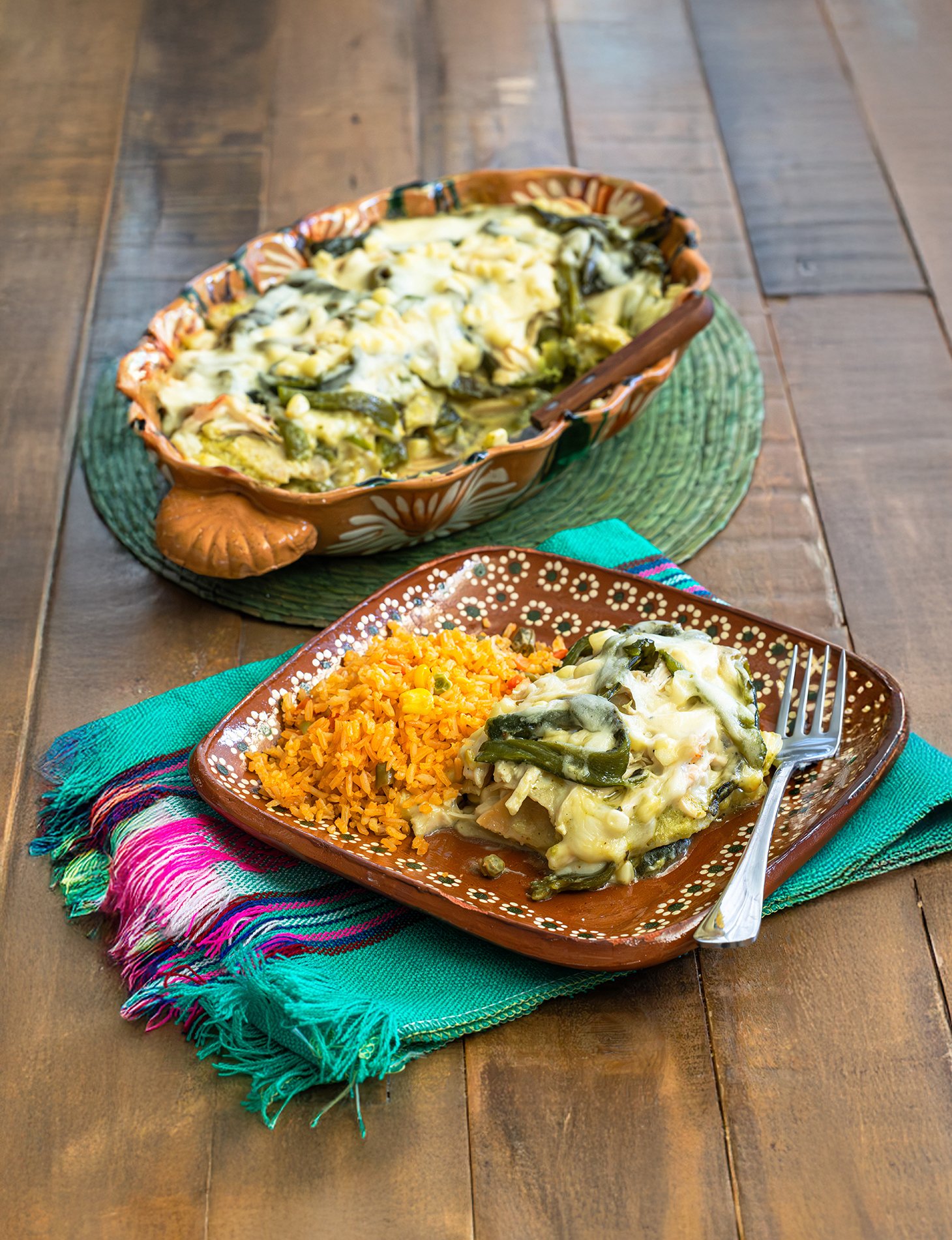 - Spoon 1/3 cup sauce into a 9×13 oven-safe dish. Spread sauce evenly. Add a layer of fried tortillas over sauce to cover the bottom of the dish (cut tortillas in half if needed). Cover with more sauce then add a layer of half of the chicken, half of the poblano strips, half of the corn and half of the cheese. Add another layer of tortillas and repeat the layers with remaining ingredients finishing with a layer of cheese.
