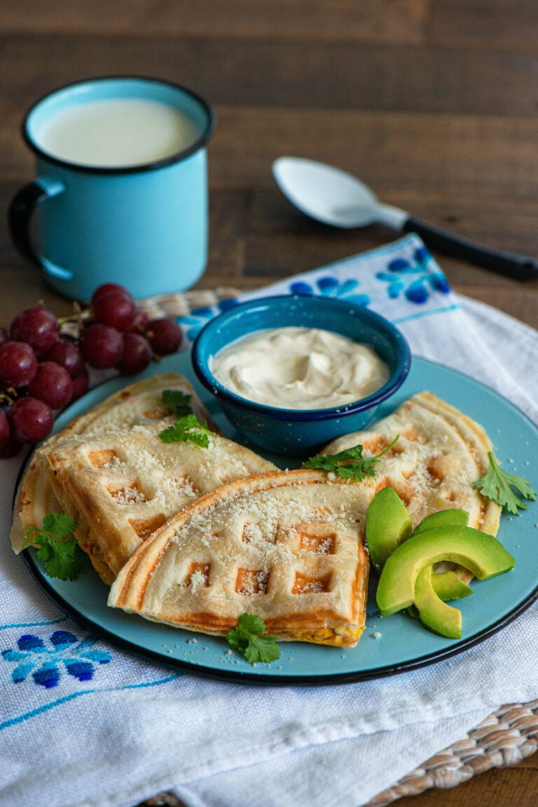 Tortillas stuffed with scrambled eggs, potatoes, and melty Oaxaca cheese, pressed to golden perfection in a waffle iron. These quesadillas are savory, fun, and easy to reheat for a grab-and-go school breakfast.