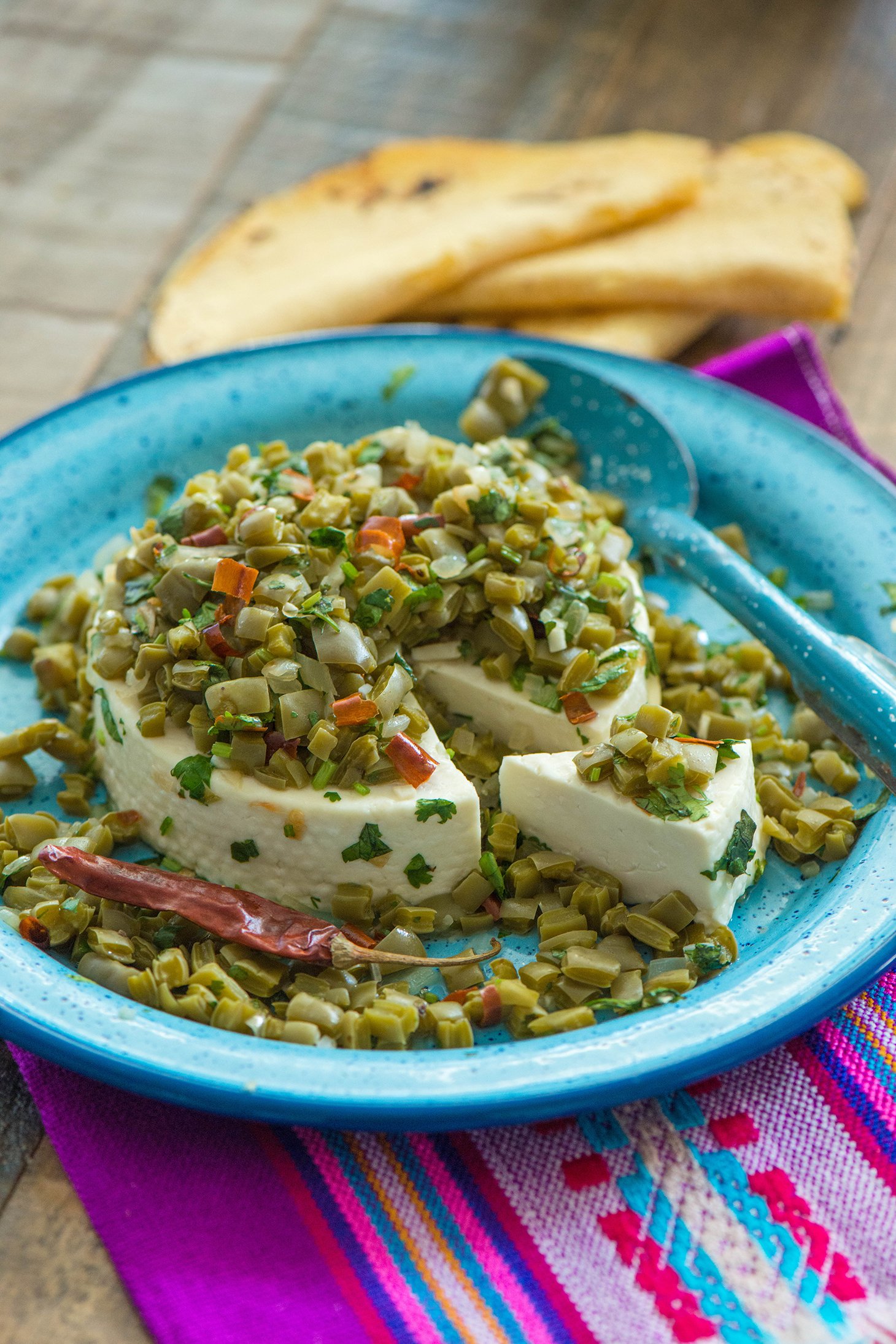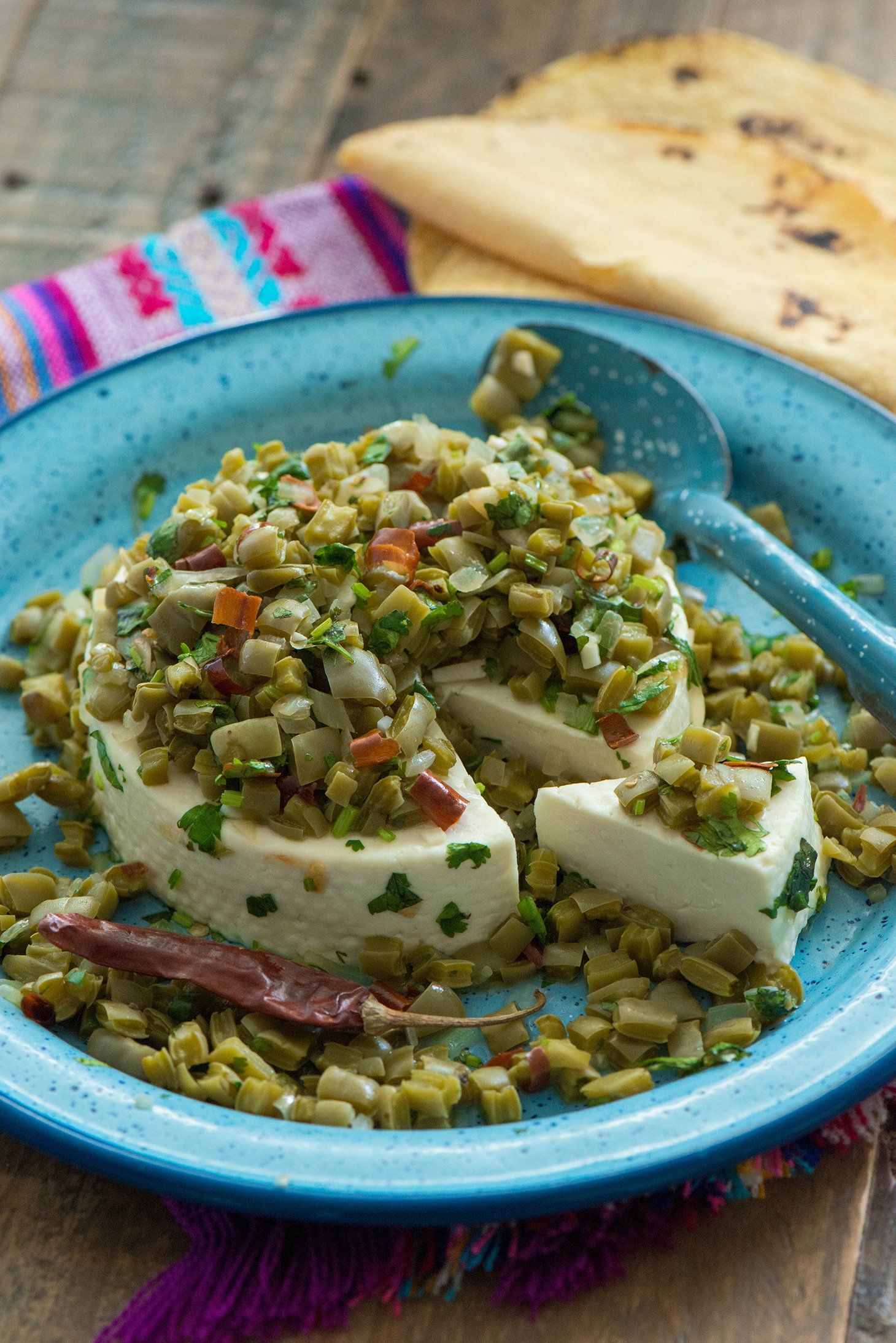 - Place panela cheese on a small ovenproof dish; Spoon cactus mixture over cheese. Bake for 15 minutes or until cheese is soft. Serve with corn tortillas or tostadas.